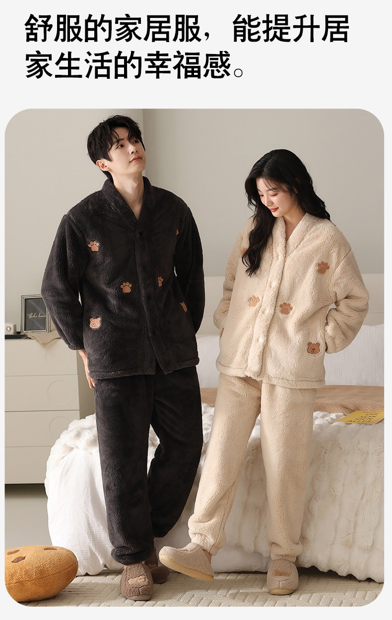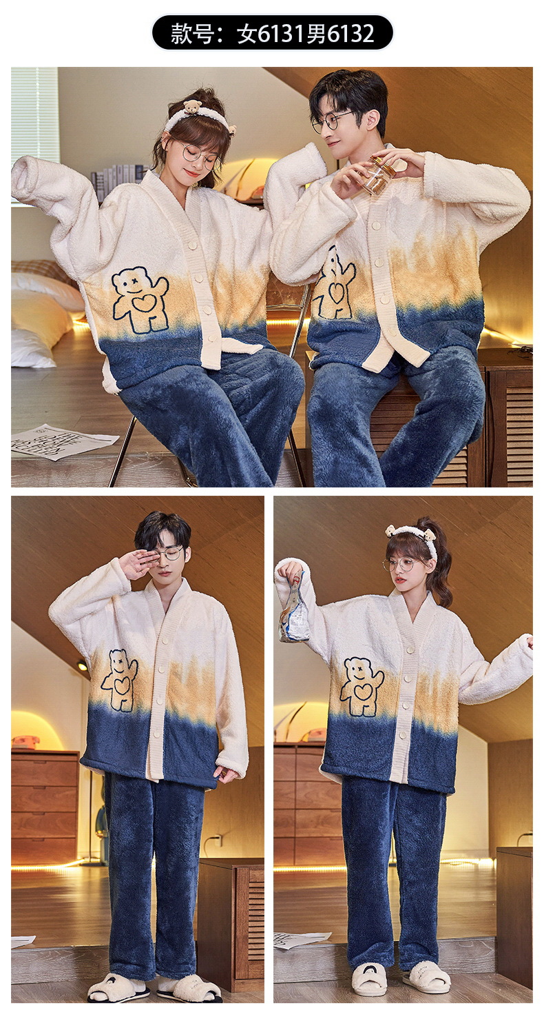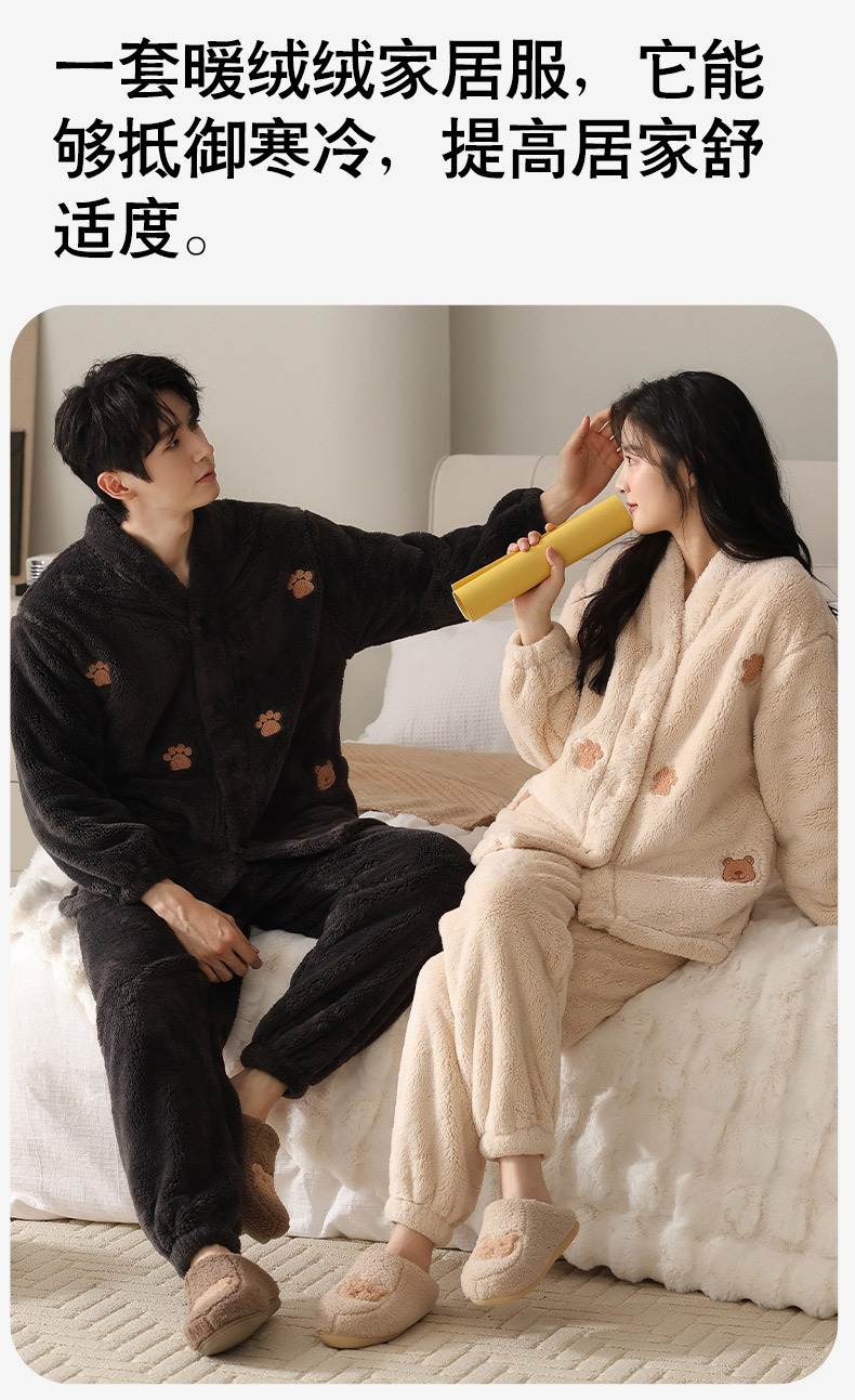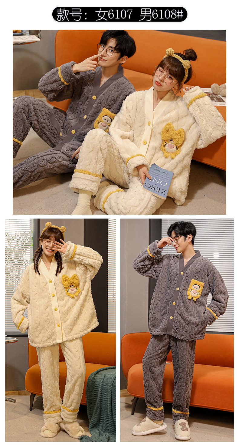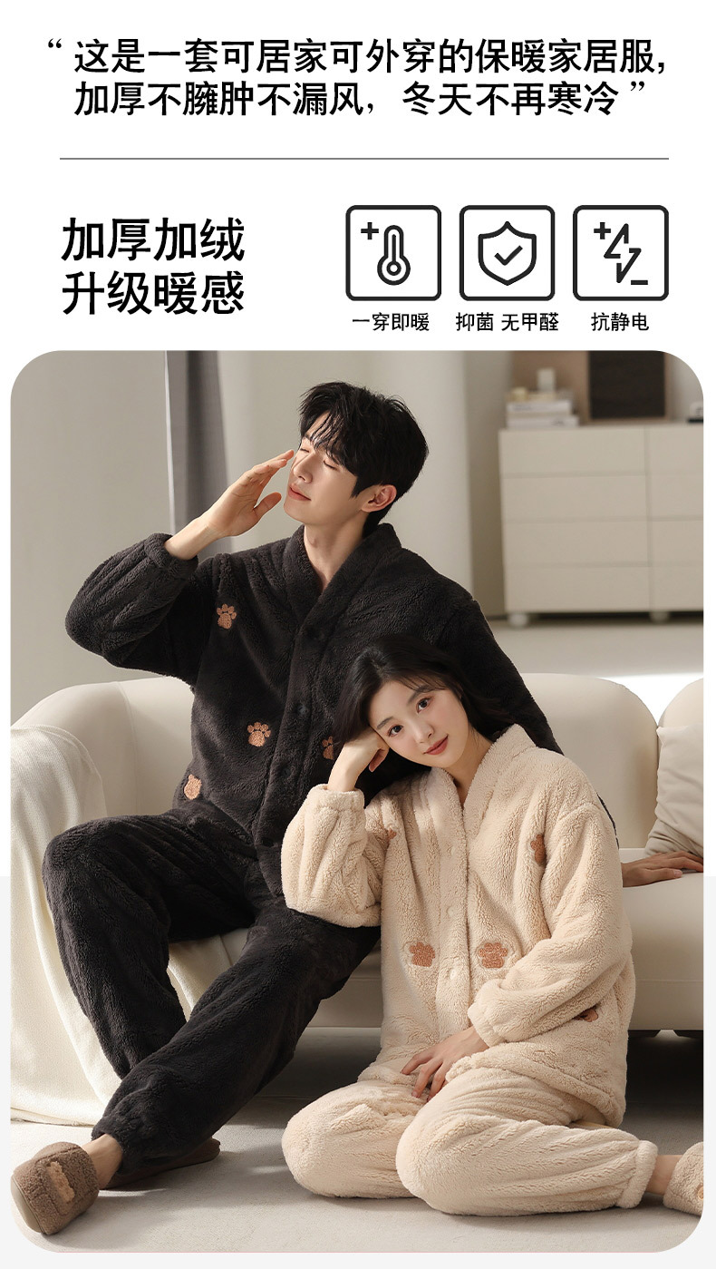 丁摩 情侣睡衣秋冬季珊瑚绒男女加绒加厚法兰绒冬款开衫家居服套装5ZF-61083