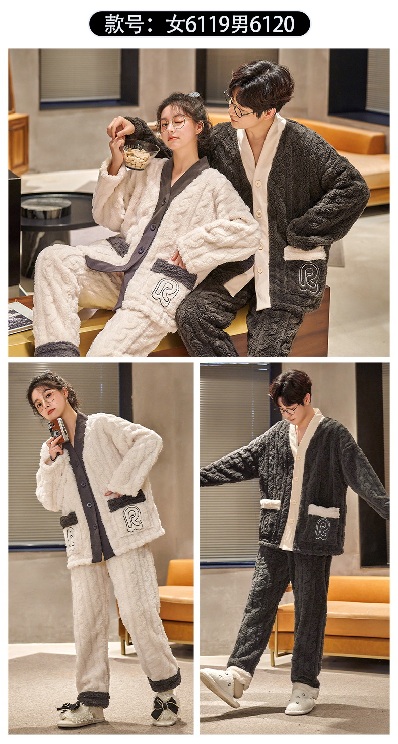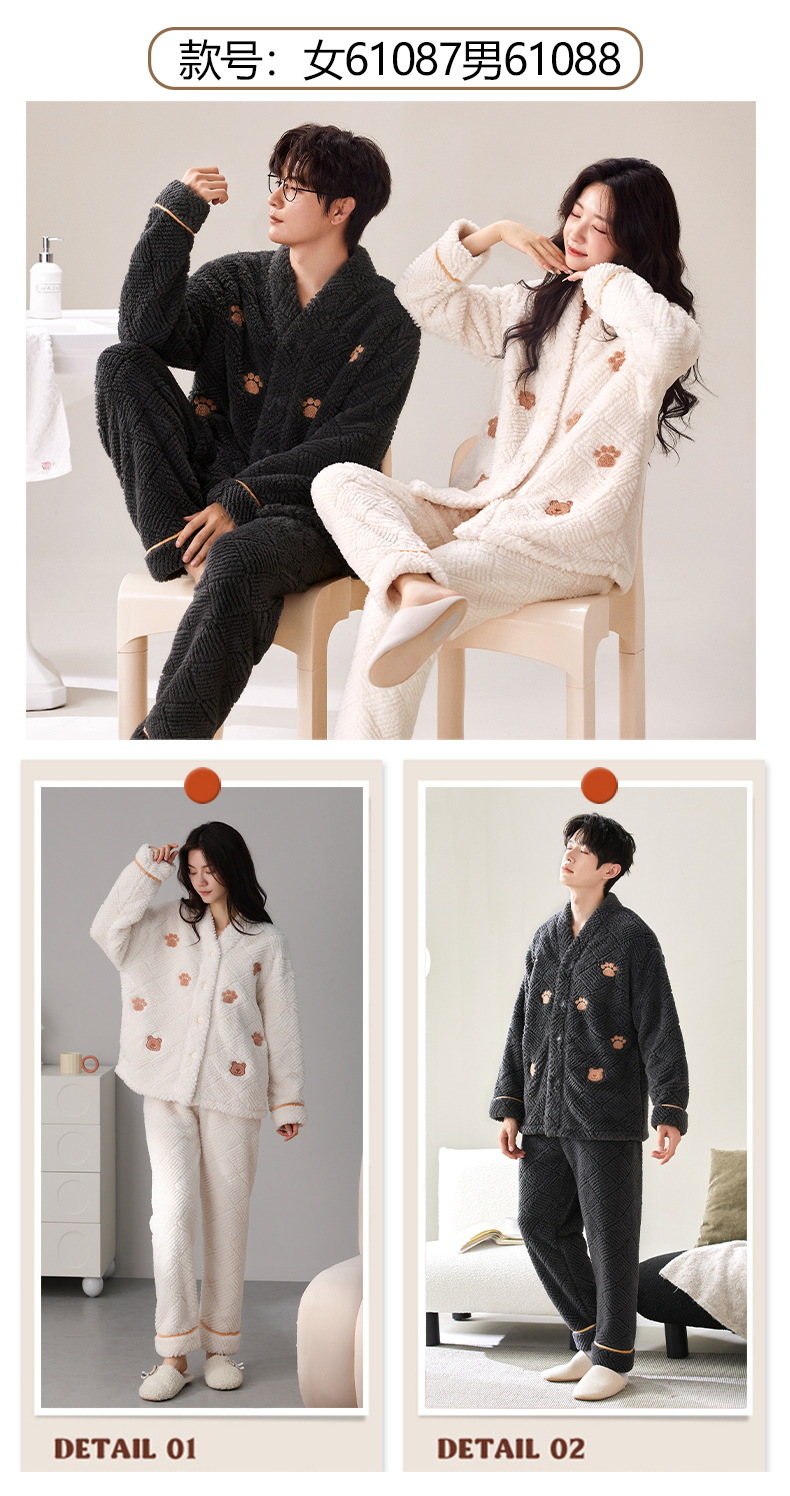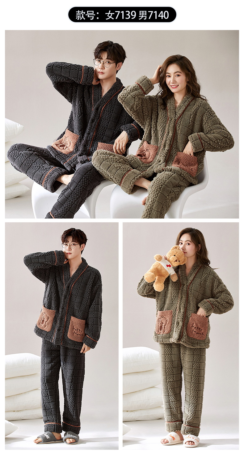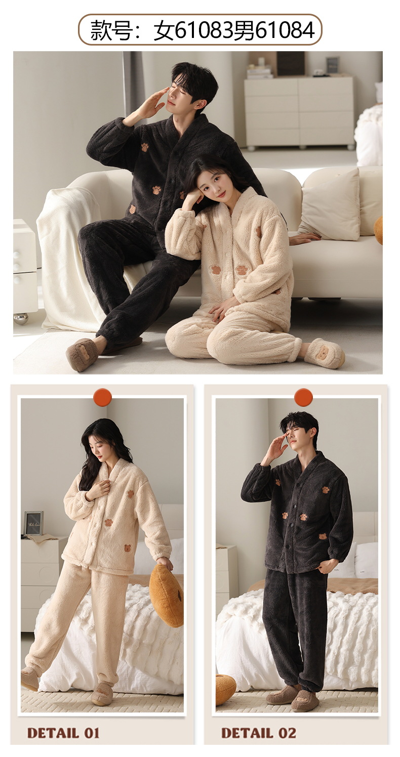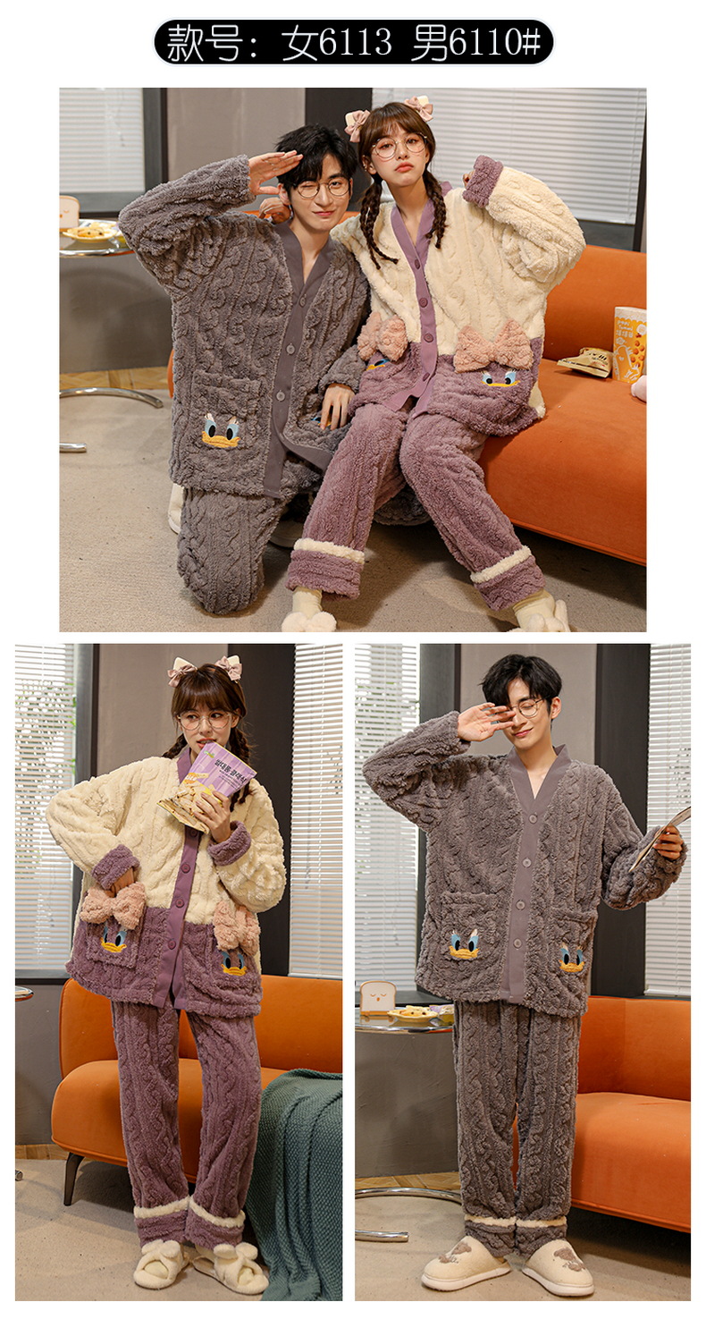 丁摩 情侣睡衣秋冬季珊瑚绒男女加绒加厚法兰绒冬款开衫家居服套装5ZF-61083