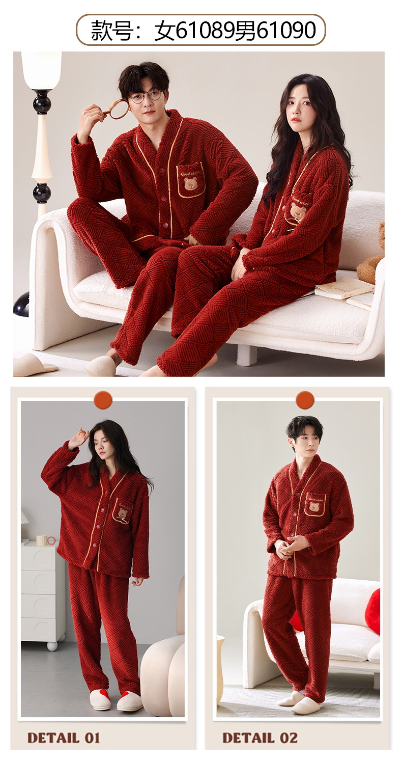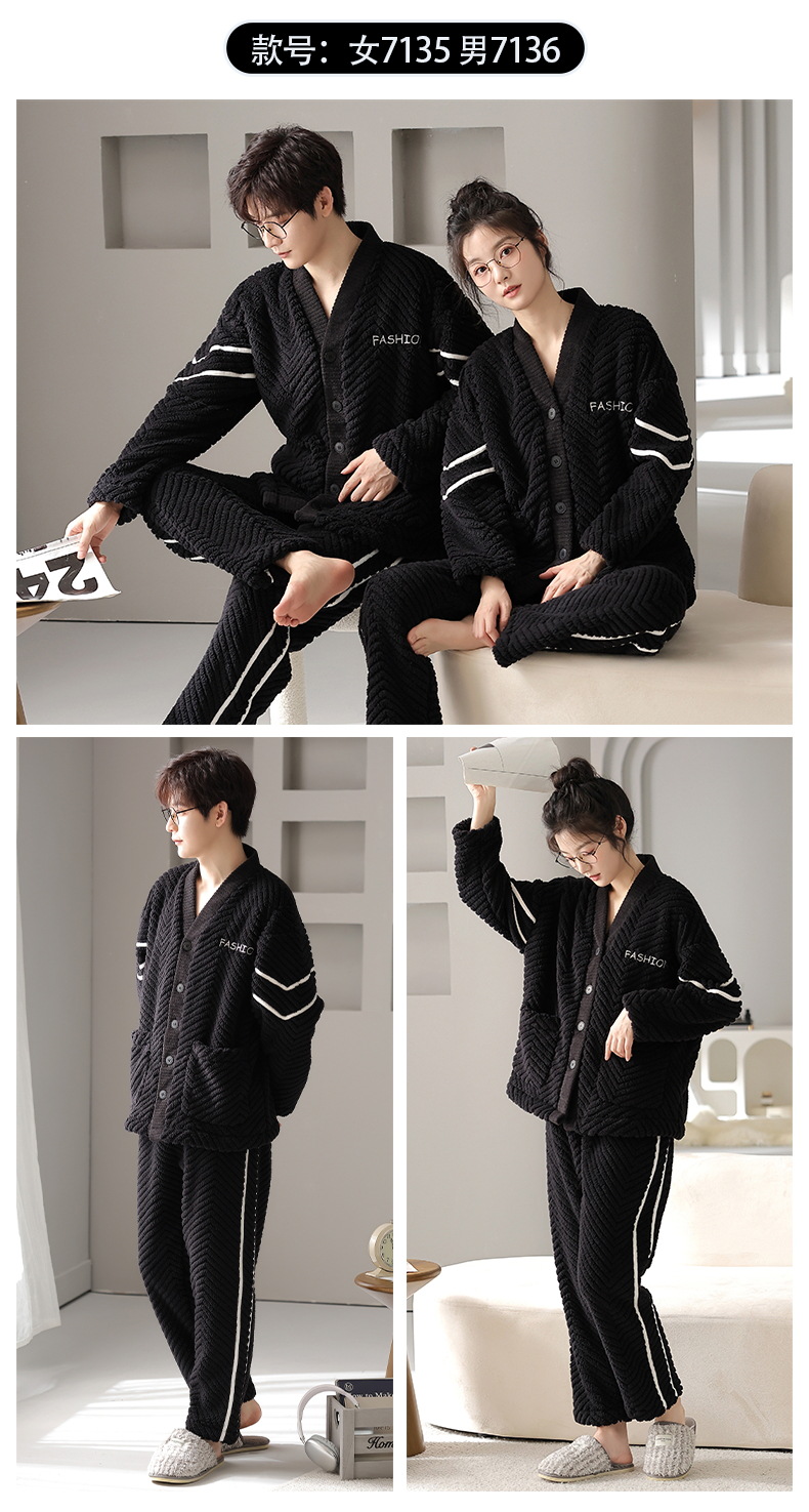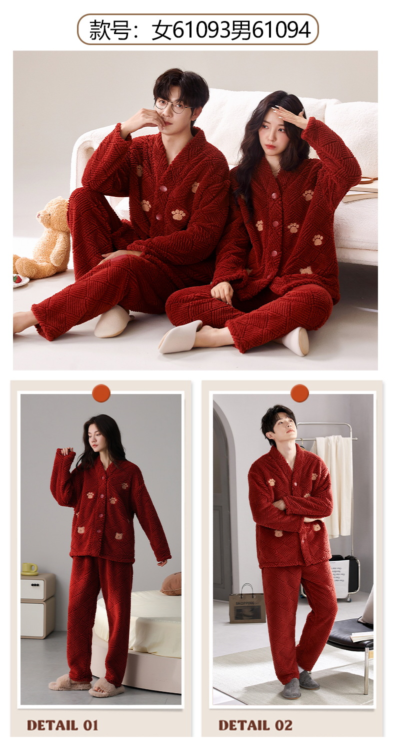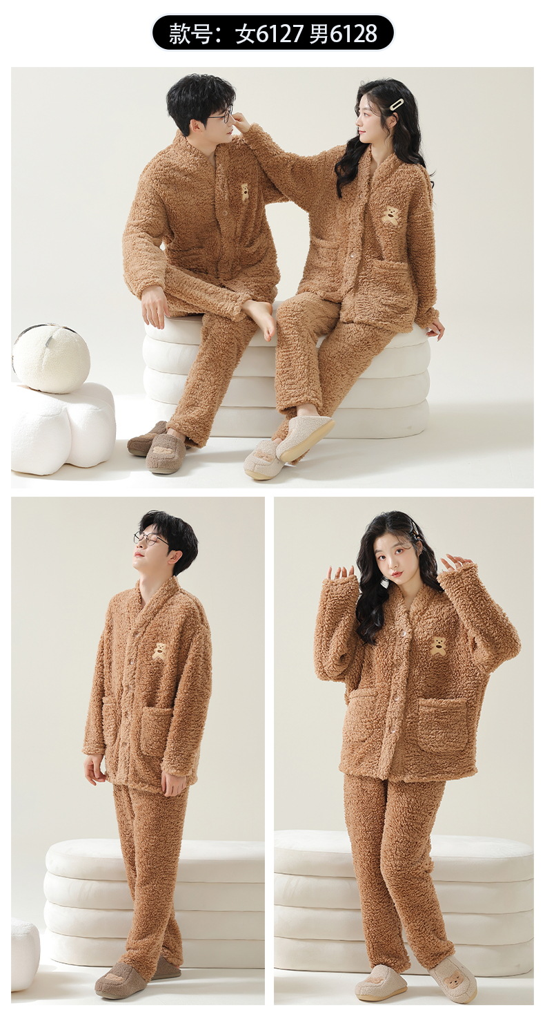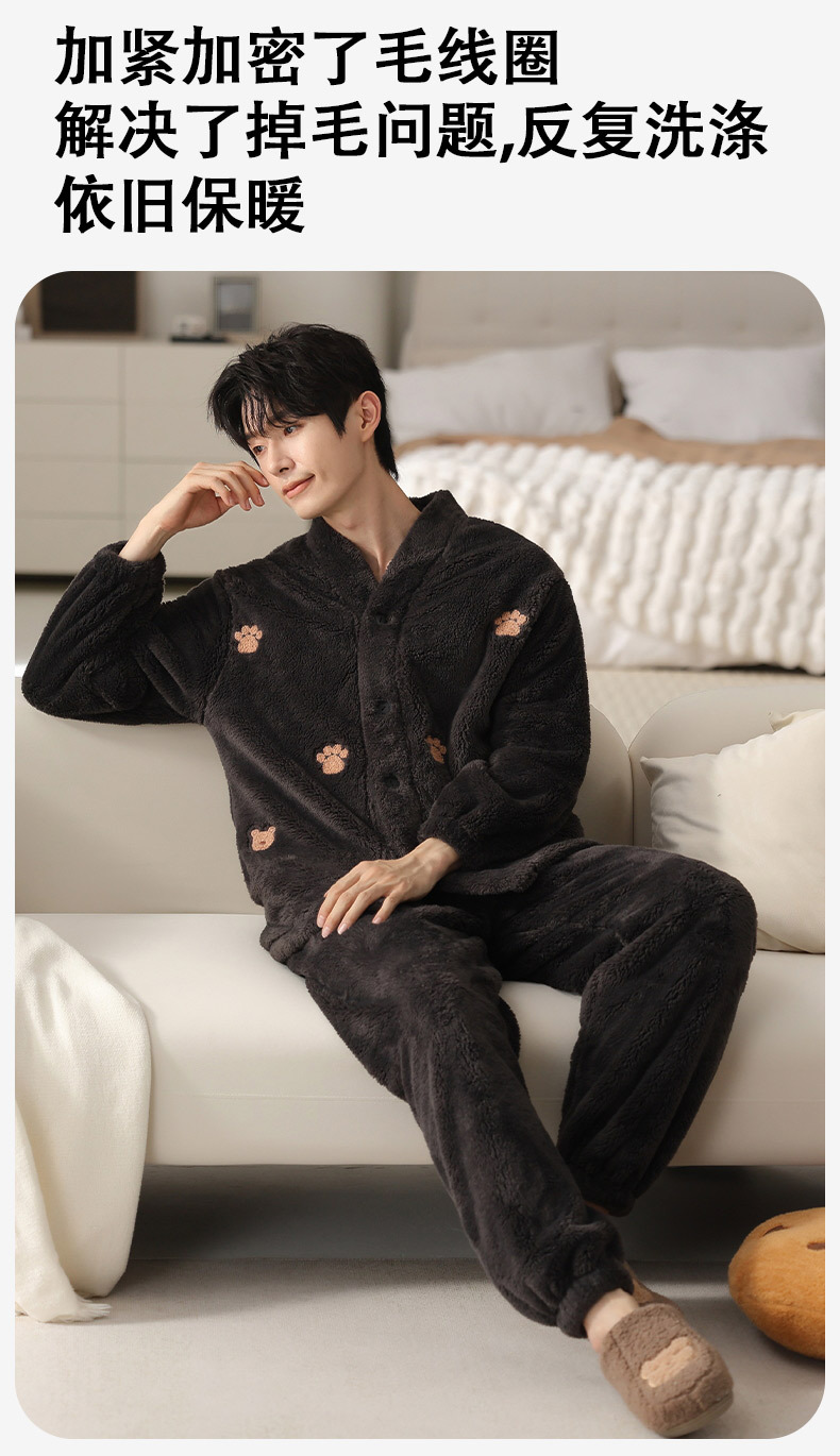 丁摩 情侣睡衣秋冬季珊瑚绒男女加绒加厚法兰绒冬款开衫家居服套装5ZF-61083