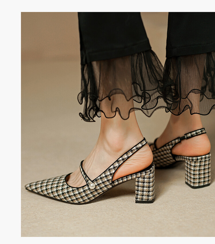 千鸟格子纹包头后空单鞋,复古法式粗跟高跟鞋PS805