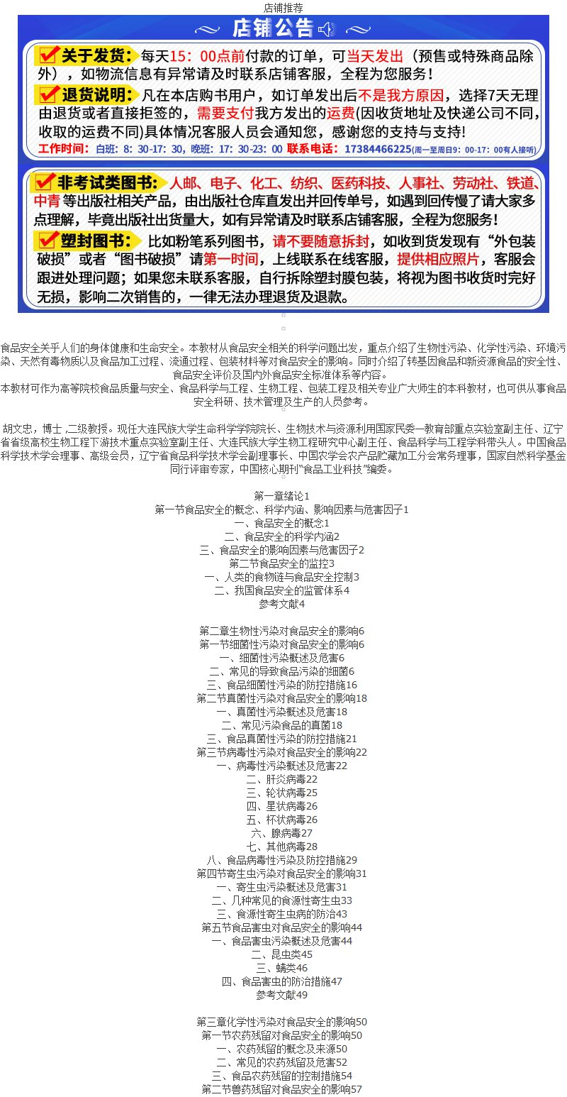 食品安全学 胡文忠 转基因新资源食品安全性 生物化学环境污染对食品安全影响 高等院校食品质量与安全 食品科学与工程等专业教材 化学工业出版社 9787122399007