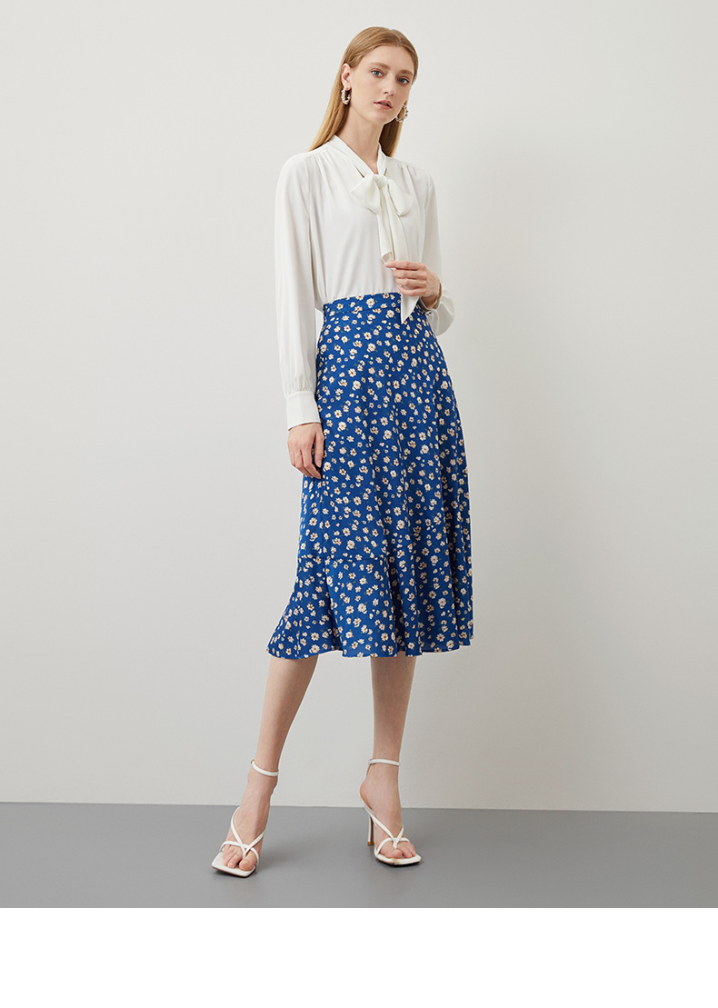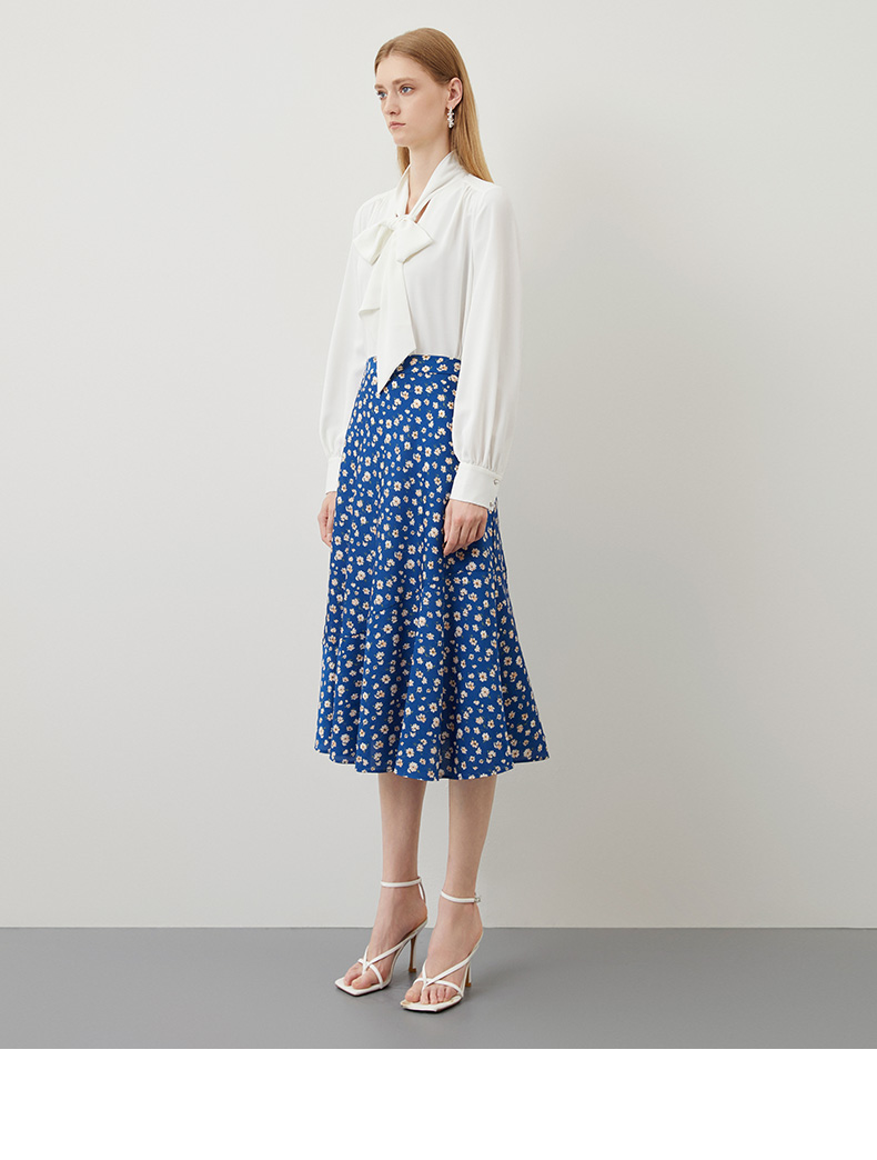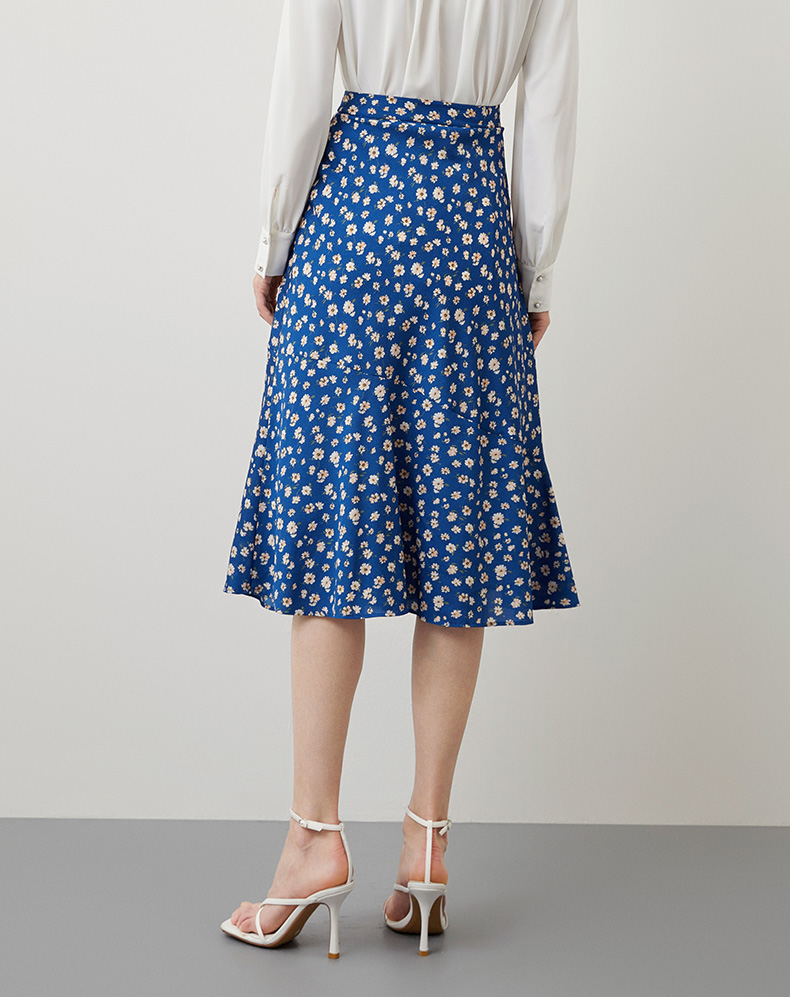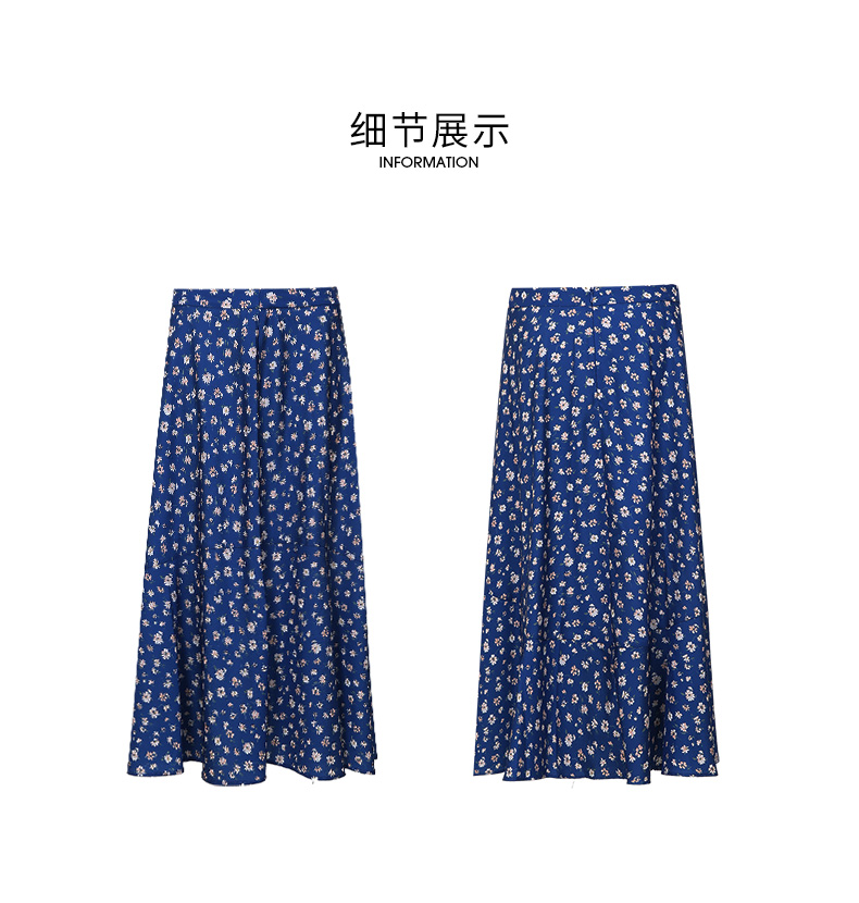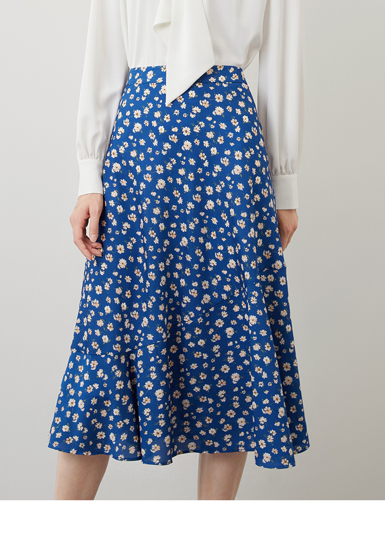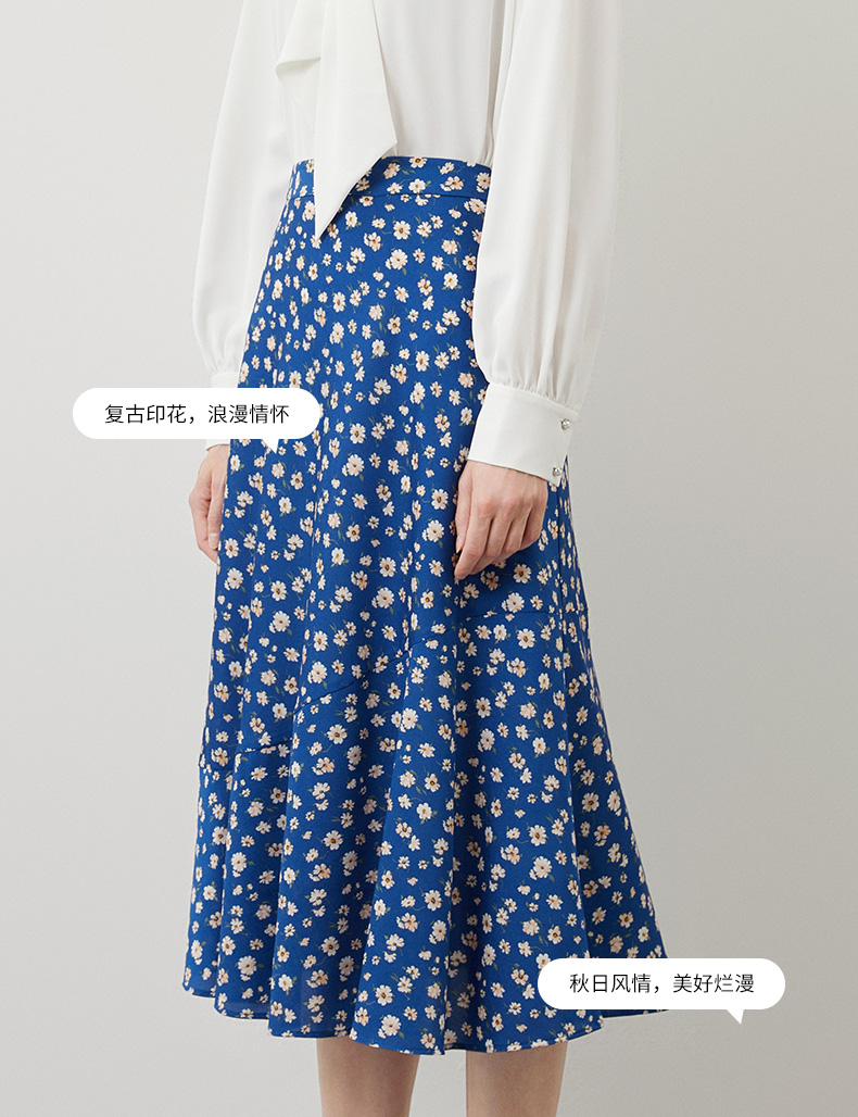 EITIE爱特爱秋季新款气质复古蓝色底调碎花A字高腰显瘦半身裙C2206012