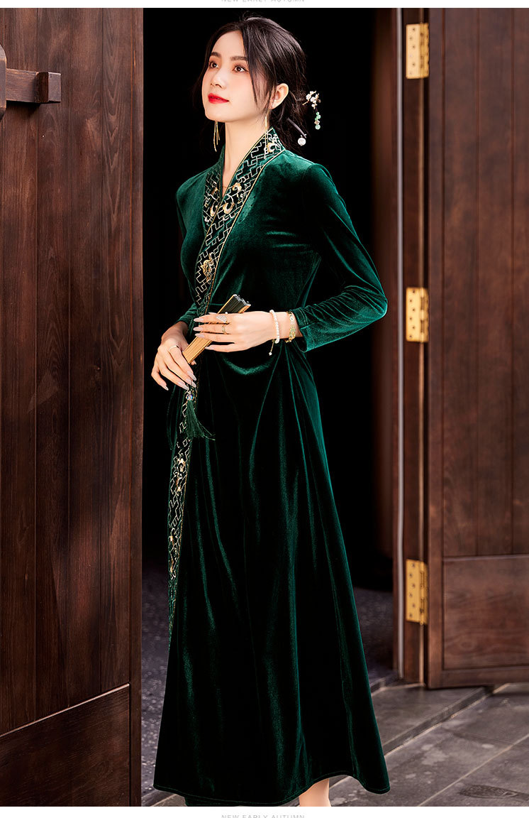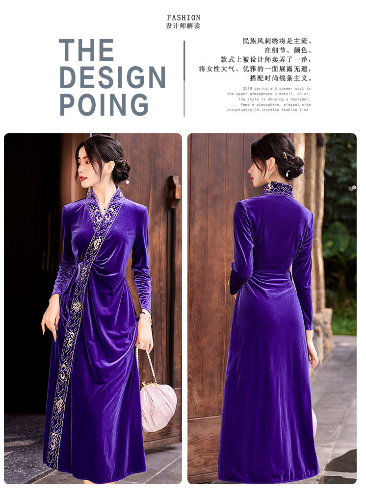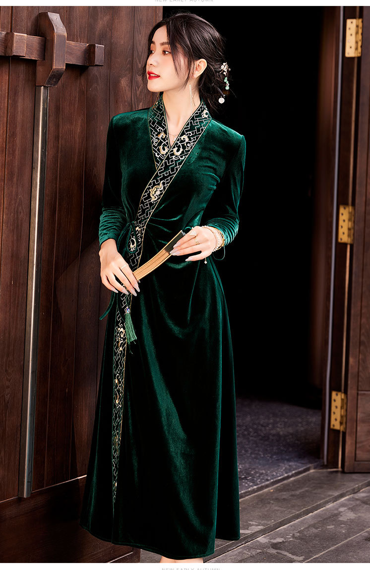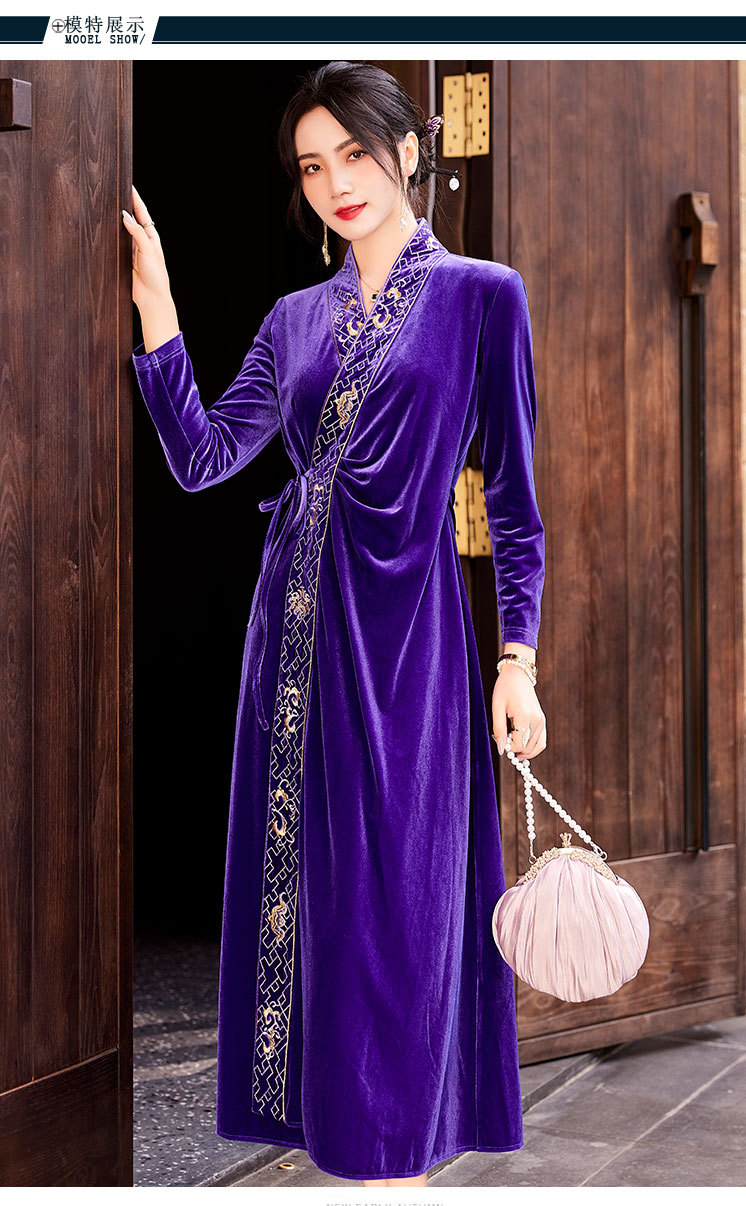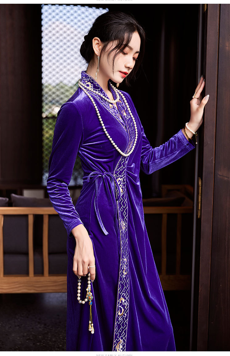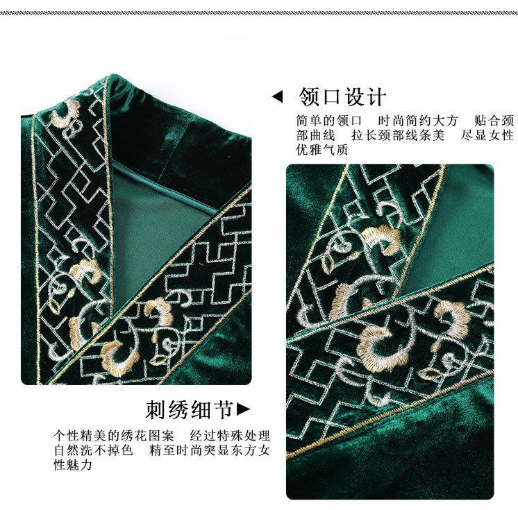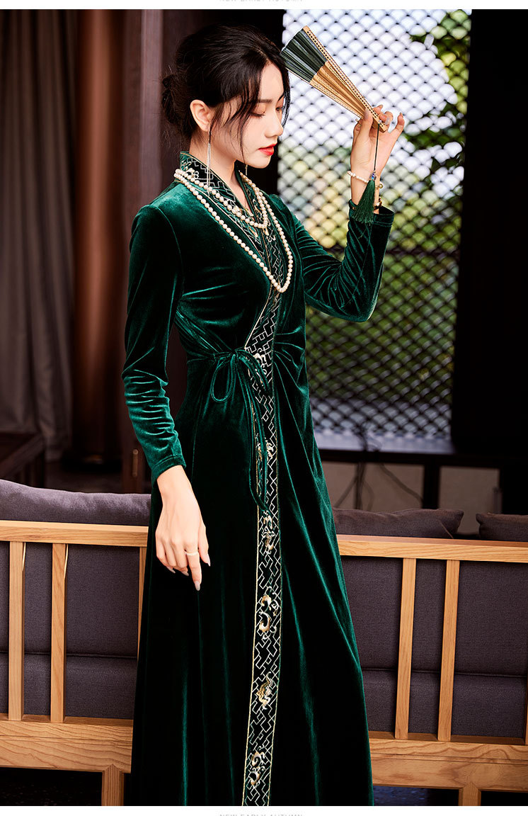 中国风复古刺绣汉服裙,V领系带丝绒旗袍禅服中式连衣裙OG-A9110