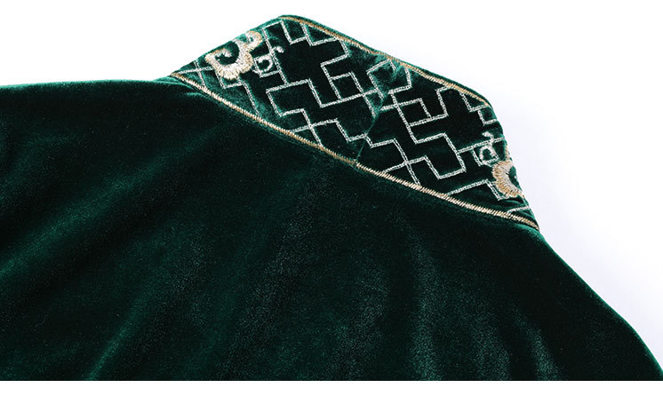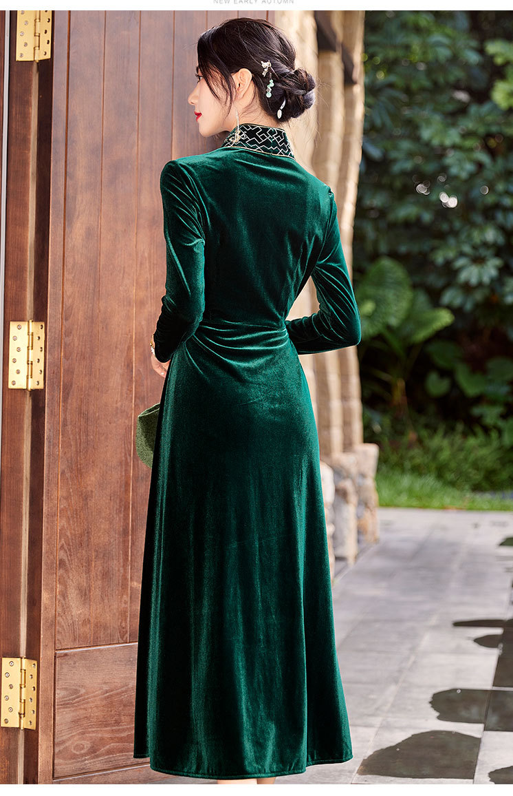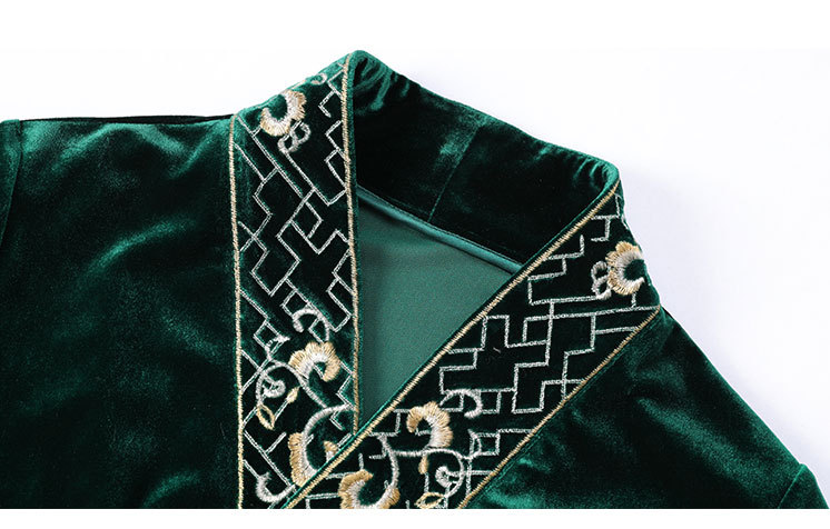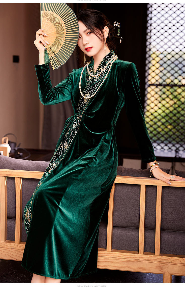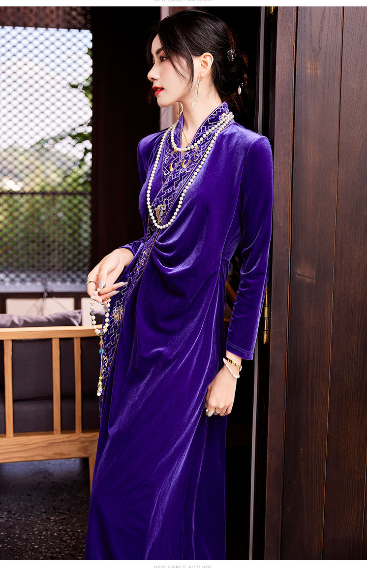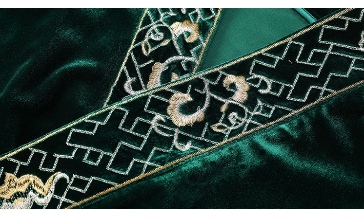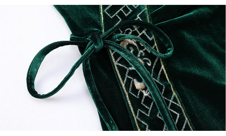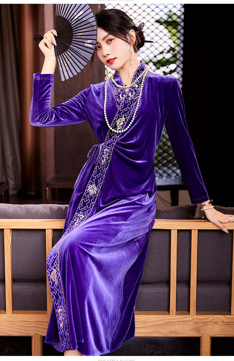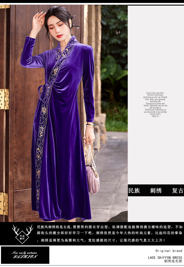 中国风复古刺绣汉服裙,V领系带丝绒旗袍禅服中式连衣裙OG-A9110