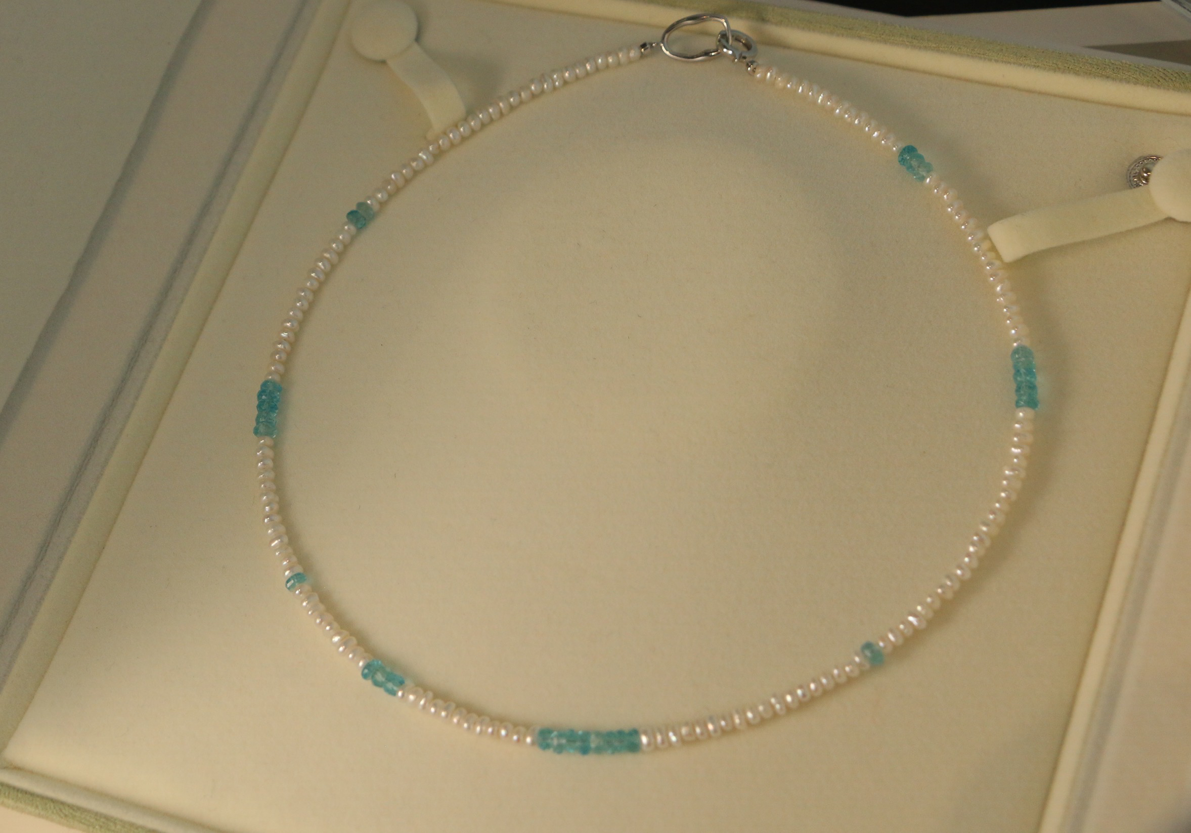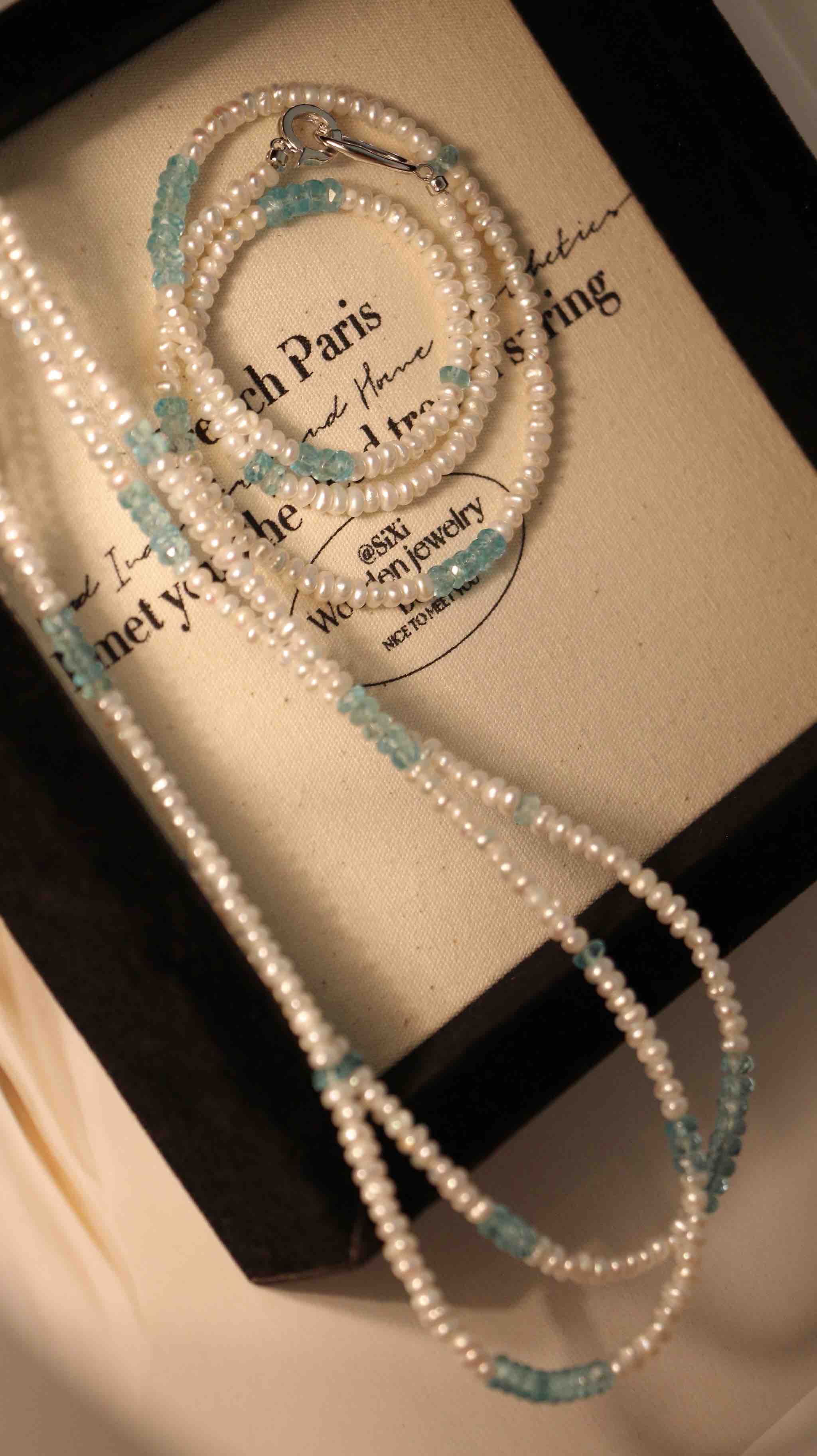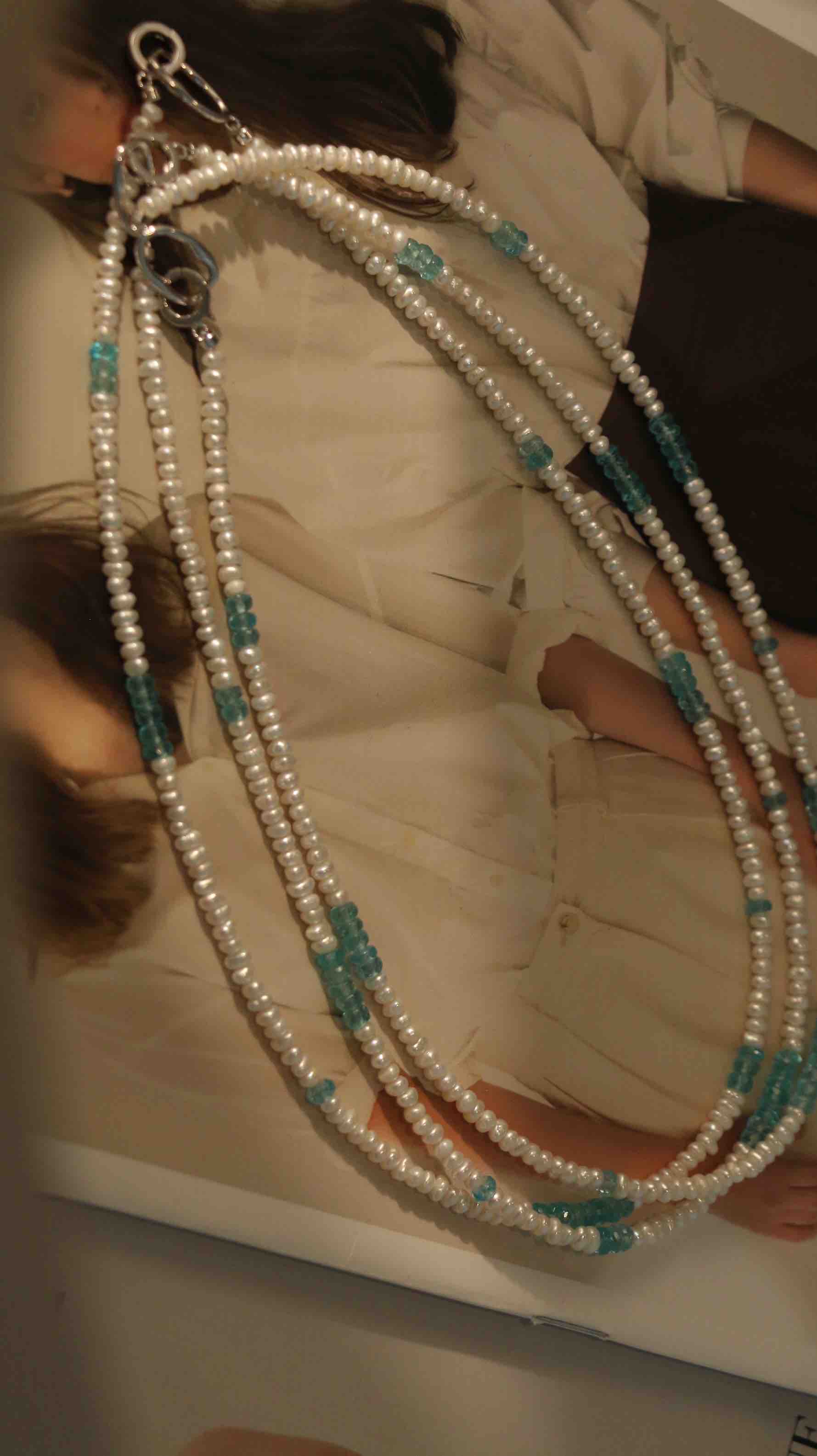 【喜欢特别风格的姐妹,约】帕拉伊巴色系磷灰石小石头,配了很特别形状的小石头无核天然珍珠项链,好看的很。4-5mm左右。