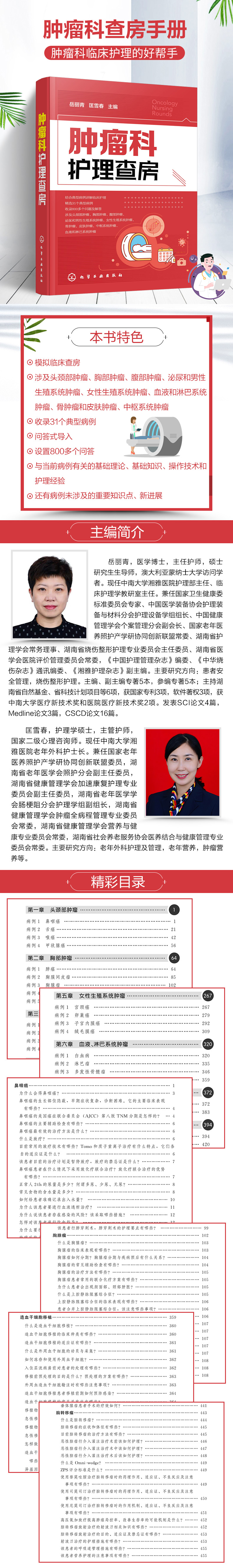 本书收录头颈部肿瘤、胸部肿瘤、腹部肿瘤、泌尿和男性生殖系统肿瘤、女性生殖系统肿瘤、血液和淋巴系统肿瘤、骨肿瘤和皮肤肿瘤、中枢系统肿瘤,共八章三十余个病例,突出肿瘤科临床护理查房实践中的重点知识和逻辑思维,以肿瘤科临床护理需要为内容取舍标准,对典型个案的护理原理、护理措施和技能操作充分阐述,并广泛涉猎肿瘤诊治的新研究进展、新近分期和循证医学证据,包括PD-1、PD-L1抑制剂等免疫治疗。本书图文并茂,贴近临床实际,适合各级护士,尤其是肿瘤科护士、护理实习生阅读参考。