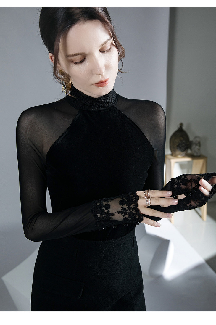 洋气欧货网纱微透拼接黑色上衣,丝绒秋冬新款内搭打底衫XD-F20223986