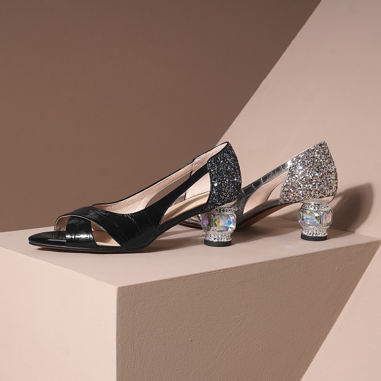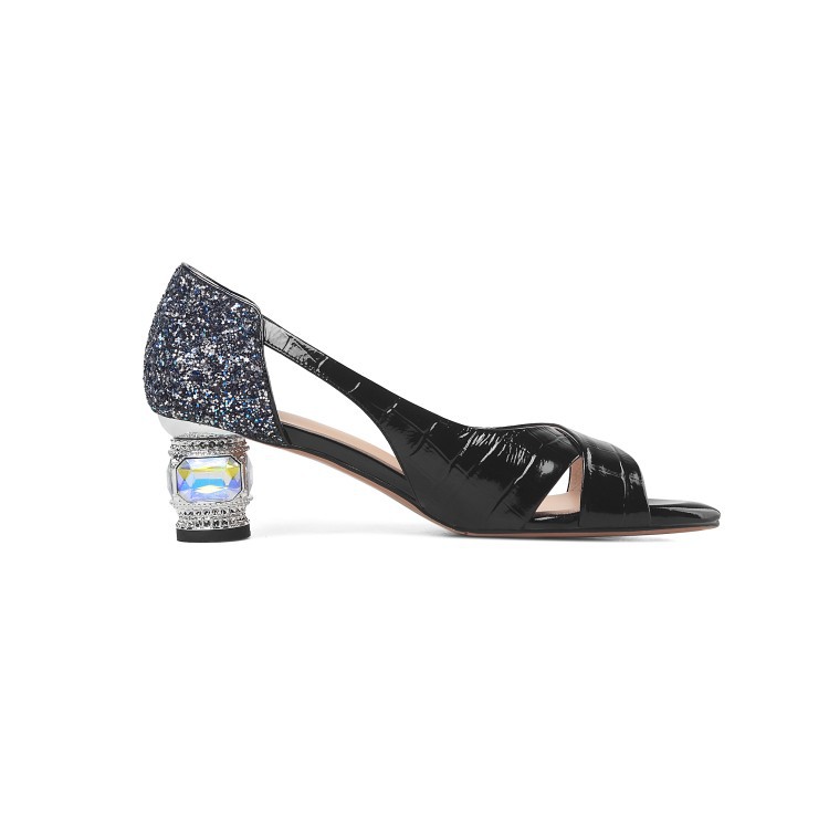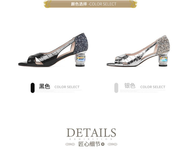 MJM-954新款尖头高跟鞋百搭拼色露趾水钻中跟女凉鞋