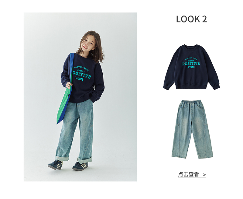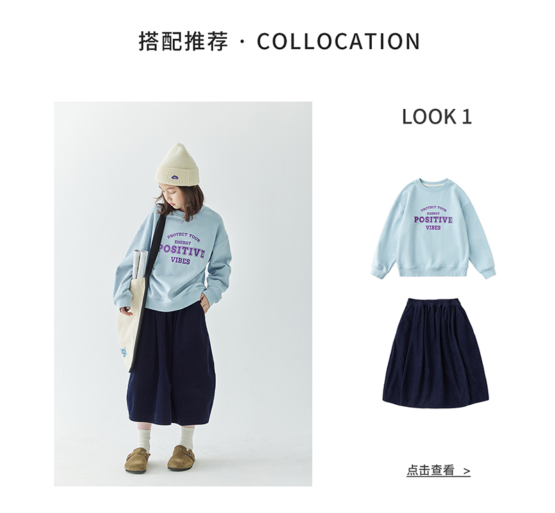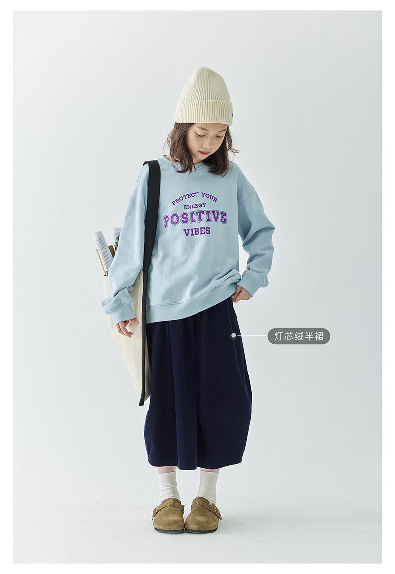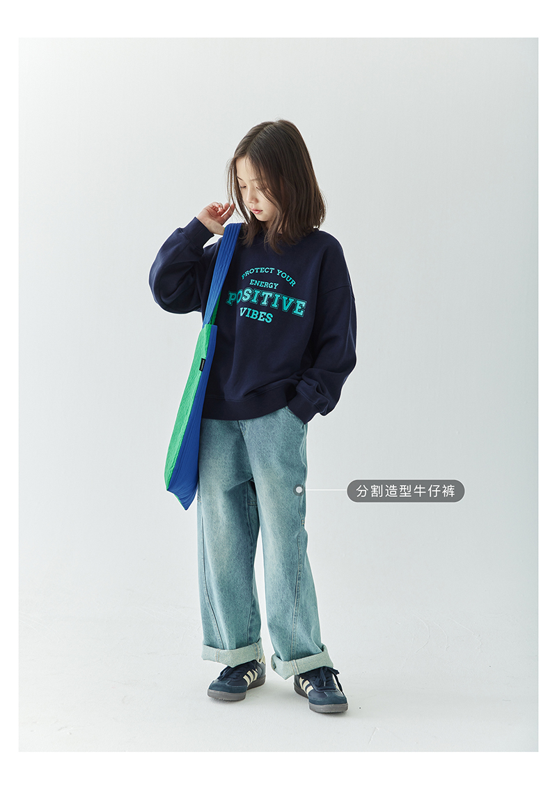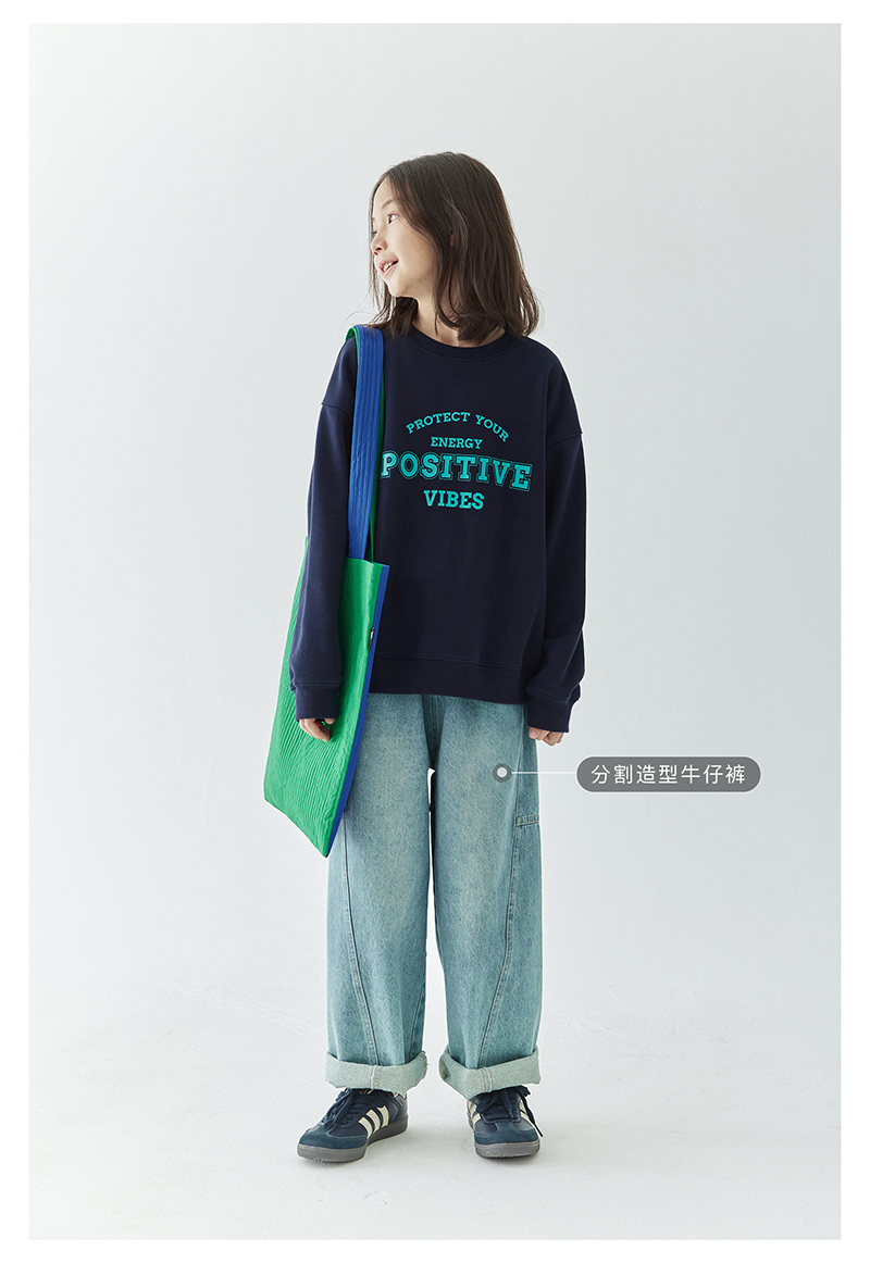 蓝色预售4.22发 棵初新品秋季童装圆领字母印花卫衣美式复古风简约百搭上衣