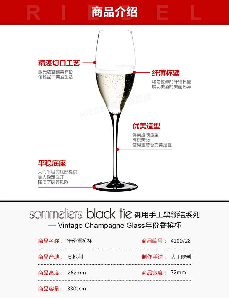 奥地利RIEDEL Sommeliers Black Tie Vintage Champagne Glass 侍酒师--黑领结系列 特优年份香槟杯 无铅水晶 奥地利进口 单支装