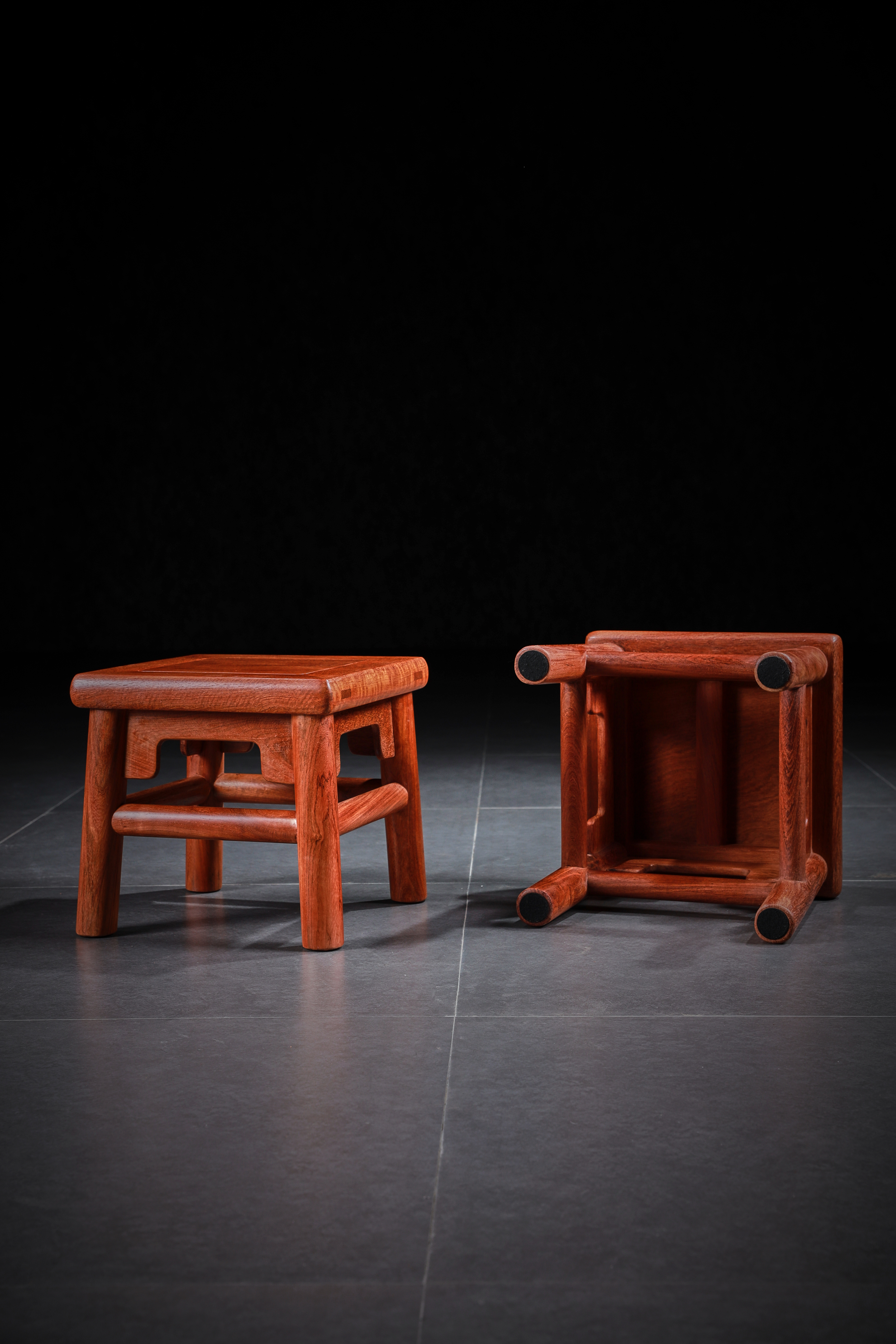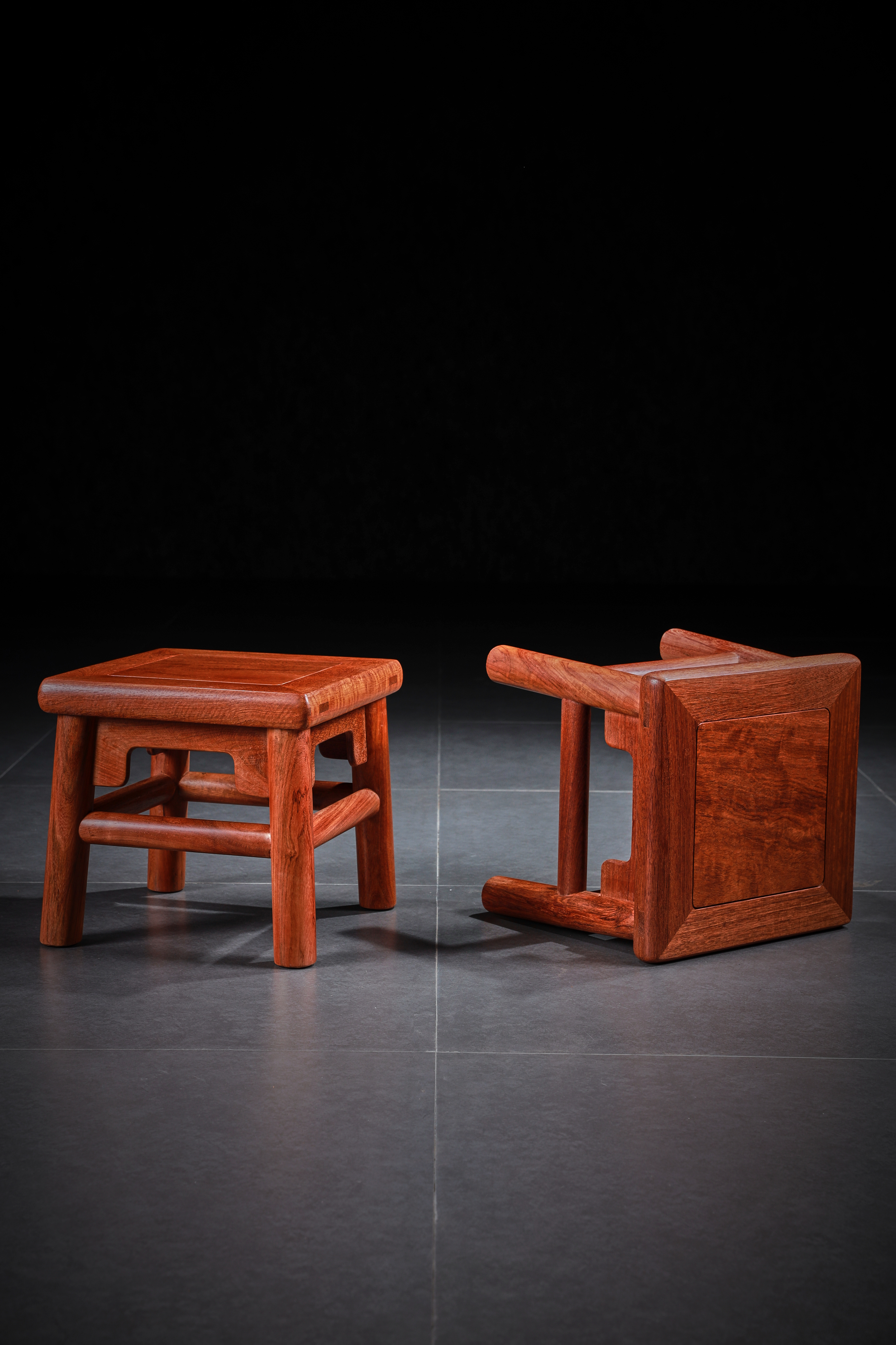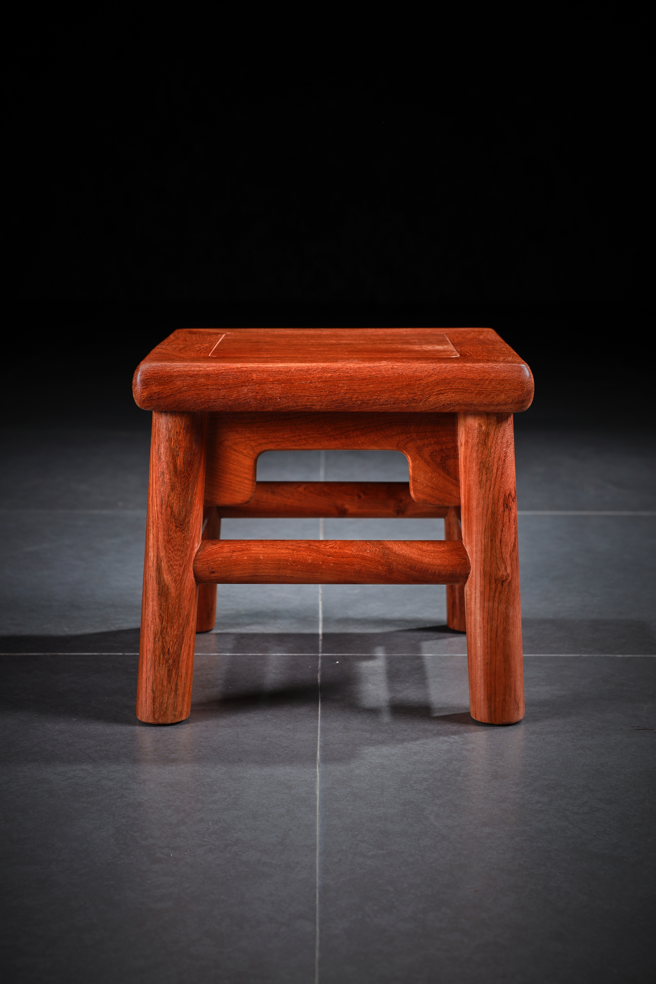 此凳原型来自王世襄先生所藏无束腰直足直枨小方凳,又名“富贵凳”。在《明式家具珍赏》《明式家具研究》中有其记载,原型现收藏于上海博物馆。此凳形制较小,胜于造法严谨而不刻板,形制方正而不失灵动,自有一番行云流水般的流畅气象,静静欣赏令人有心旷神怡之感。