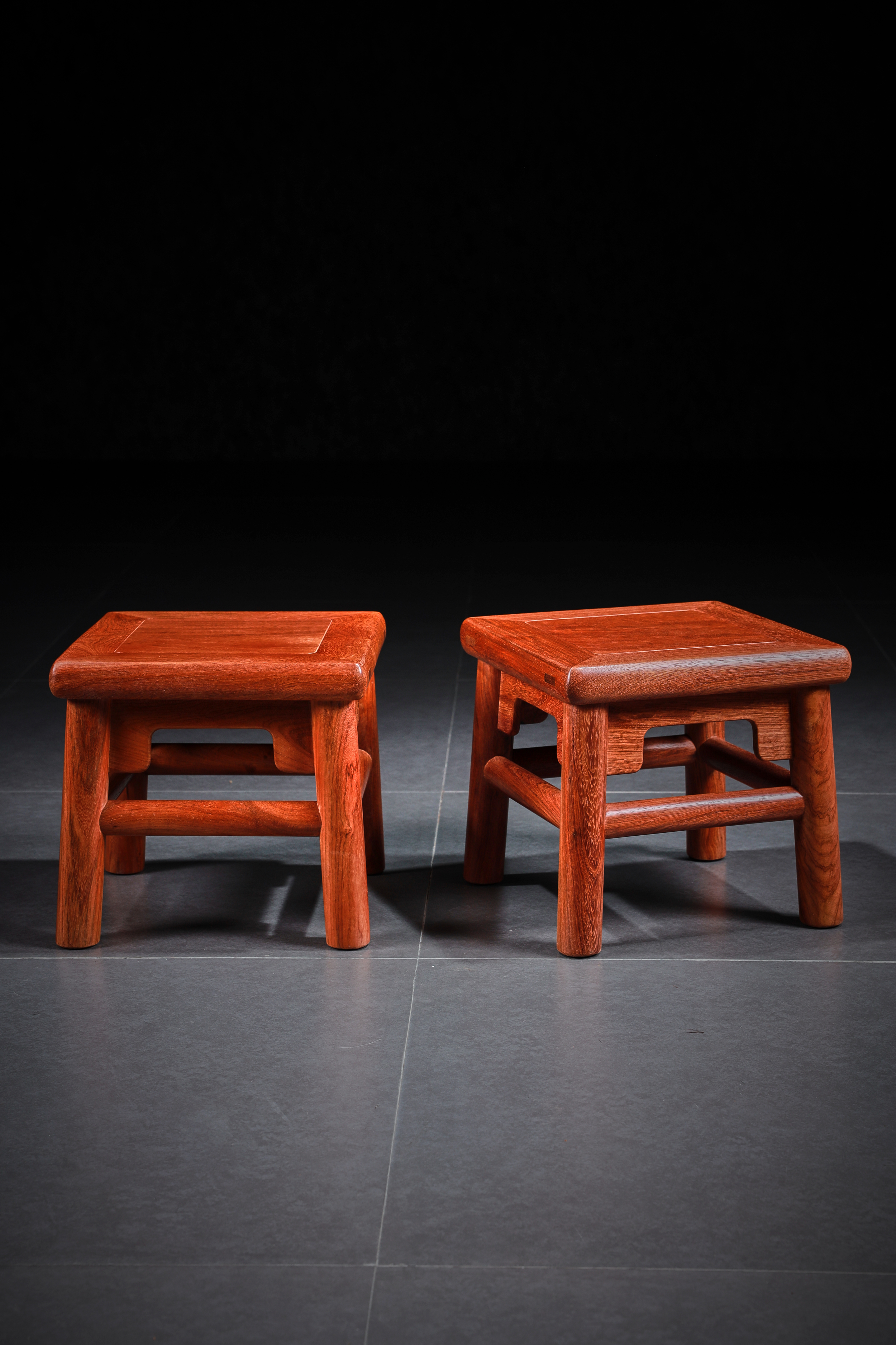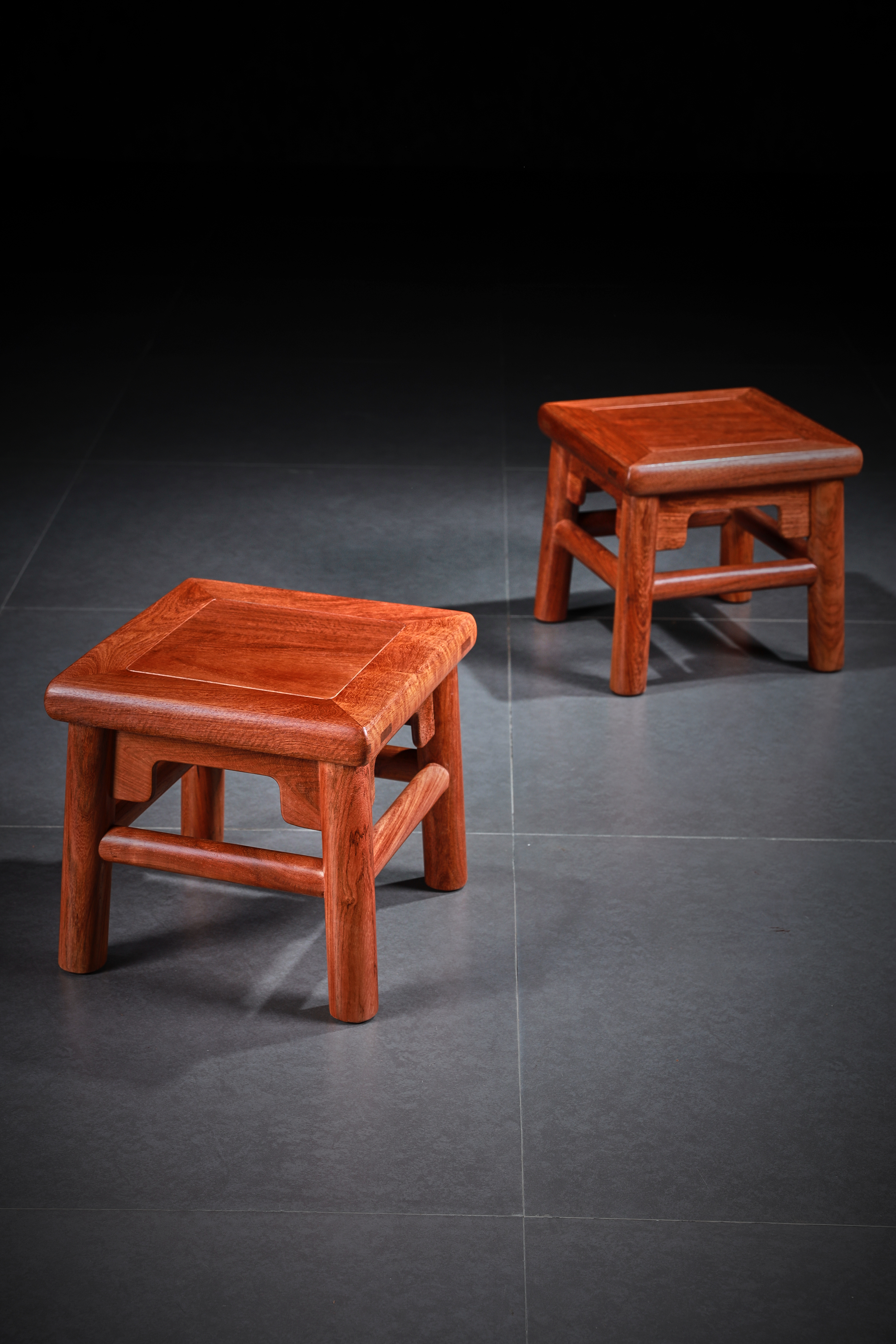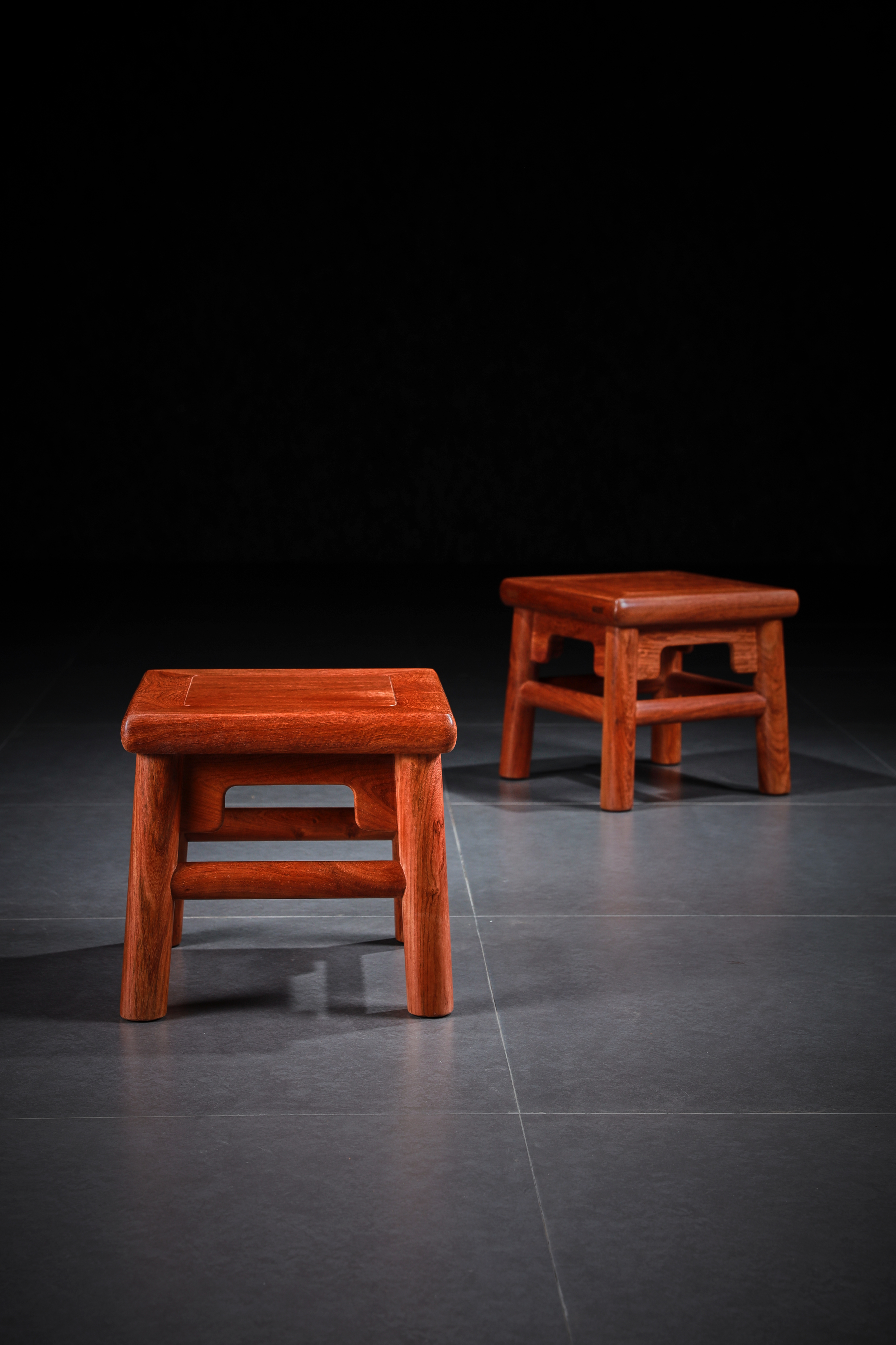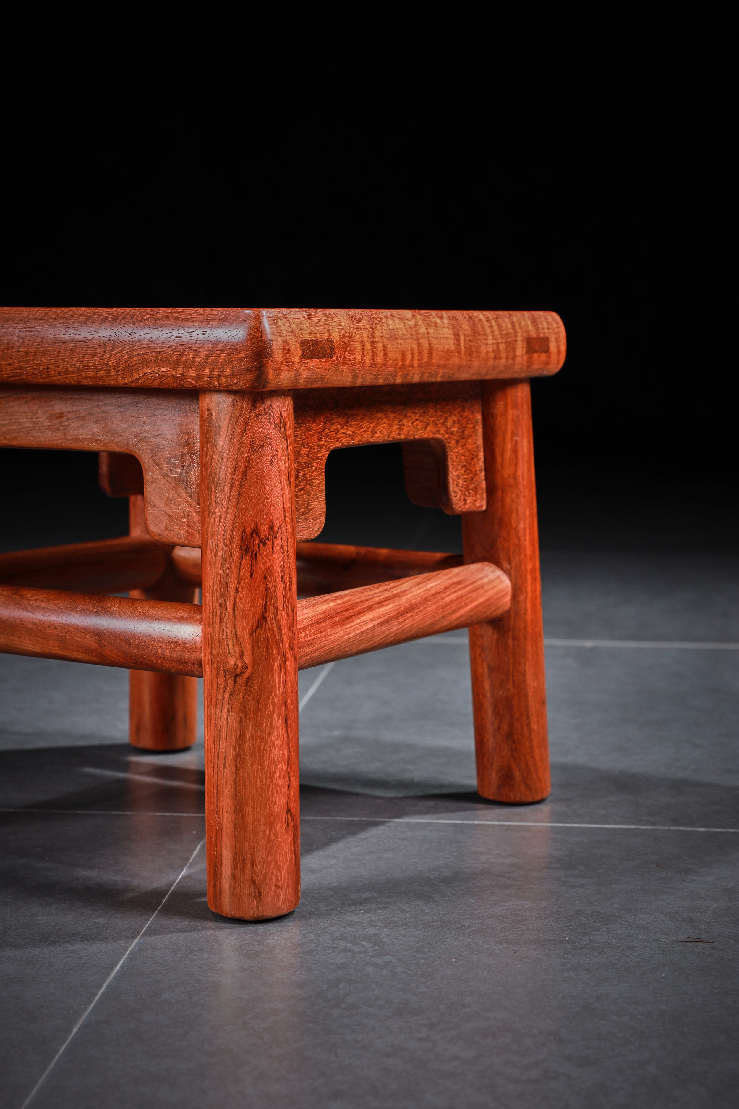 此凳原型来自王世襄先生所藏无束腰直足直枨小方凳,又名“富贵凳”。在《明式家具珍赏》《明式家具研究》中有其记载,原型现收藏于上海博物馆。此凳形制较小,胜于造法严谨而不刻板,形制方正而不失灵动,自有一番行云流水般的流畅气象,静静欣赏令人有心旷神怡之感。