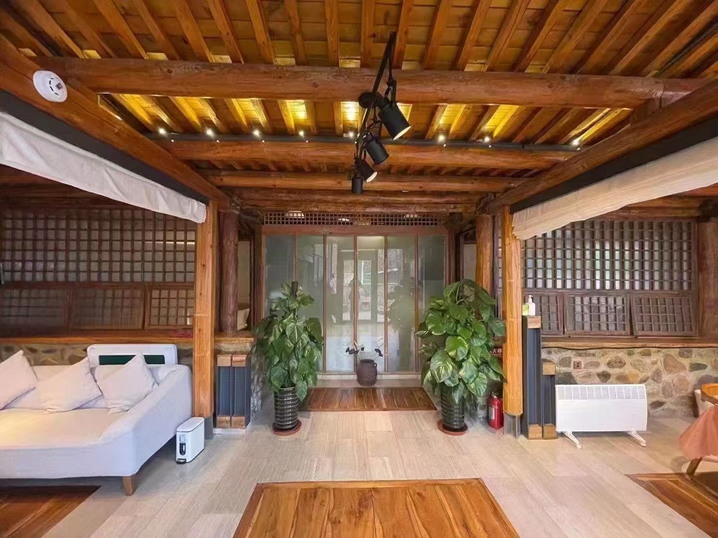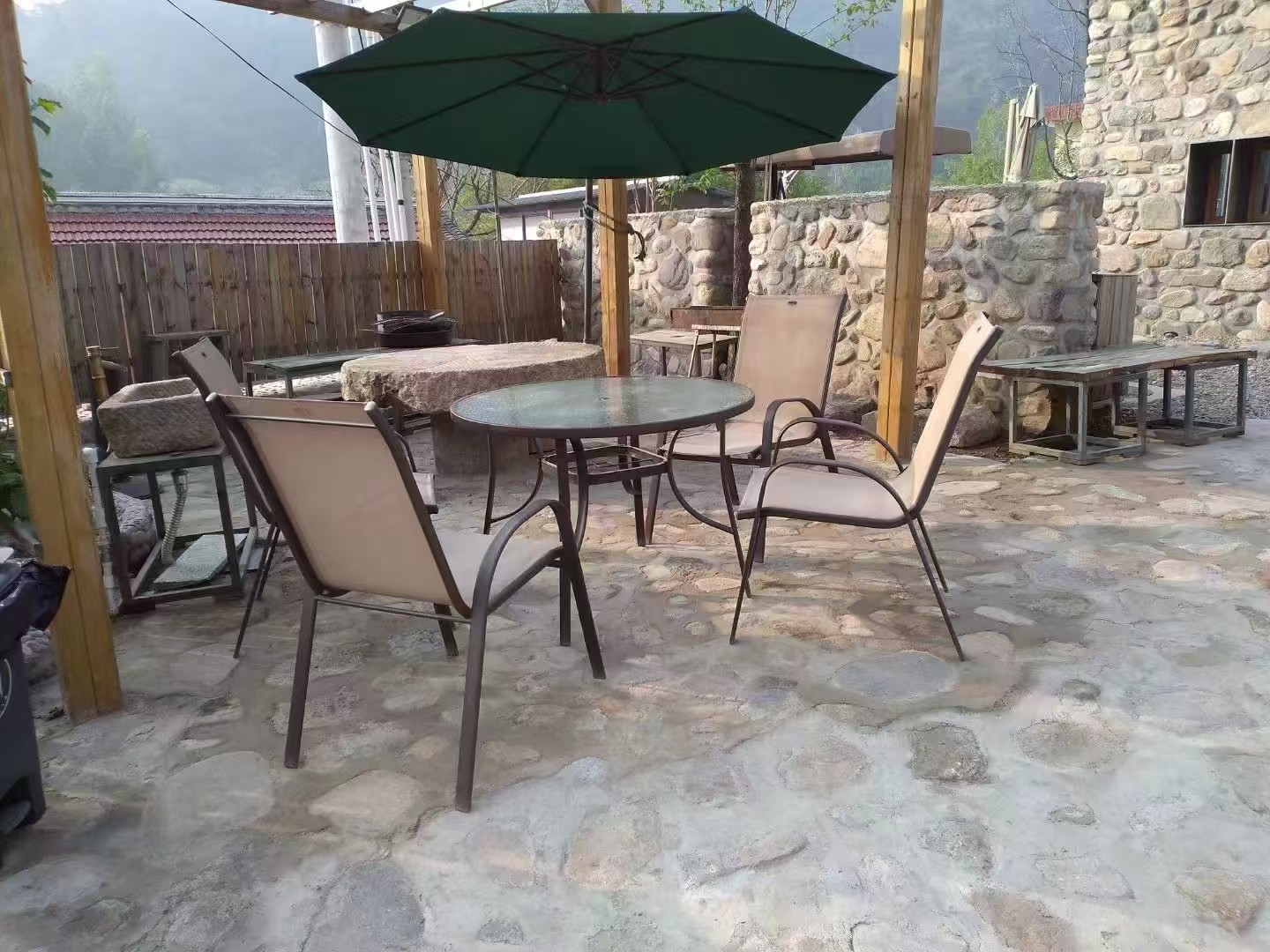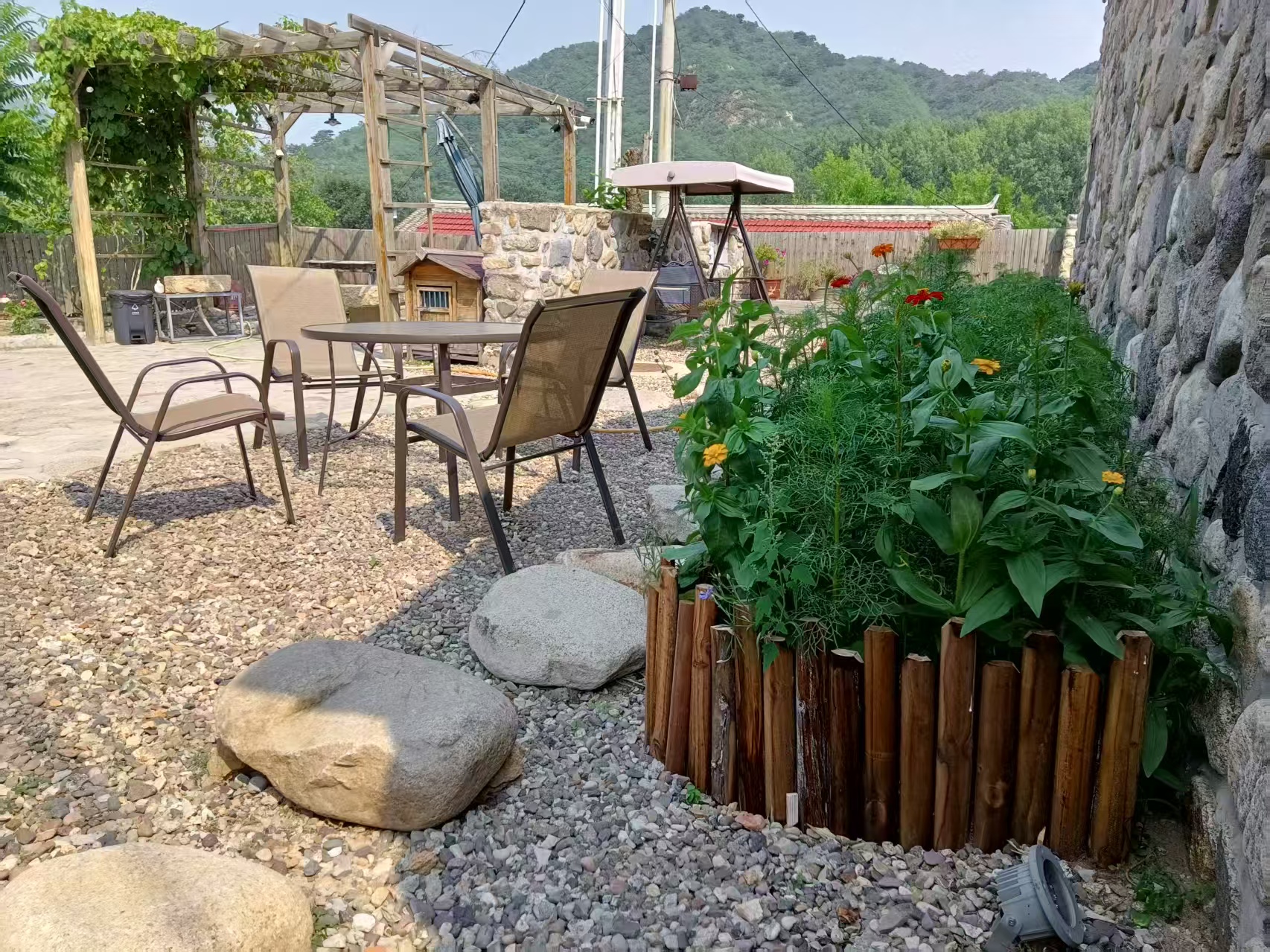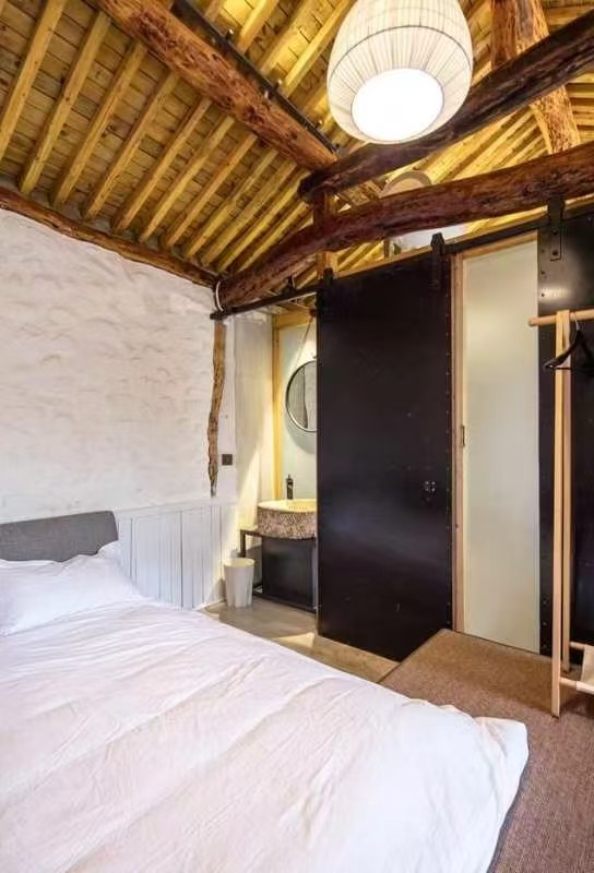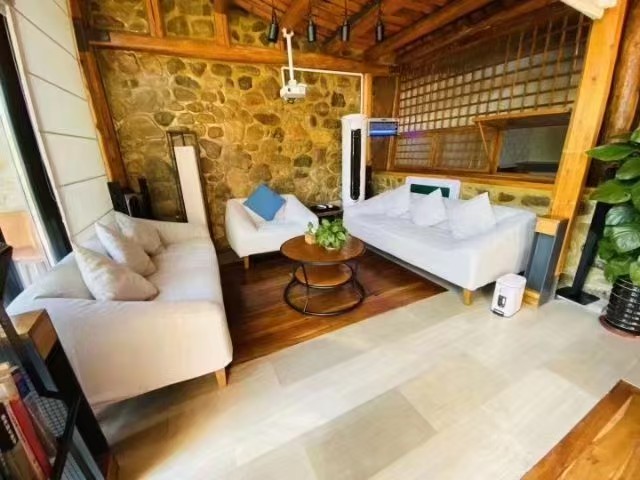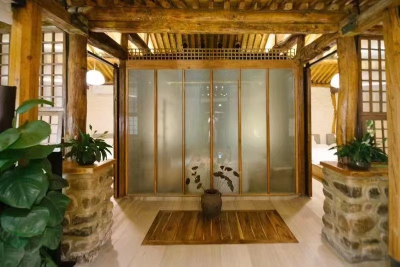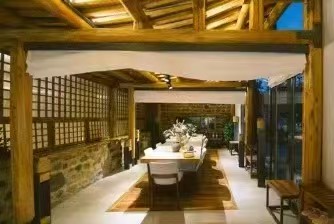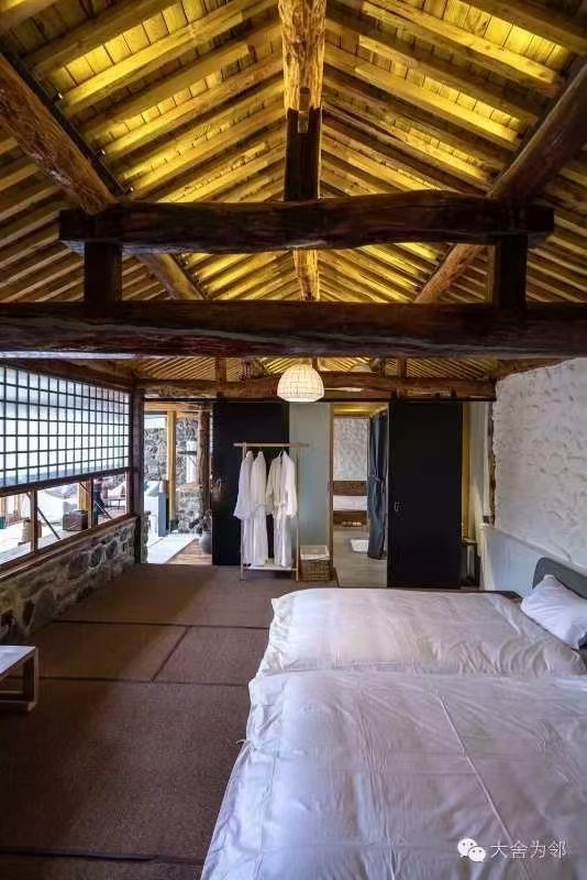 “大舍为邻”125号院位于黄花城水长城脚下,距离国家公园景区仅一公里之遥,院子入口是一烧烤院,石子漫成的甬路,内进便是一居宅,两室一厅一厨两卫,进门即为客厅,设有长桌、沙发及各种影音娱乐设施,左边卧室稍小,铺设一张双人床。右边卧室稍大,为大炕间,平常铺设三张单人床,亦可改设为通铺,两居最多可容纳5-6人居住,两个卧室中间为共用卫生间及浴室,以门相隔,相对独立,居宅前是儿童活动院,可眺望长城。