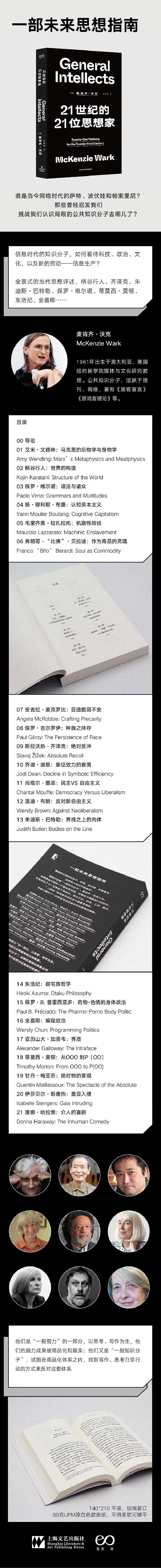 《21世纪的21位思想家》是一部介绍当代新思想的导论性书籍,作者用一本书的篇幅,评述了21位能够影响未来的思想家,为我们描绘了一幅当今世界思想导图。那些曾经启发我们、挑战我们认识局限的公共知识分子去哪儿了?谁是当今网络时代的萨特和波伏娃?本书作者认为,我们不会再有这样的人物了。但是我们还有一般知识分子,他们的作品能够解答我们这个时代的疑虑和困惑。本书涵盖的话题包括文化、政治、工作、技术和人类世,评述的思想家有柄谷行人、齐泽克、朱迪·巴特勒、蒂姆·莫顿、东浩纪、全喜卿等。麦肯齐·沃克别具一格的解读既表达了欣赏赞同,同时也提出批判,他期待一般知识分子共同编织一张协同的思想之网,以使人们理解,乃至改变这个世界。