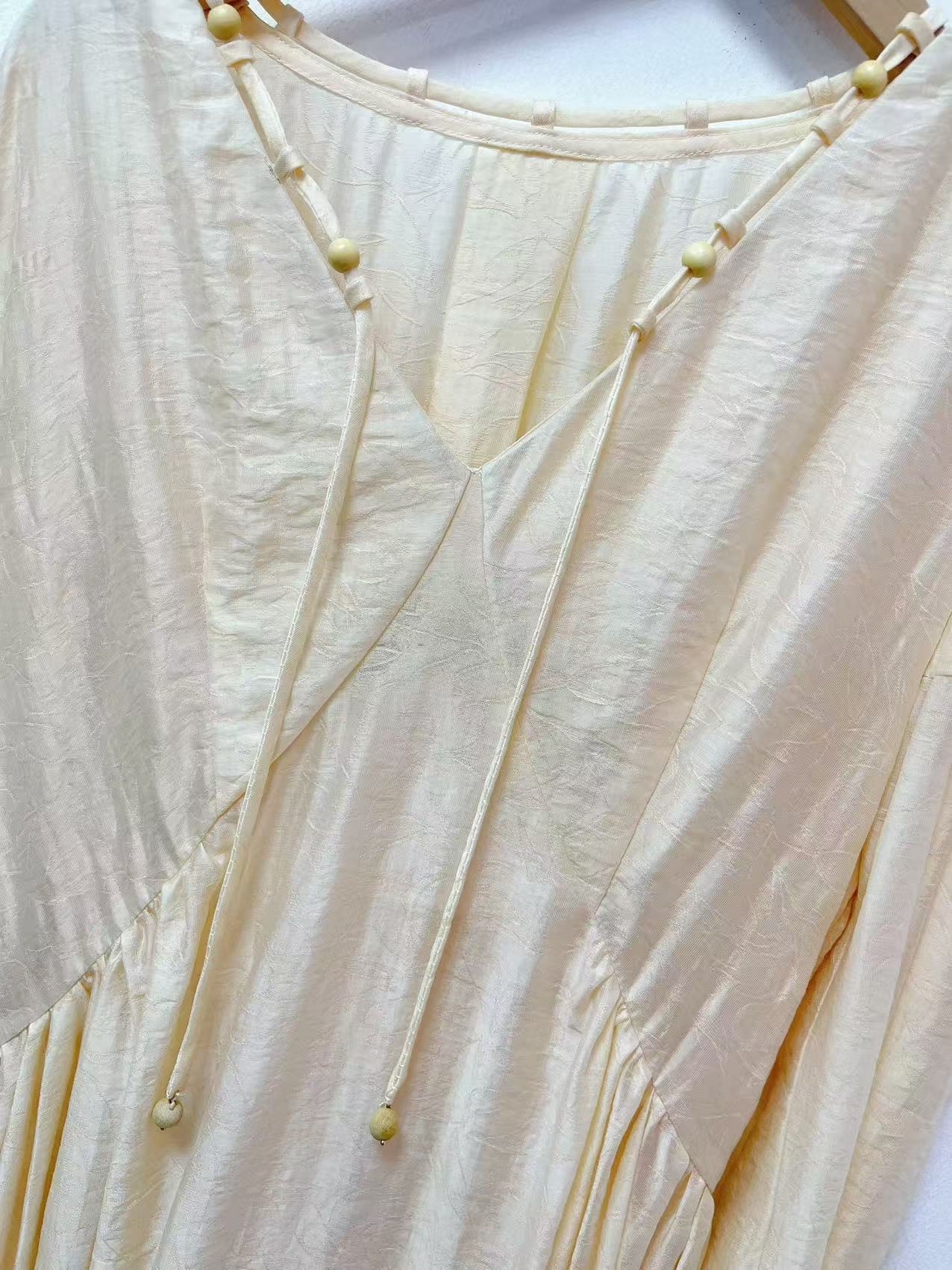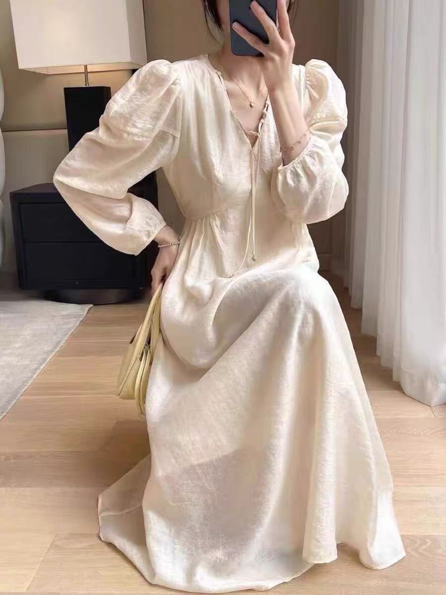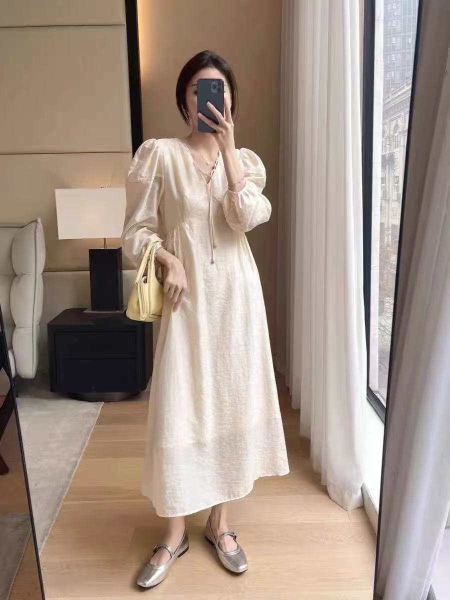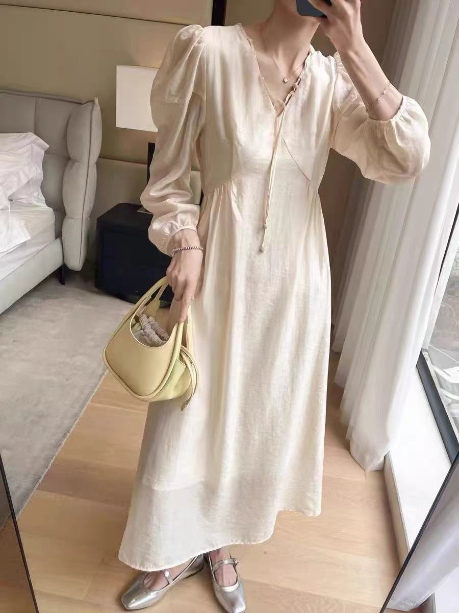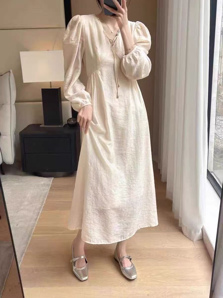 七夕福利-NO退-~83%天丝{ 连衣裙系列 }24092杏色提花法式气质优雅V领复古系带收腰仙气连衣裙女-喜出