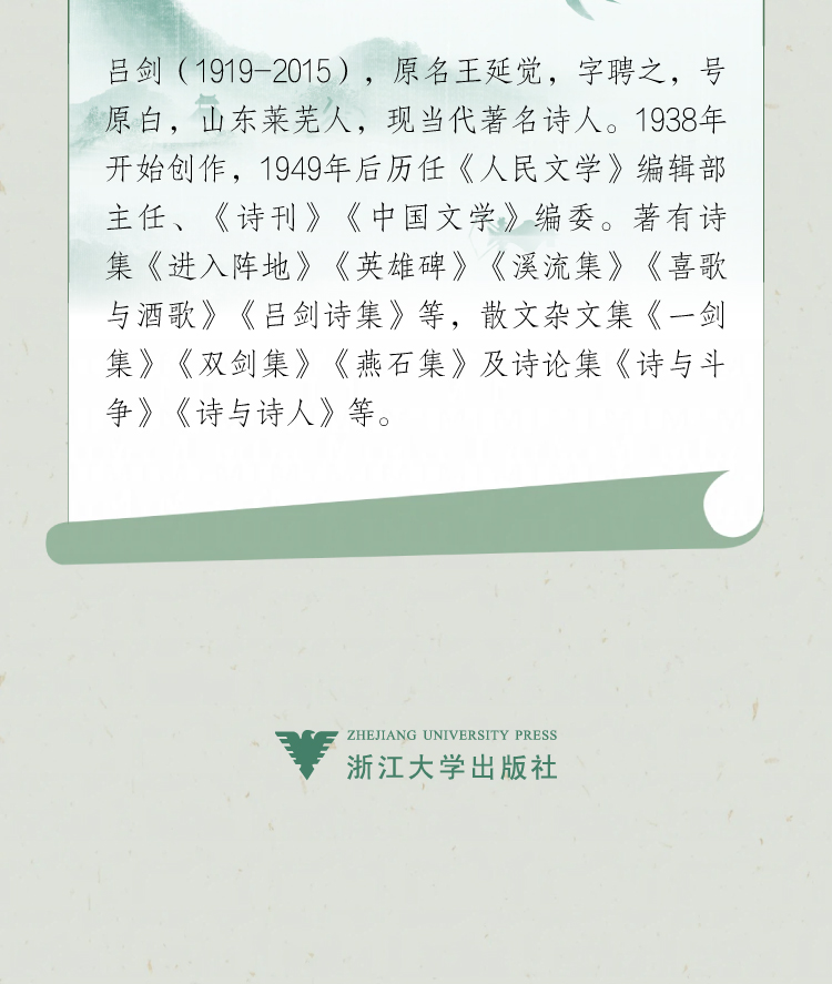 吕剑(1919-2015),原名王延觉,字聘之,号原白,山东莱芜人,现当代著名诗人。1938年开始创作,1949年后历任《人民文学》编辑部主任、《诗刊》《中国文学》编委。著有诗集《进入阵地》《英雄碑》《溪流集》《喜歌与酒歌》《吕剑诗集》等,散文杂文集《一剑集》《双剑集》《燕石集》及诗论集《诗与斗争》《诗与诗人》等。