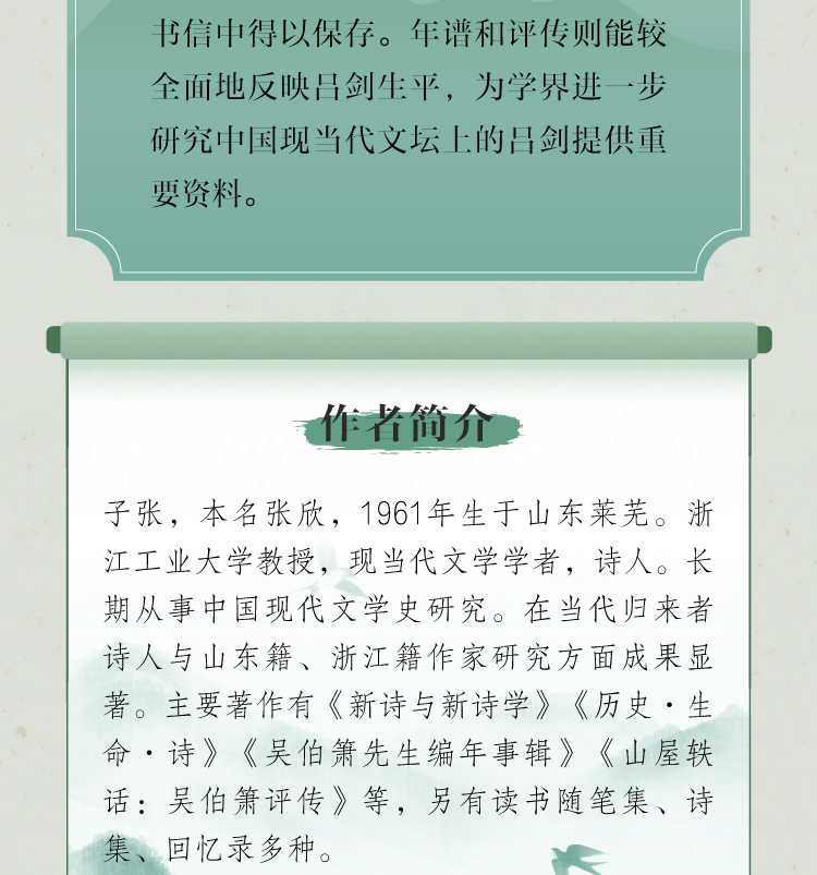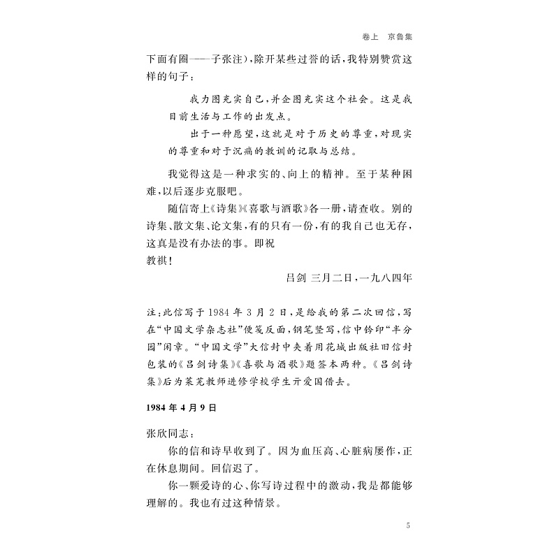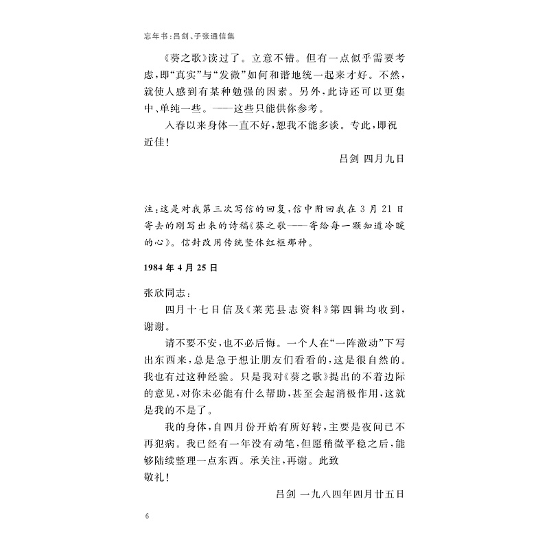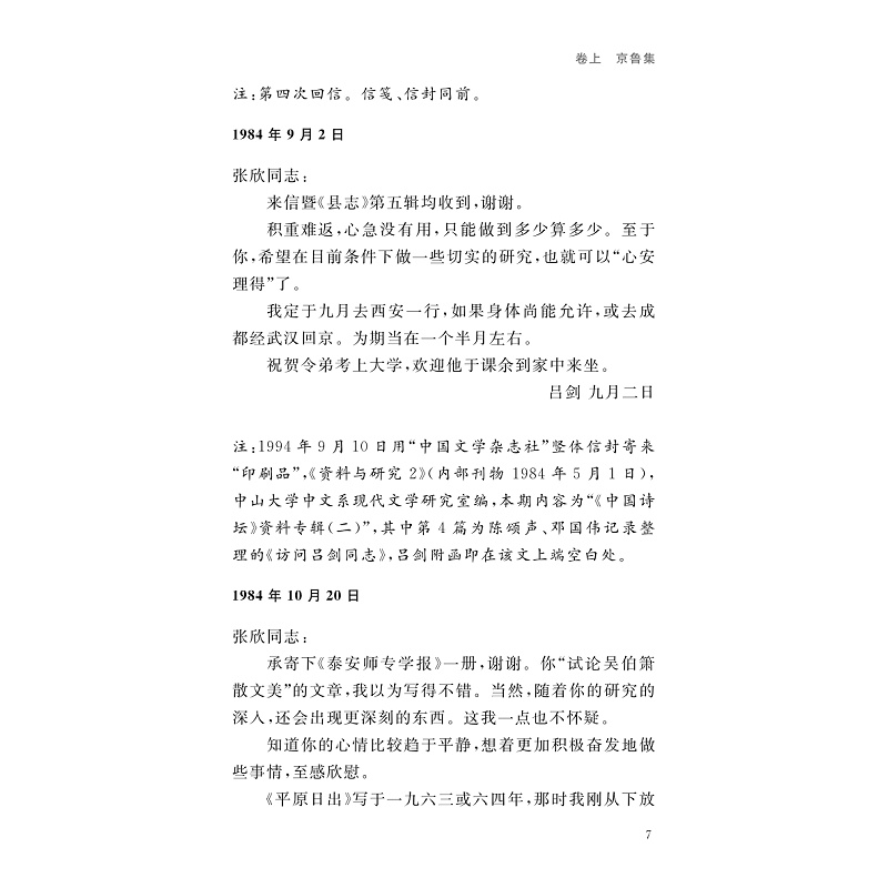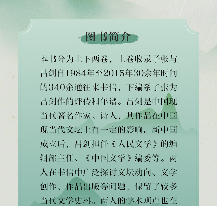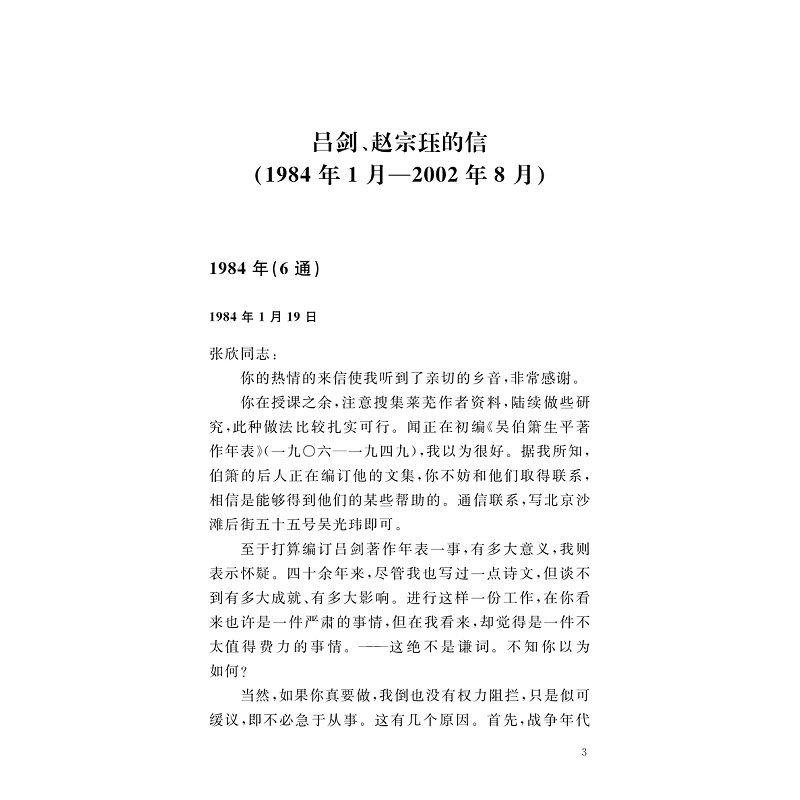 本书分为上下两卷,上卷收录子张与吕剑自1984年至2015年30余年时间的340余通往来书信,下编系子张为吕剑作的评传和年谱。吕剑是中国现当代著名作家、诗人,其作品在中国现当代文坛上有一定的影响。新中国成立后,吕剑担任《人民文学》的编辑部主任、《中国文学》编委等。两人在书信中广泛探讨文坛动向、文学创作、作品出版等问题,保留了较多当代文学史料。两人的学术观点也在书信中得以保存。年谱和评传则能较全面地反映吕剑生平,为学界进一步研究中国现当代文坛上的吕剑提供重要资料。