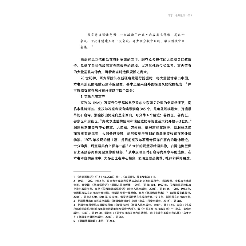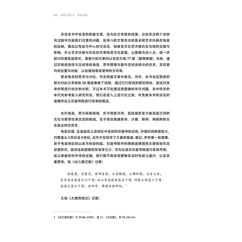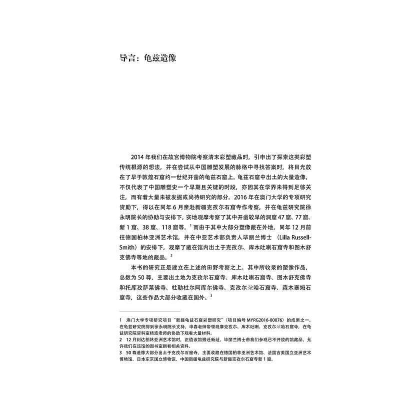 本书是张泽珣在澳门大学研究项目的部分重要成果。本书将新疆龟兹石窟造像艺术作为研究的材料,揭示出新疆古龟兹造像与犍陀罗艺术、秣菟罗艺术文化的关联。在相互往来交流影响中,中原文化艺术沿河西走廊抵达龟兹,对龟兹造像的汉化产生了影响。本书所讨论的作品,主要收藏在新疆龟兹研究院、德国柏林亚洲艺术馆和法国吉美美术馆。本书对这些作品的研究,包含《龟兹作为古代中外佛教泥塑相互影响的枢纽初探》《众生万象:龟兹造像中的婆罗门形象》等重要文章。