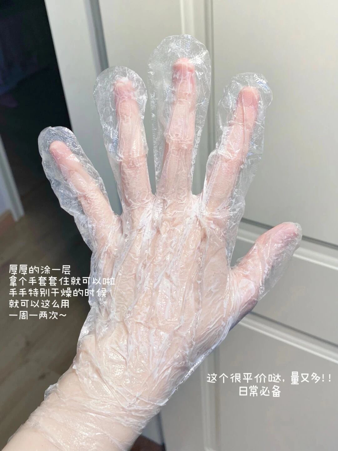 2️⃣涂上厚厚一层roopy护手霜(便宜大碗不心疼),用一次性手套套住;