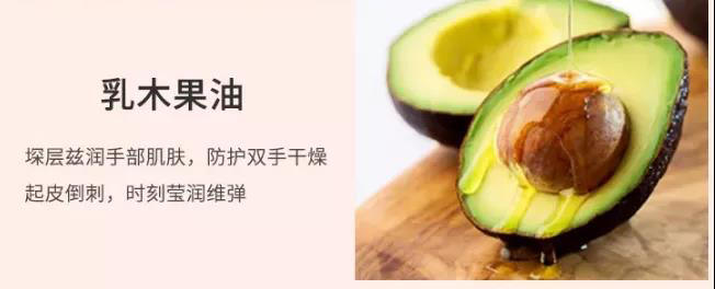 还有牛油果提取物等成分,采用了令双手时刻保持水润嫩泽的护理成分