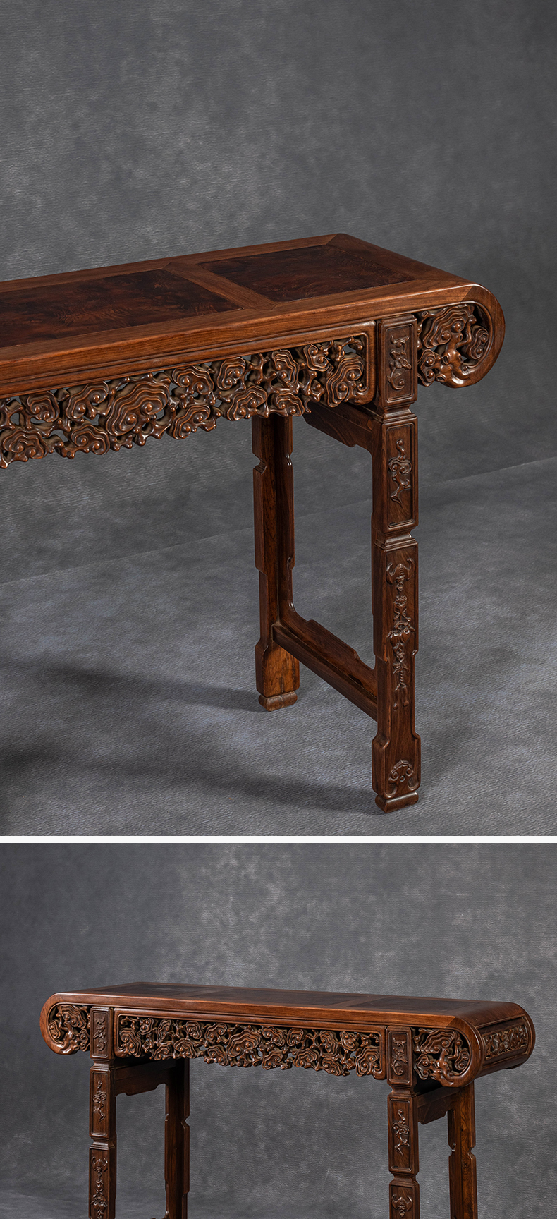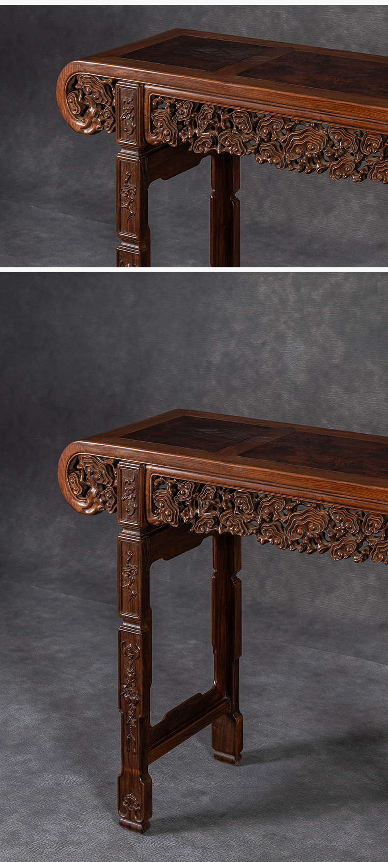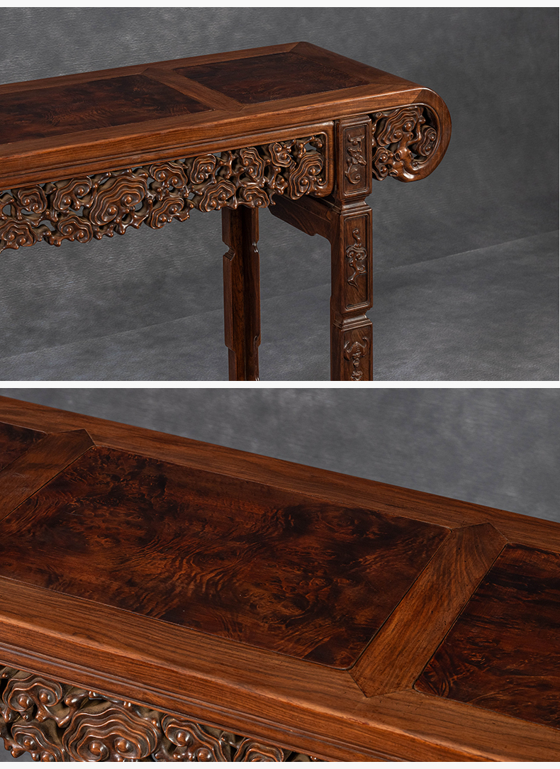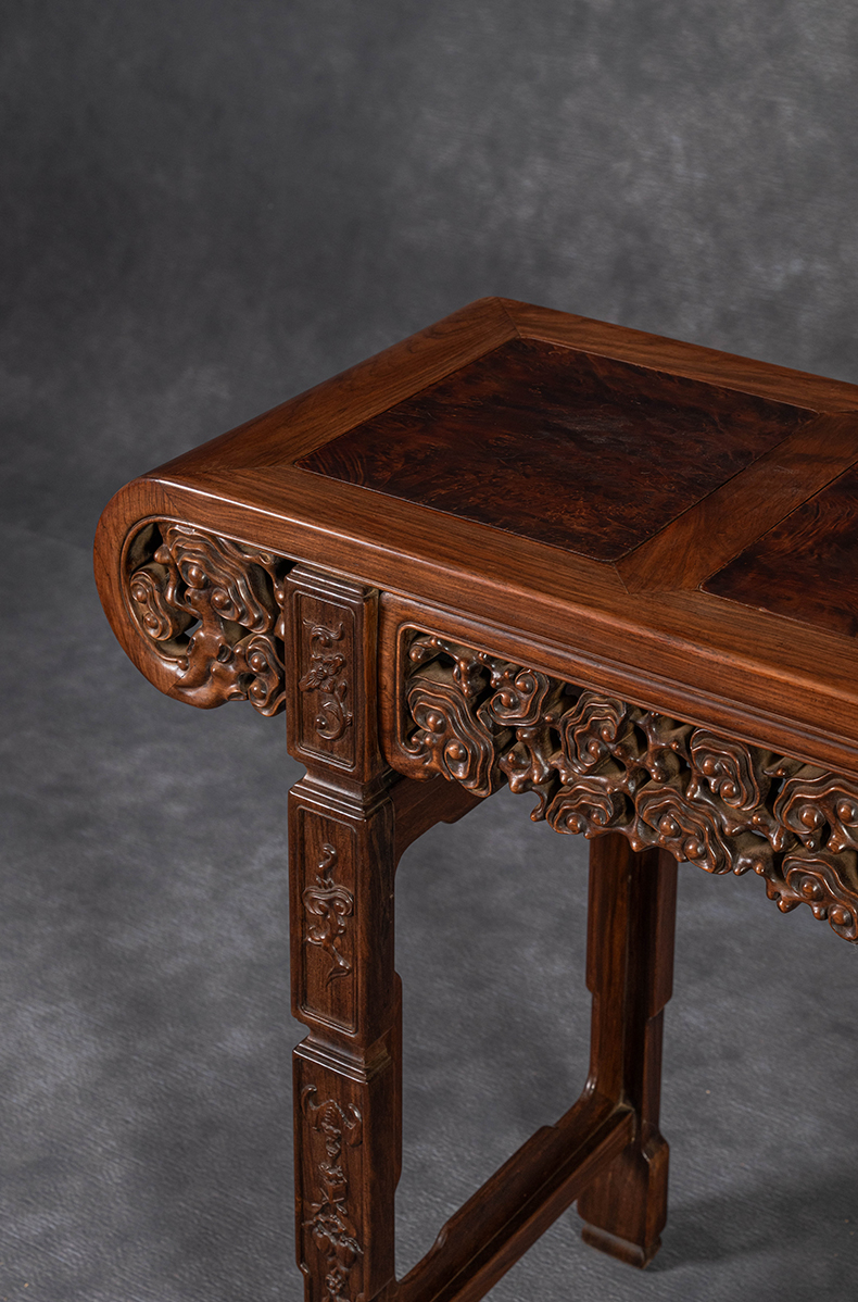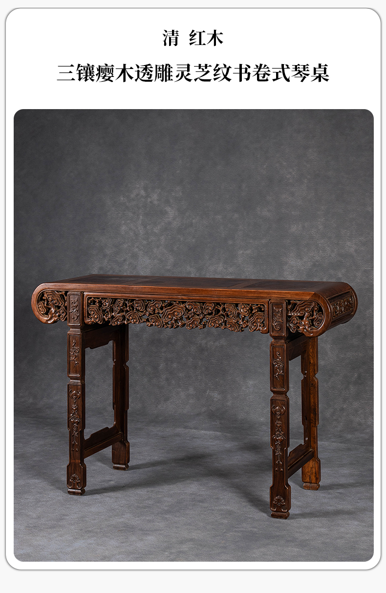 清 红木三镶瘿木透雕灵芝纹书卷式琴桌