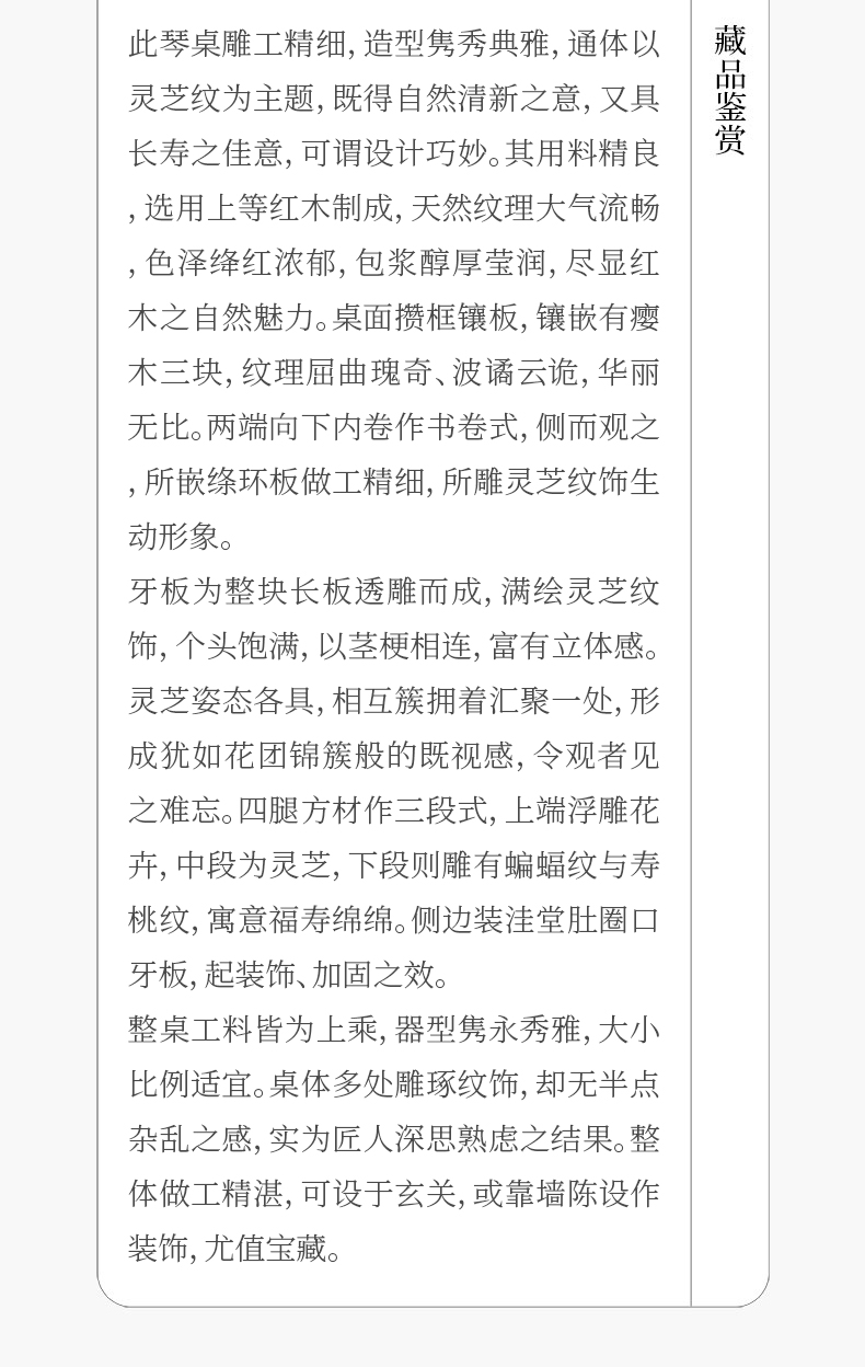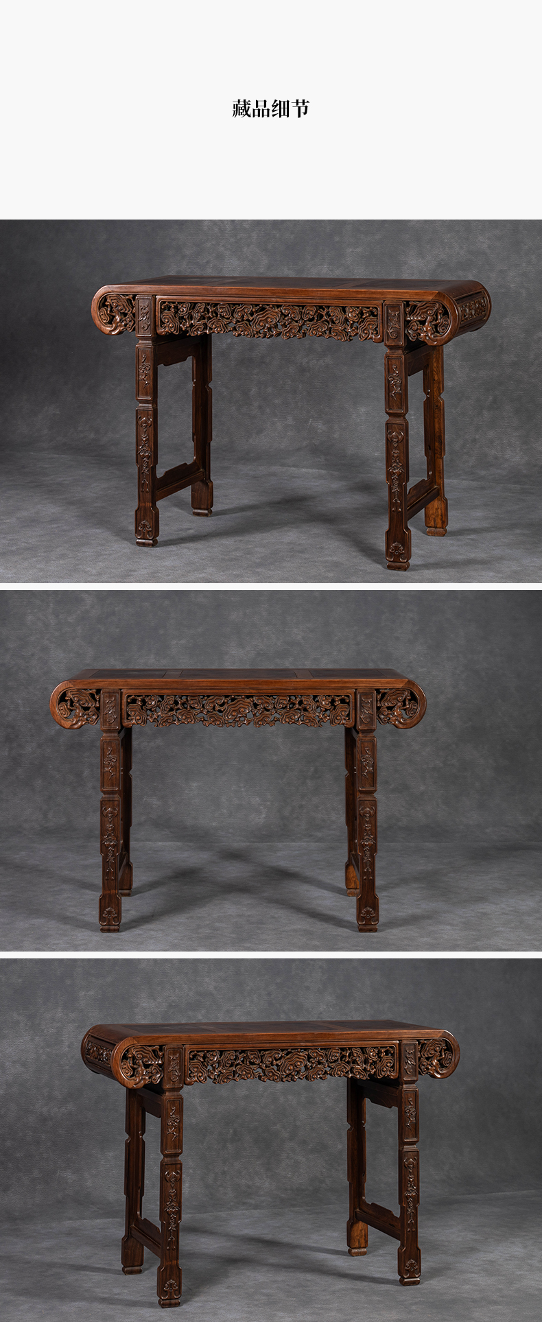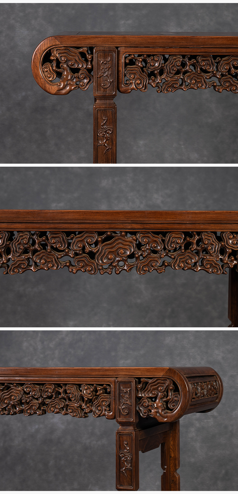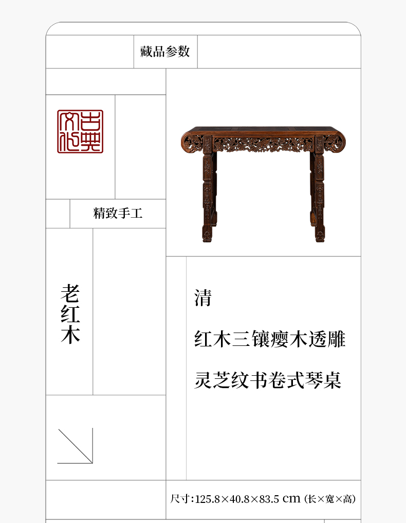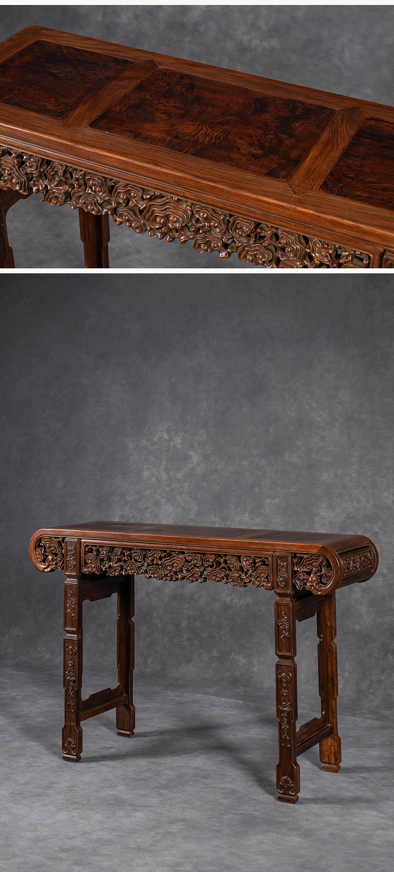 清 红木三镶瘿木透雕灵芝纹书卷式琴桌