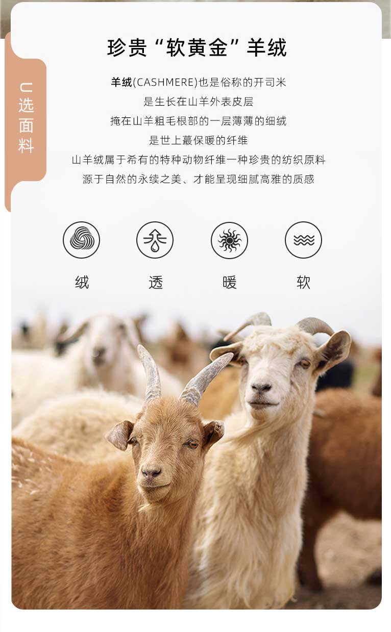 其中山羊绒-是生长在山羊外表层,在山羊根部的一层薄薄的细绒,它是随季节而变化的。入冬寒冷时长出,抵御风寒;开春转暖时,自然脱落,自然适应气候。回暖时,牧羊人开始收集细绒。