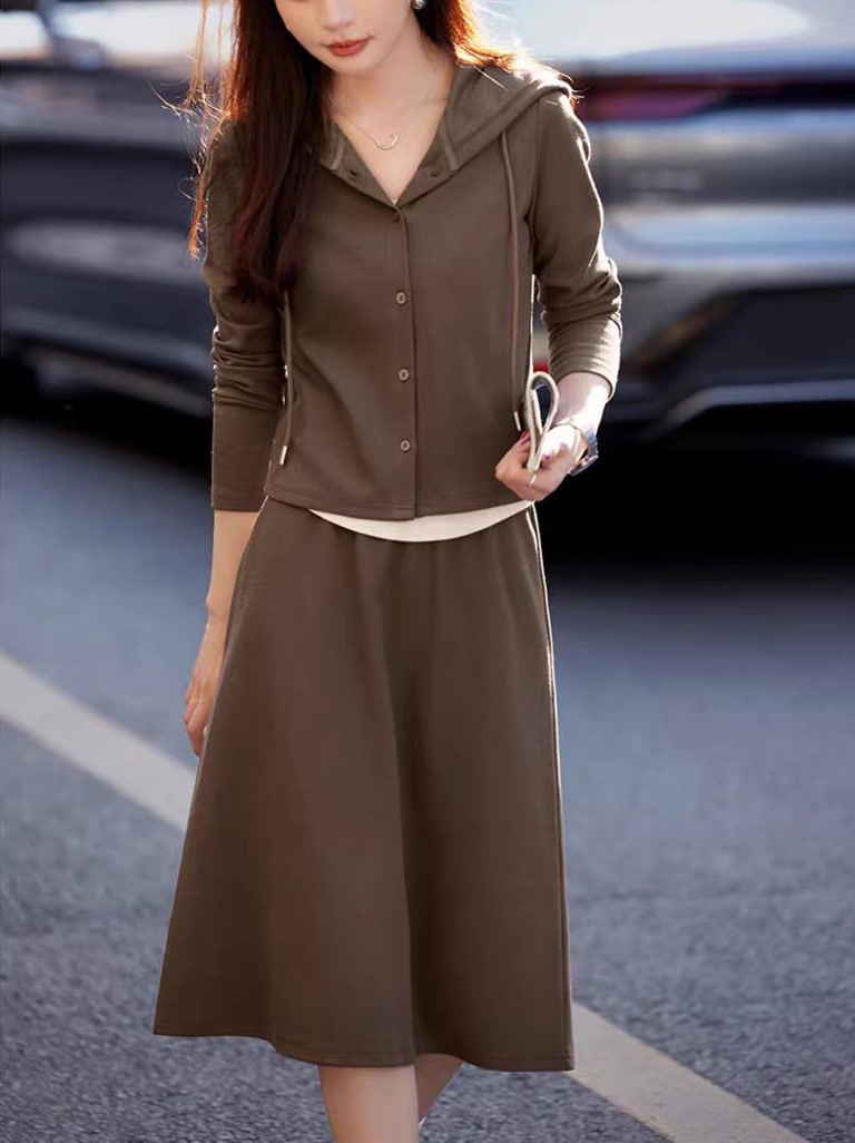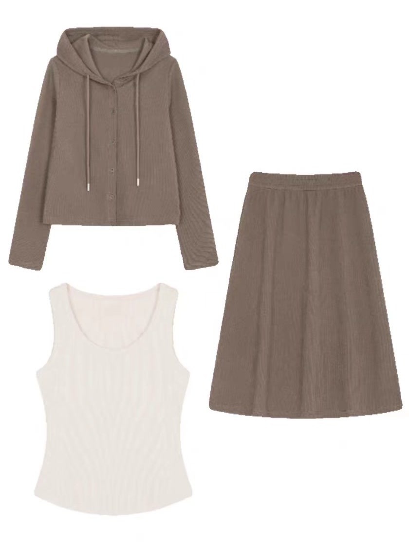 雀说时髦休闲运动针织三件套新款连帽上衣背心长裙套装女AL8074