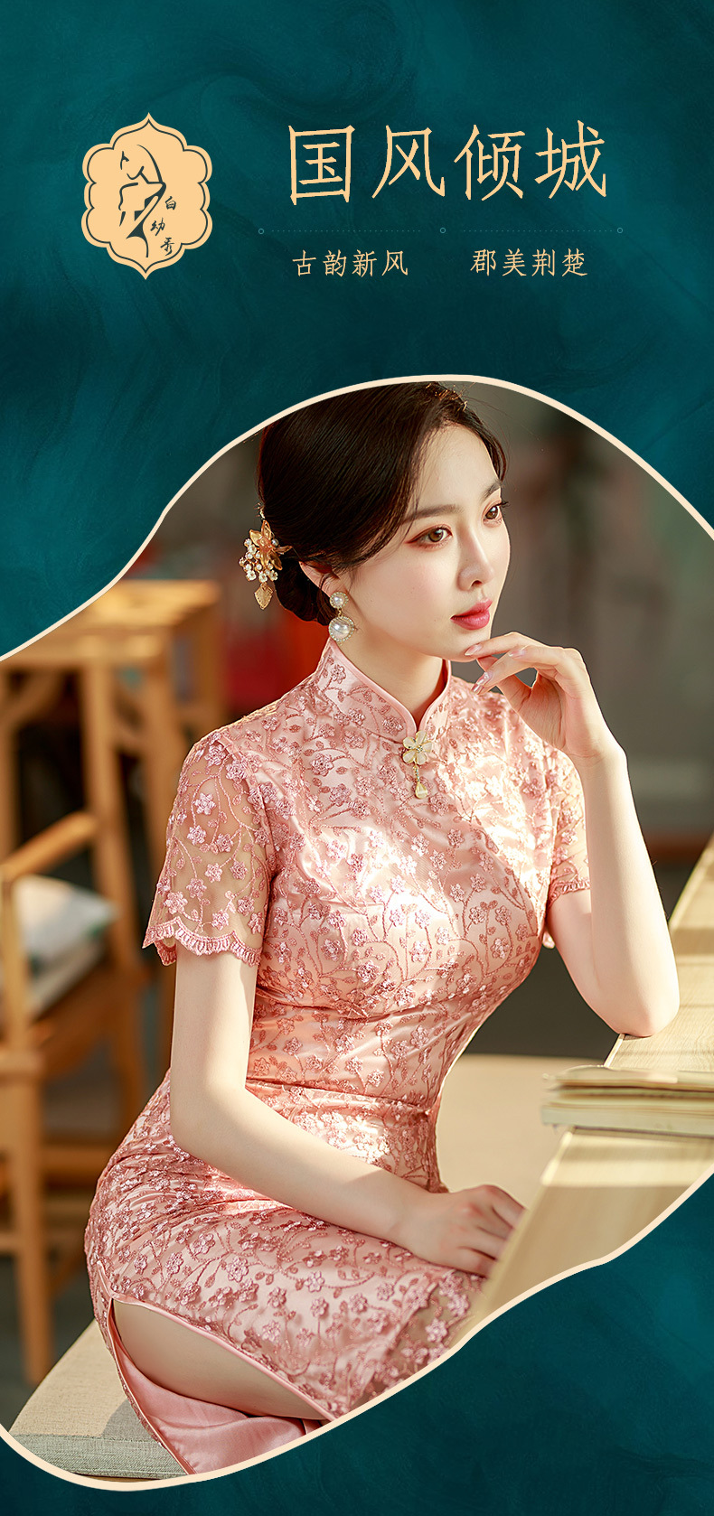 粉色性感旗袍,蕾丝绣花短袖立领走秀晚礼服ST- B2158