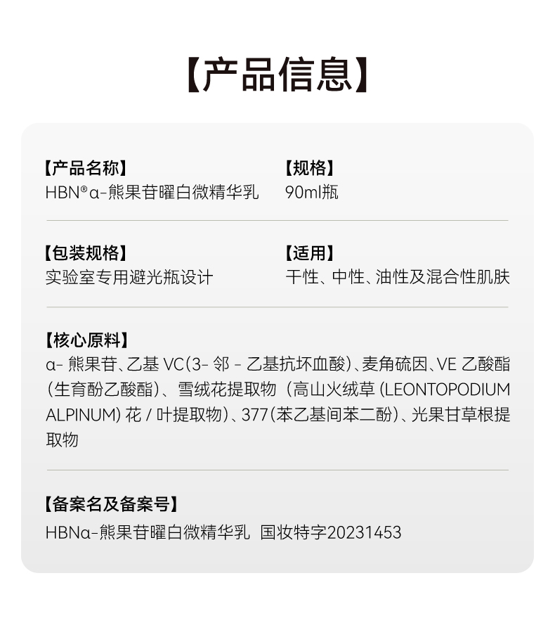 DK202406009【美白特证原白乳】HBN α-熊果苷曜白微精华乳