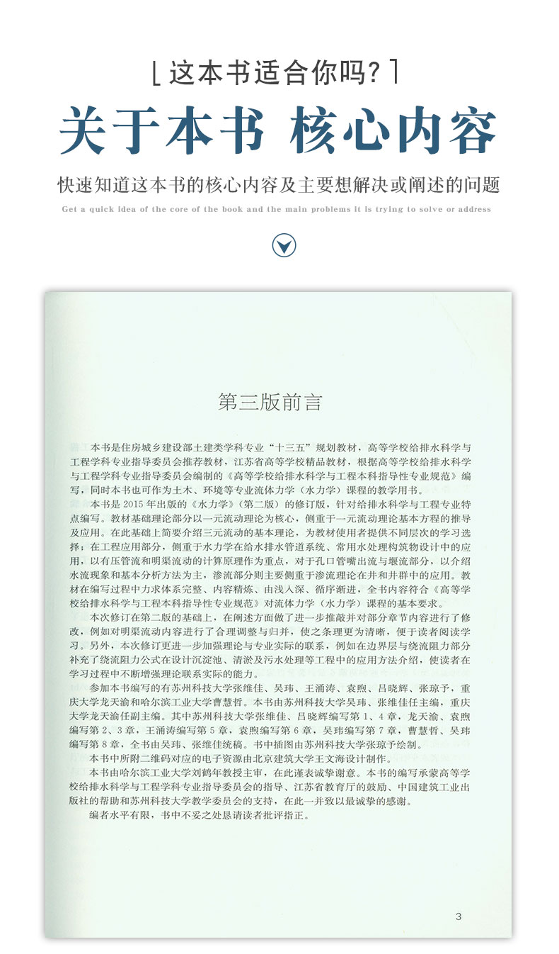 本书是普通高等教育土建学科专业“十二五”规划教材,高等学校给水排水工程专业指导委员会推荐教材,江苏省高等学校精品教材,根据国家高等学校给水排水工程学科专业指导委员会编制的《高等学校给排水科学与工程本科指导性专业规范》编写。 全书共分9章,主要内容有:水静力学,水动力学基础,相似原理与量纲分析,水头损失,有压管流,明渠流动,孔口、管嘴与堰流和渗流等。本书针对给排水科学与工程专业的特点,在系统阐述基本理论与基本原理的基础上,注重对学生理论联系实际能力的培养。 本书也可作为环境工程、土木工程、水利工程和工程力学等专业水力学(工程流体力学)教学用书。作为给排水科学与工程专业主干课程的教材,建议教学时数80学时(含实验教学)。