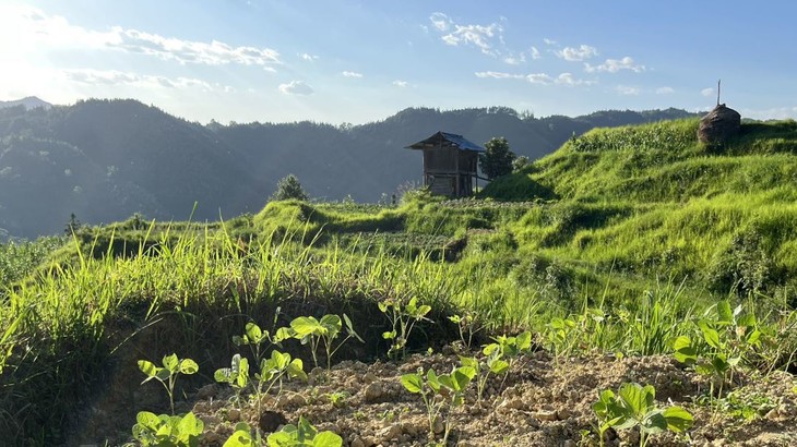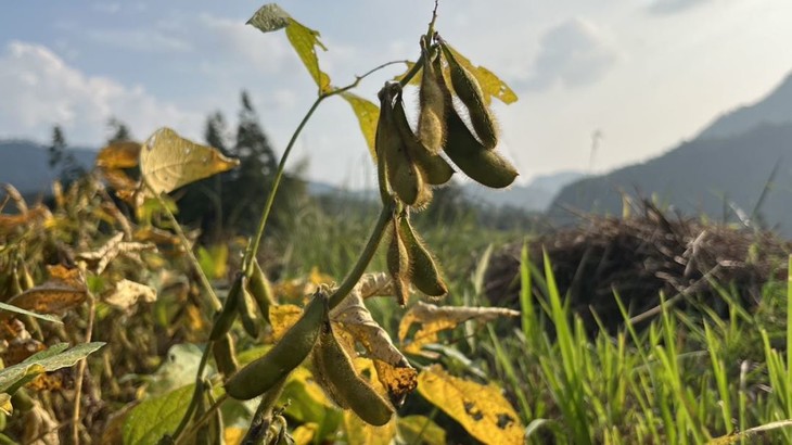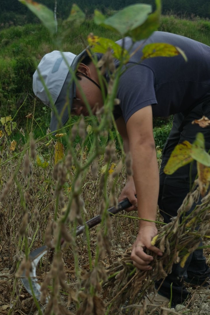 8月初,奋力生长的花生地。10月初开始收割,持续半个月左右。收割青皮黄豆靠人工用镰刀割,比收水稻还要麻烦。割完再把带黄豆的杆子搬运到梯田遍,人工脱粒。