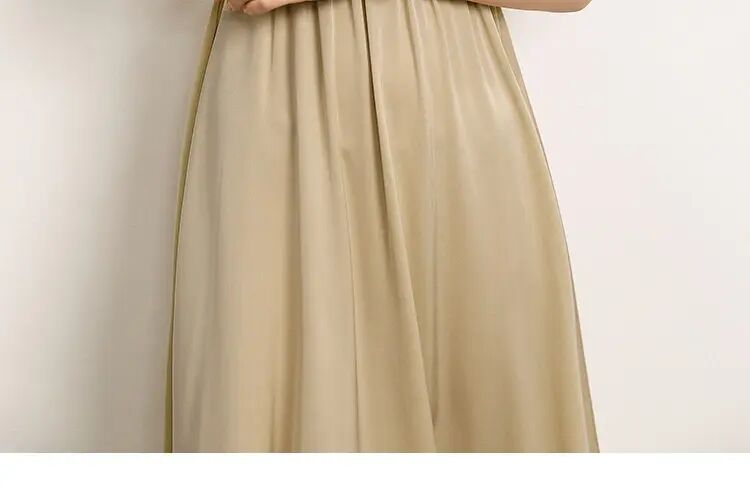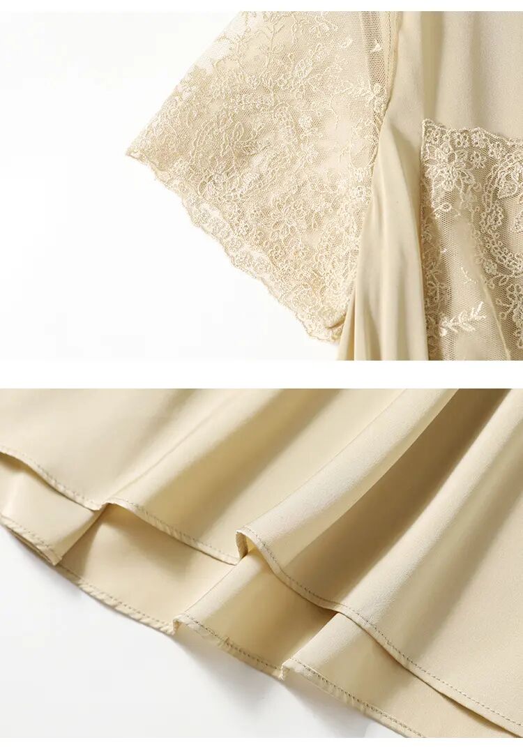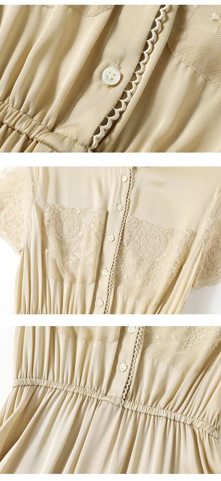 【高货kbnq】全新升级【铂金会员441/天猫599/差价158】(05143) 洛诗琳2025新款收腰拼接蕾丝立领短袖桑蚕丝大摆连衣裙