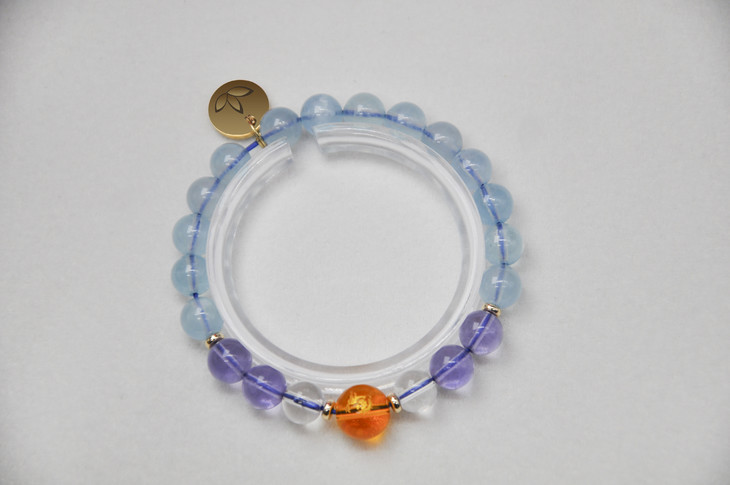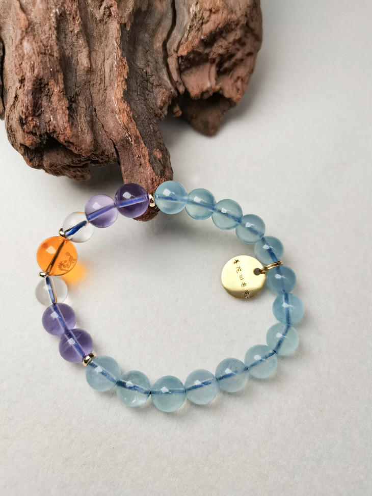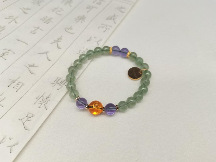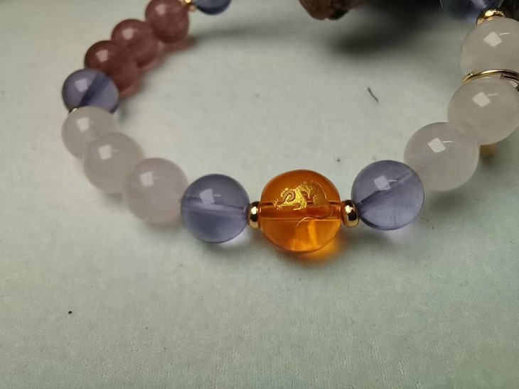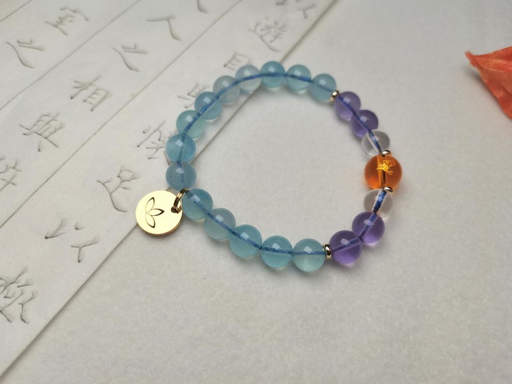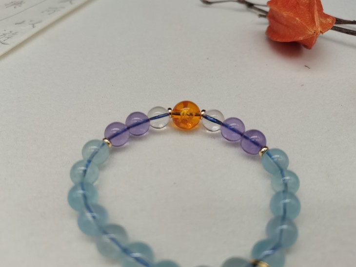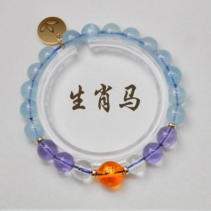 吉祥色:紫黄蓝。配色:海蓝宝、紫水晶、生肖马珠