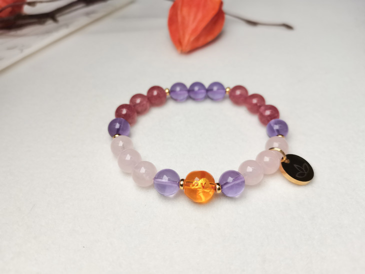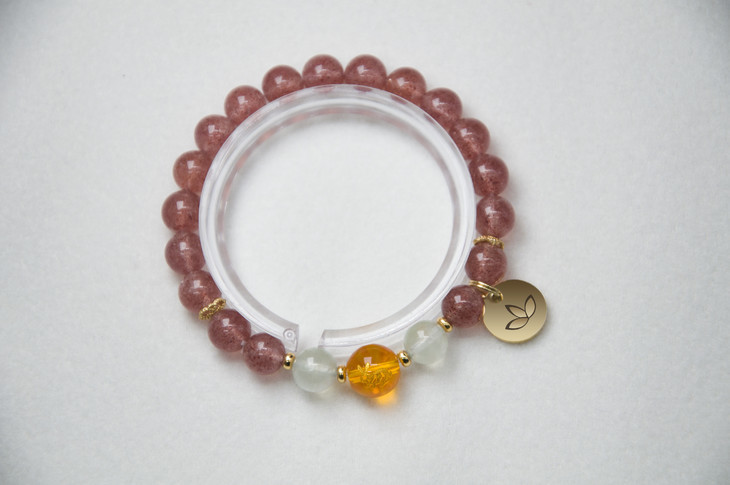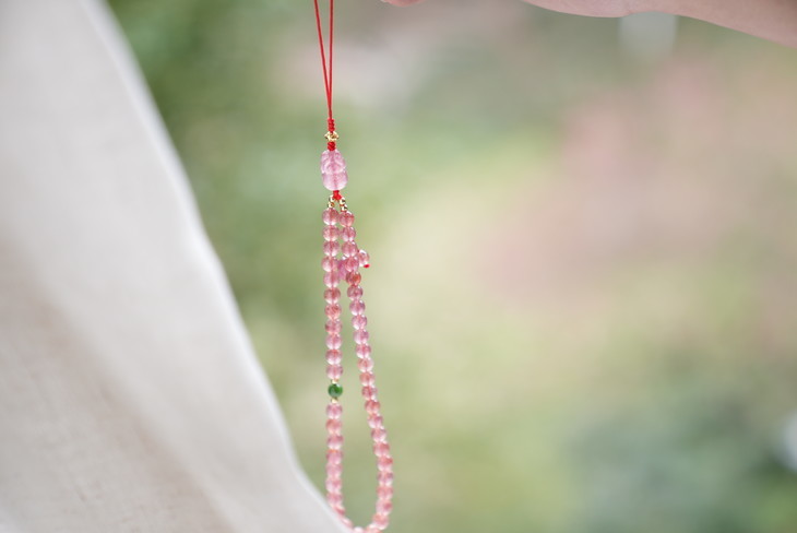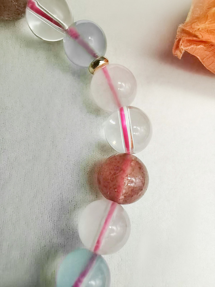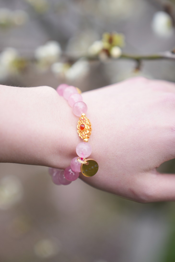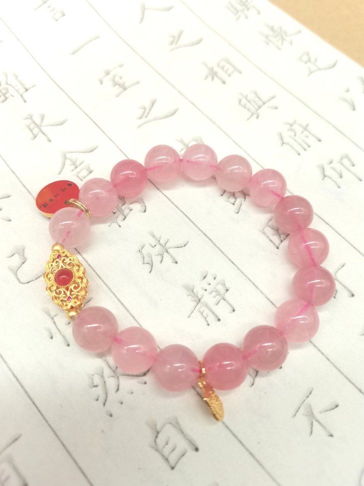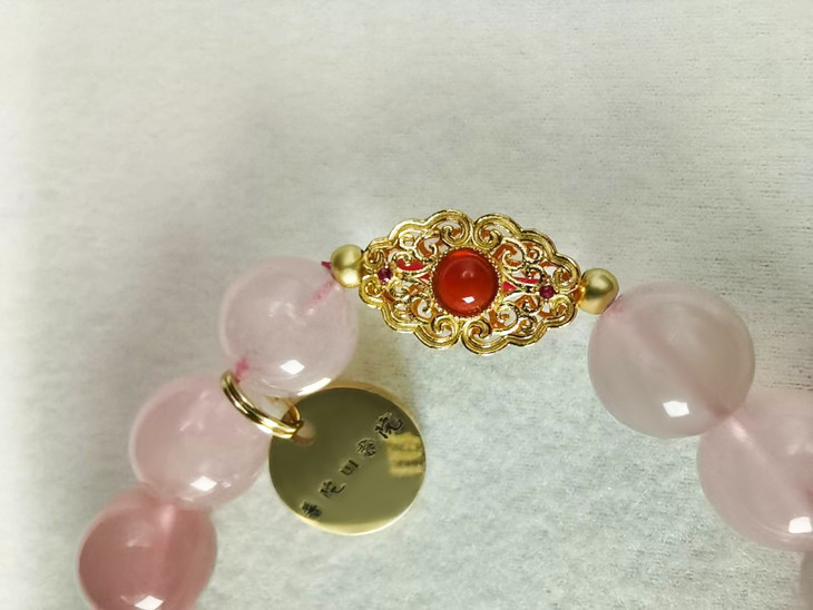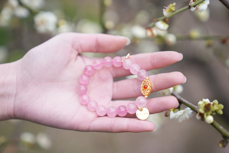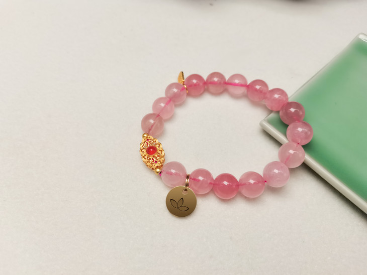 这款手串的粉水晶,采用马达加斯加老矿蜜桃粉晶,色如蜜桃,出水芙蓉,高雅浪漫。