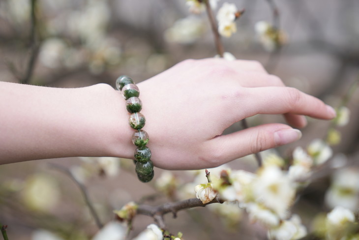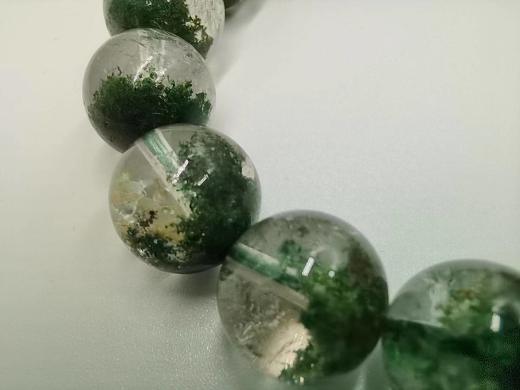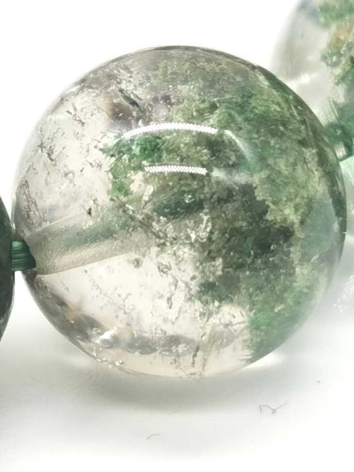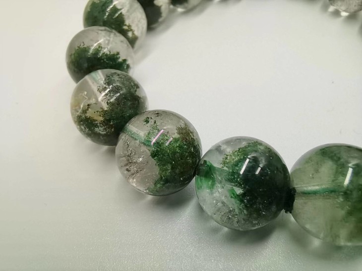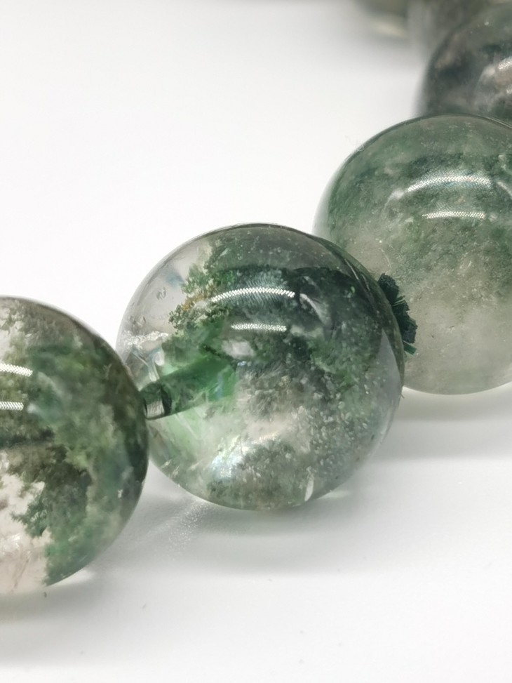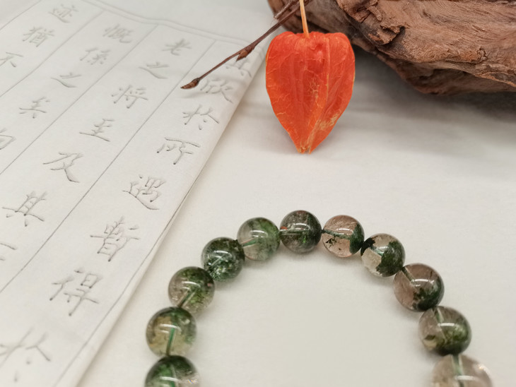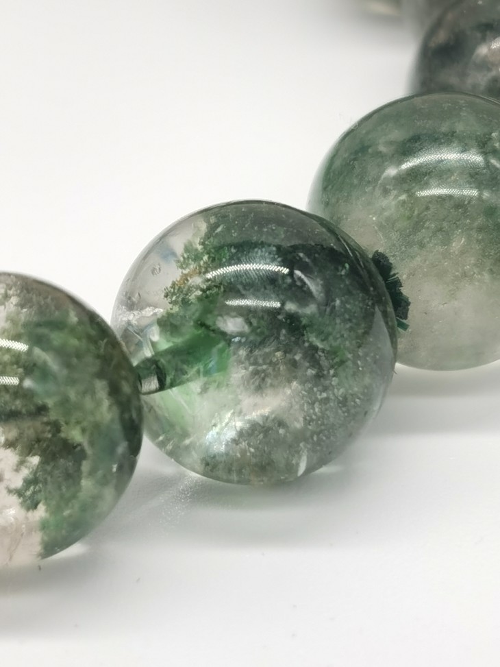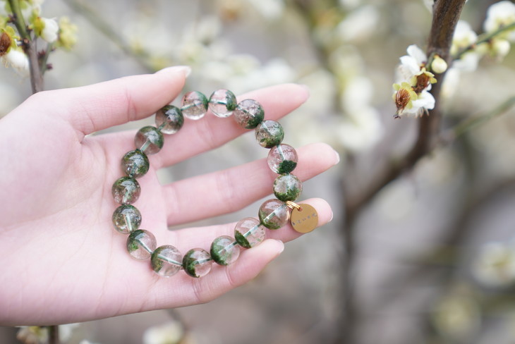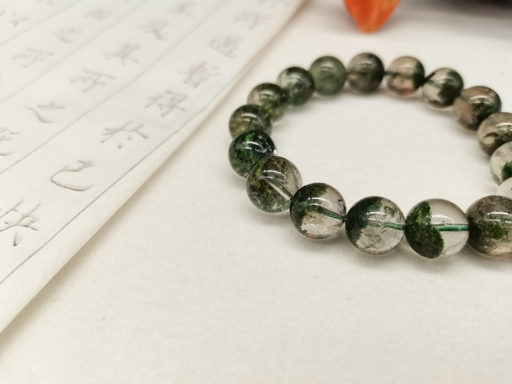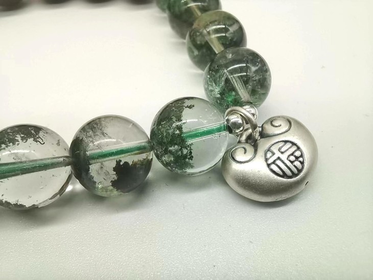 如这款绿色幽灵手串,如原始森林中流出来的泉水,经过绿色的苔鲜青草,在瞬间凝固而成,每颗珠子却又不尽相同。