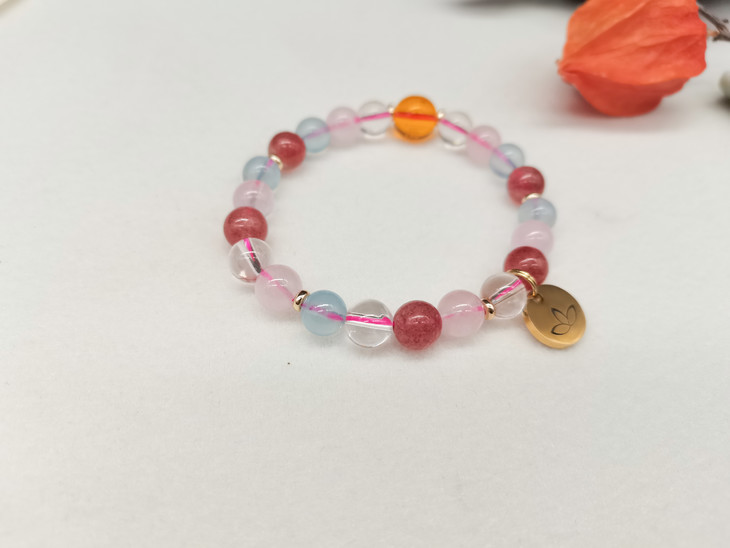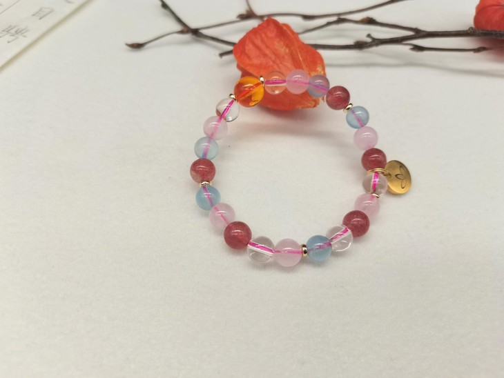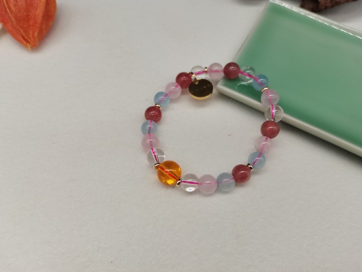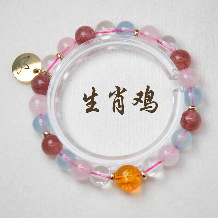 配色:红草莓晶、粉晶、海蓝宝、生肖鸡珠