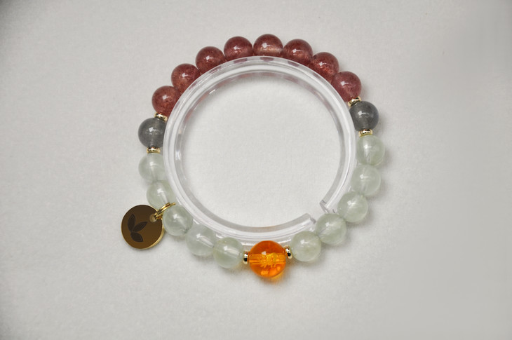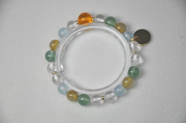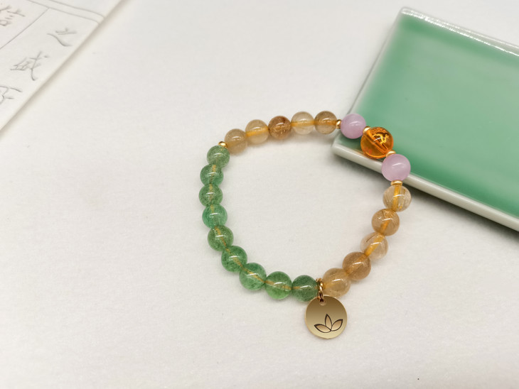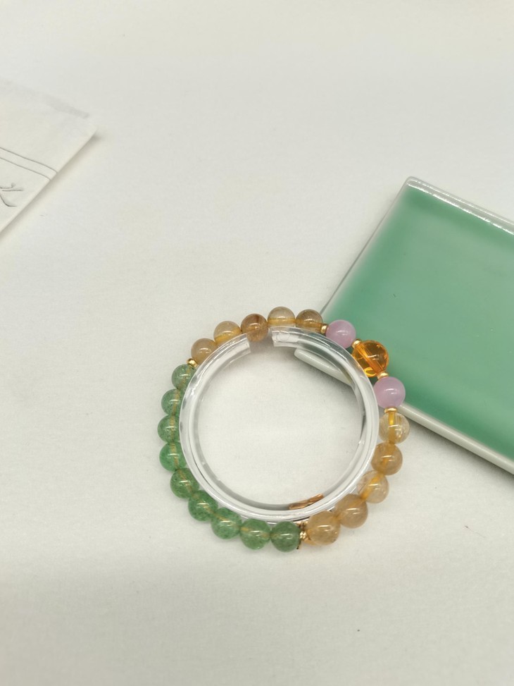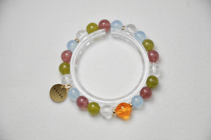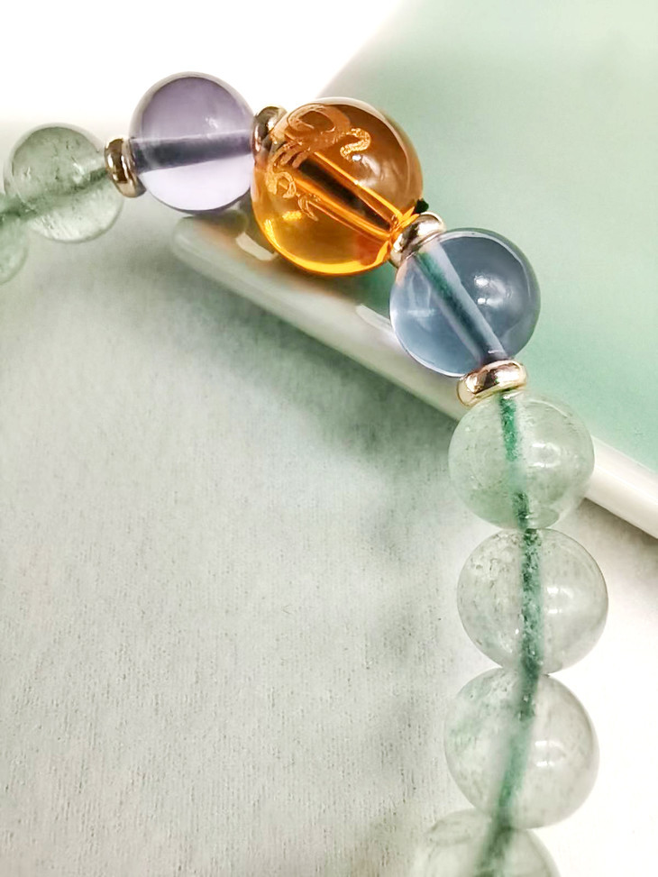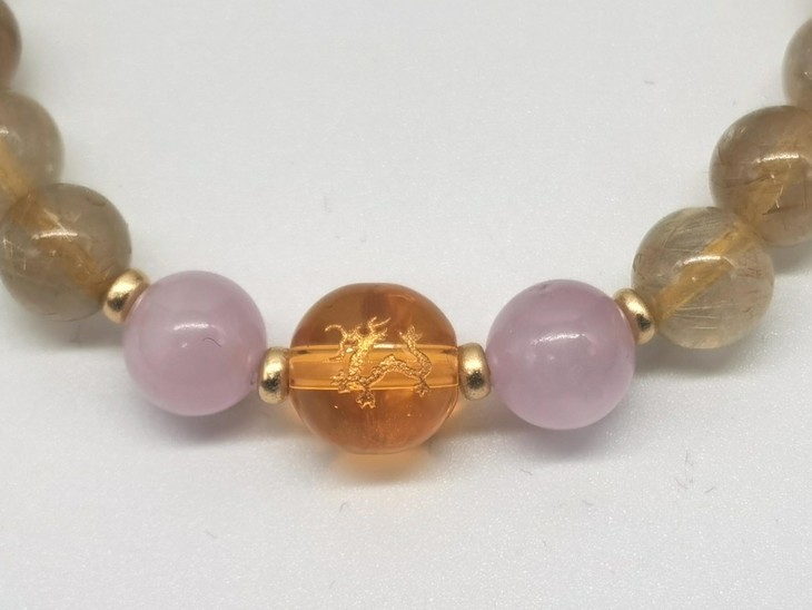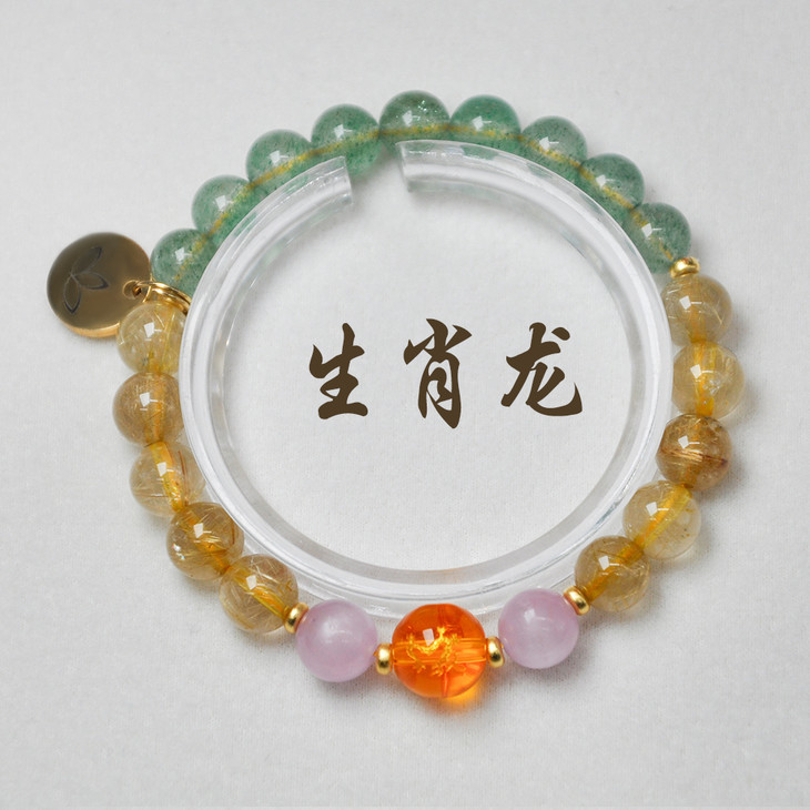 配色:绿草莓晶、黄发晶、紫锂辉,生肖龙珠