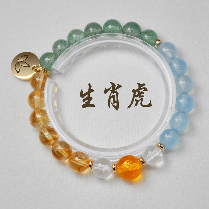 配色:黄水晶、绿草莓晶、海蓝宝、 生肖虎珠