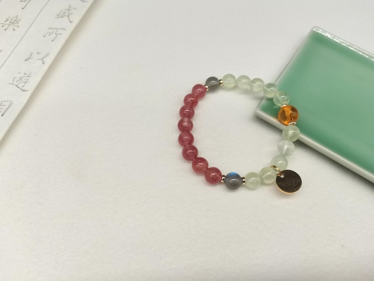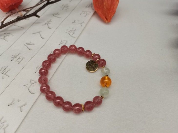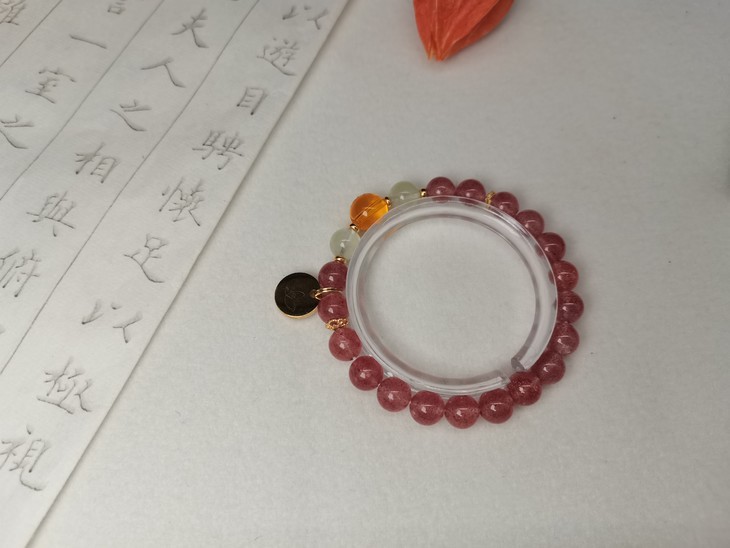 红,是大喜的标配。4粒红红草莓晶跳脱有力,邻珠是粉晶,力量与温柔相得益彰。