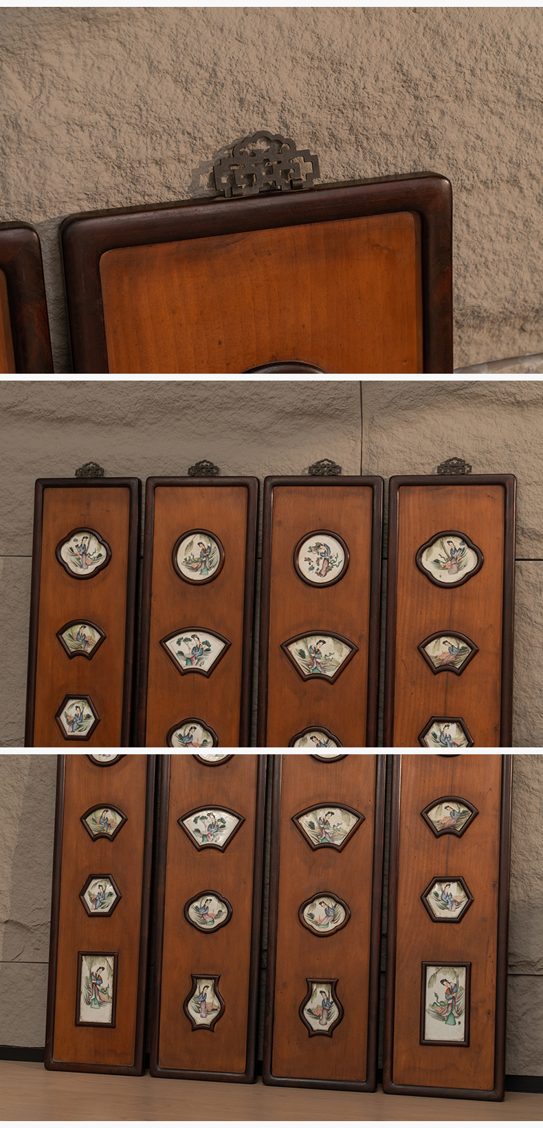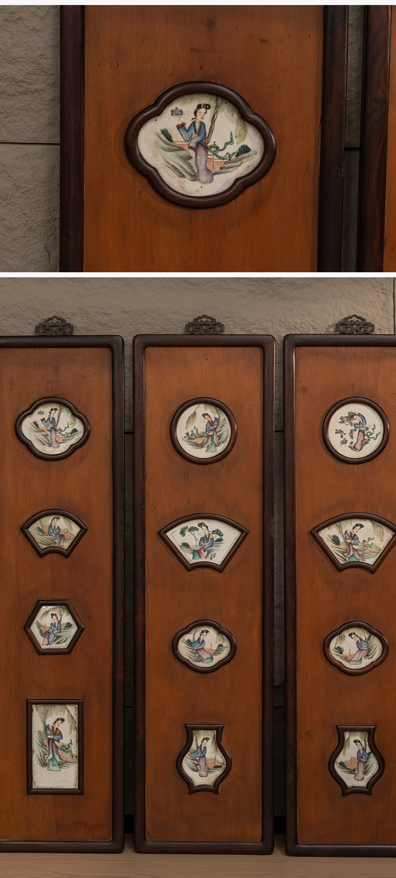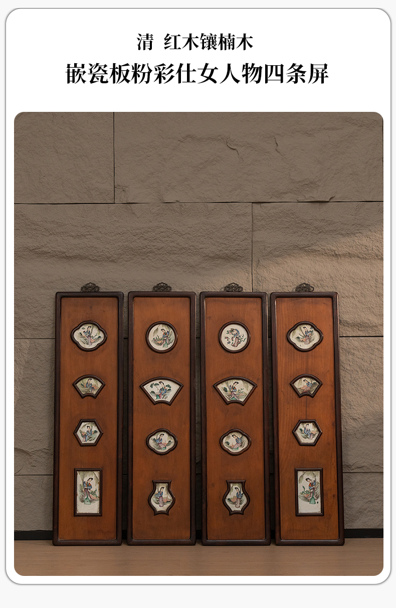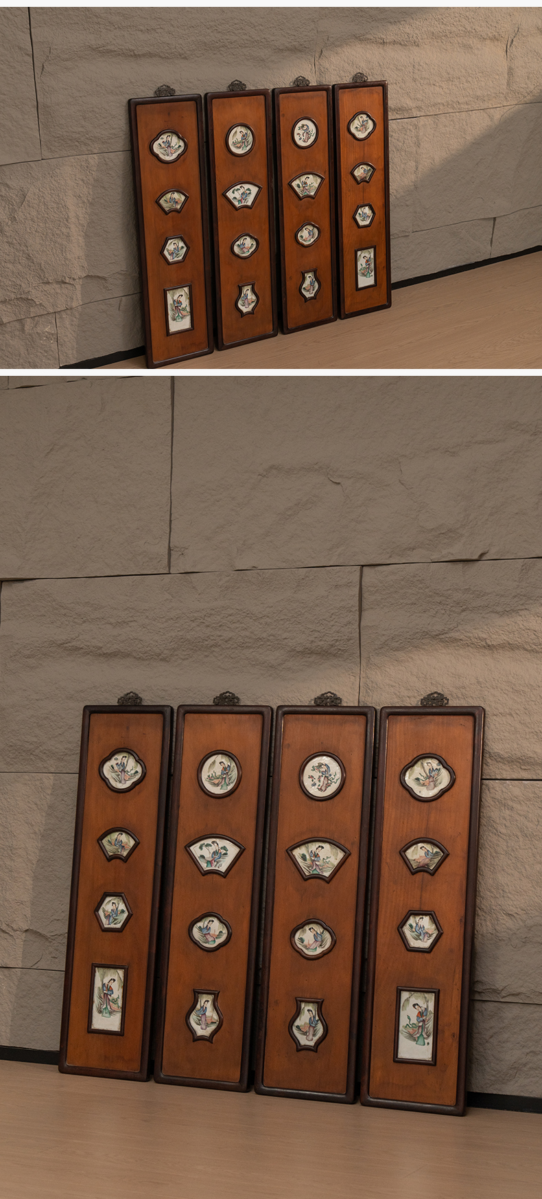 清 红木镶楠木嵌瓷板粉彩仕女人物四条屏