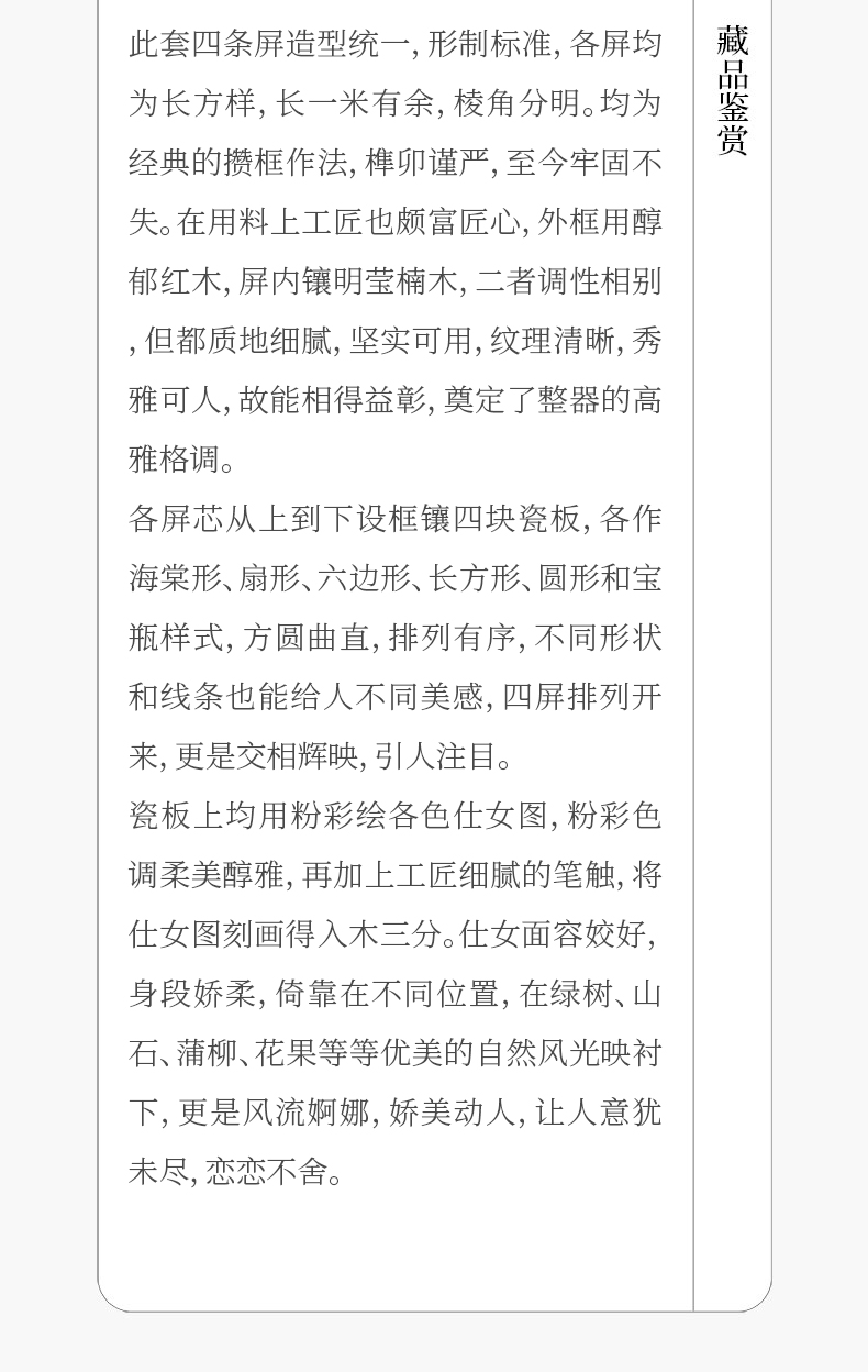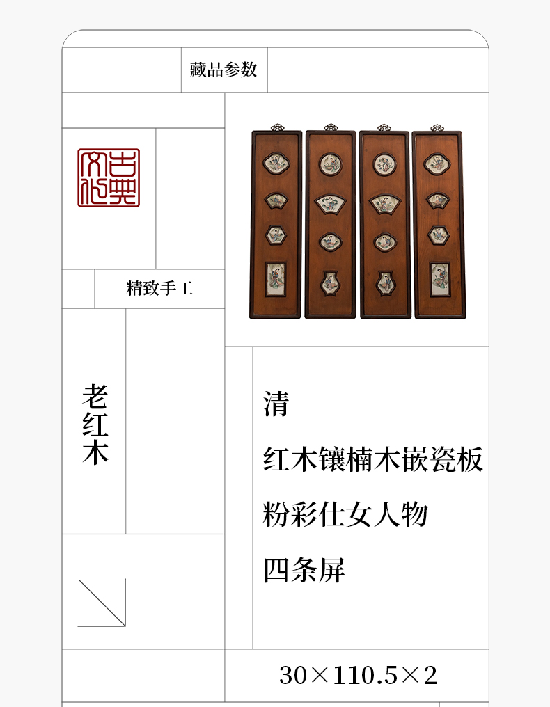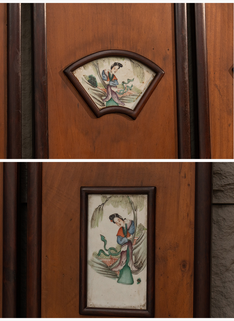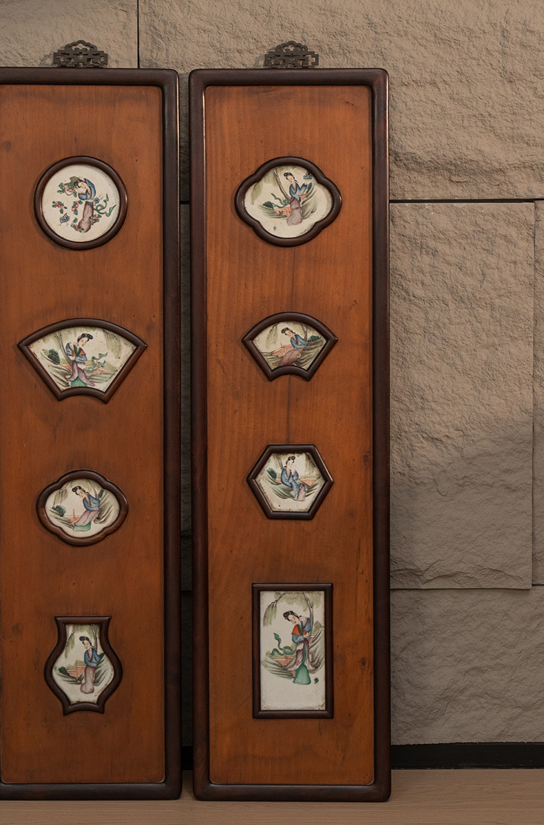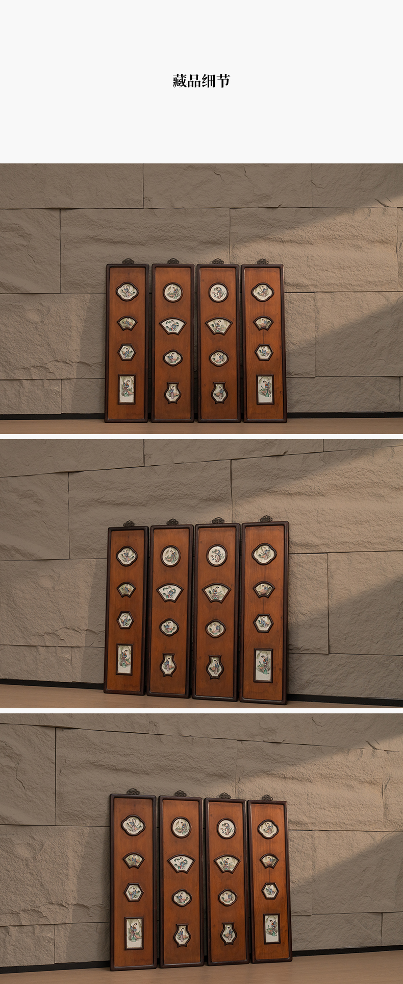 清 红木镶楠木嵌瓷板粉彩仕女人物四条屏