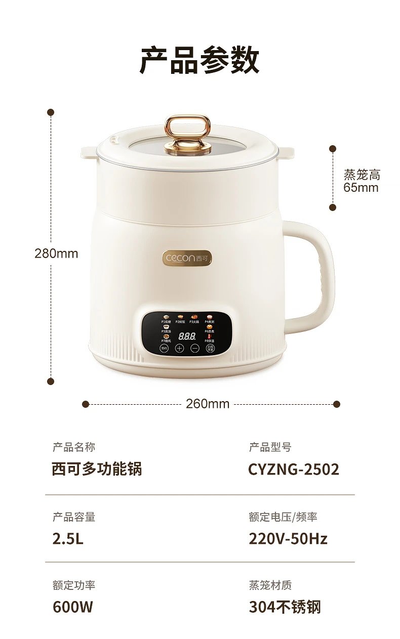 1 一机多用,智能触控|6大功能+3档火候,厨房小白秒变大厨! 2 古法沥糖技术|配专用沥水篮,米饭糖分降低,健康轻负担! 3 2.5L宽体容量|陶瓷釉内胆耐磨不粘,2-5人家庭刚需! 4 上蒸下煮同步进行|304不锈钢蒸笼,省时省力省电! 5 24小时预约+8小时保温|上班带饭、带娃党福音! 6 600W大功率+三重安全防护|干烧断电,无需看管! 产品名称:西可蒸煮一体低糖饭煲CYZNG-2502 产品容量:2.5L 额定功率:600W 额定电压:220V~ 额定频率:50Hz 【运费政策】 发货快递:三通一达 发货时效:48小时发货 不发货地区:港澳台、新疆、西藏不发 偏远地区加运费:内蒙古自治区,甘肃省,青海省,宁夏回族自治区+20 【售后政策】 1:支持七天无理由退货(确保商品不影响二次销售,原包装退回) 2:一年质保,30天内质量问题厂家承担来回运费寄回换新,30天后到一年内质量问题,各自承担寄出运费寄回换新,人为导致的非质量问题客户自行承担来回运费和维修费用寄回厂家维修。 3:拦截拒收:大件20元/单