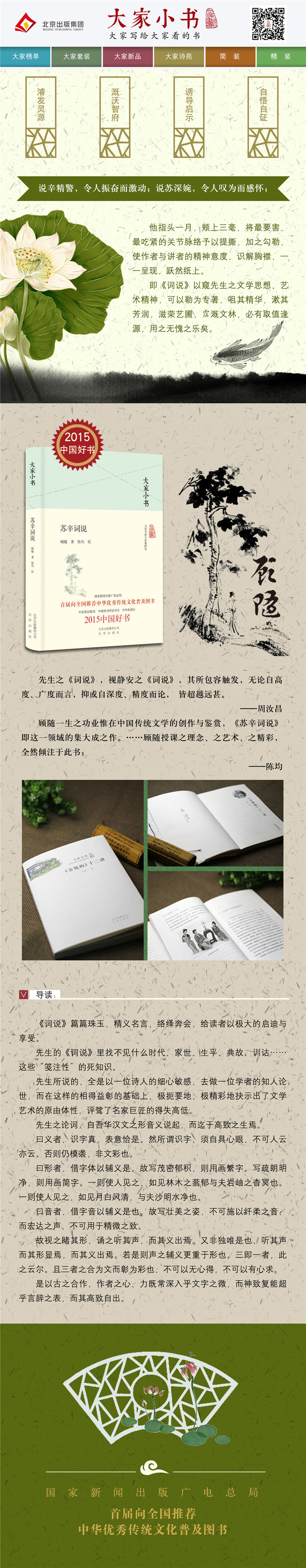 本书由顾随弟子周汝昌作序,是*次将顾随的《稼轩词说》和《东坡词说》合二为一,而顾随针对苏东坡和辛弃疾的词进行了见解独到的解说,说辛精警,令人振奋而激动,说苏深婉,令人叹喟而感怀,具有浓厚的独创特色与重要的代表意义,使本书文章篇篇珠玉,精义名言,络绎奔会,给读者带来极大的启迪与享受。顾随一生之功业几乎全在中国传统文学(诗词曲)的创作与鉴赏,本书即是这一领域的集大成之作。在中国古典诗学和现代文艺思想里,本书被誉为自王静安《人间词话》之后*为精深、程度*,亦极特别的一部名著。