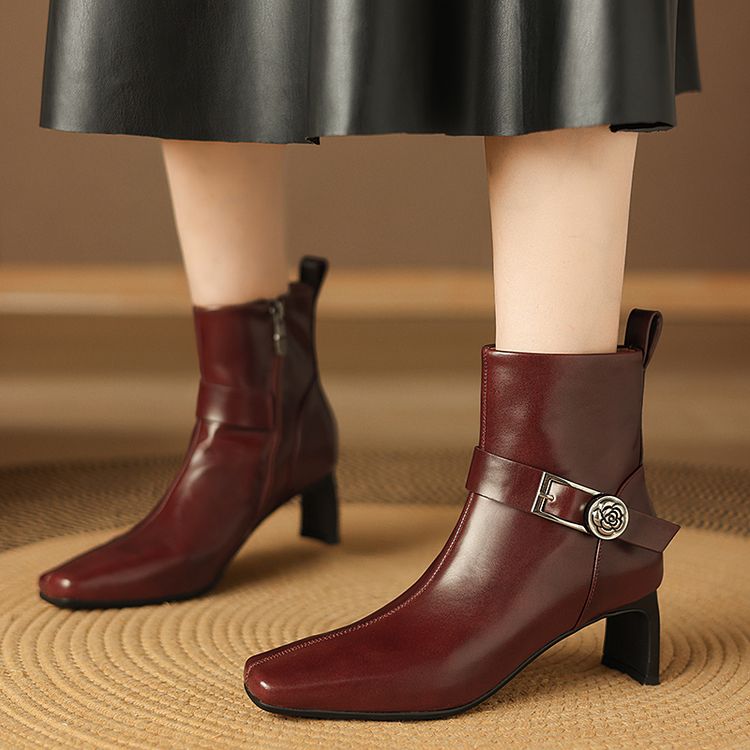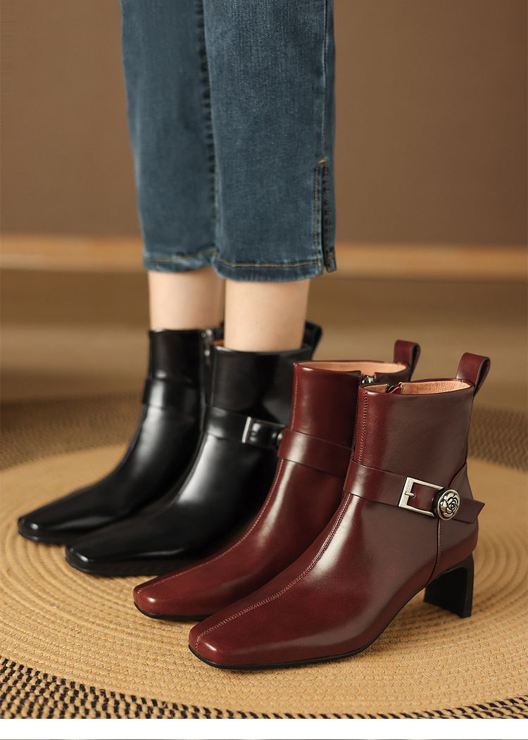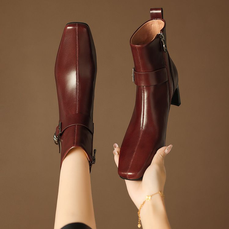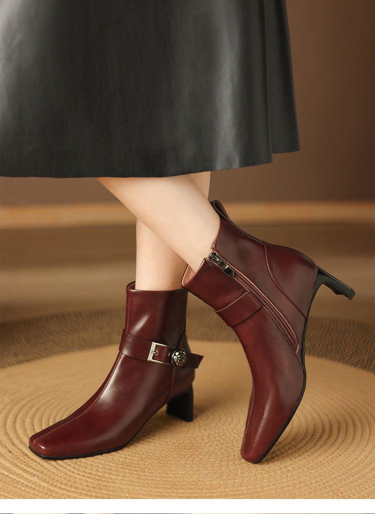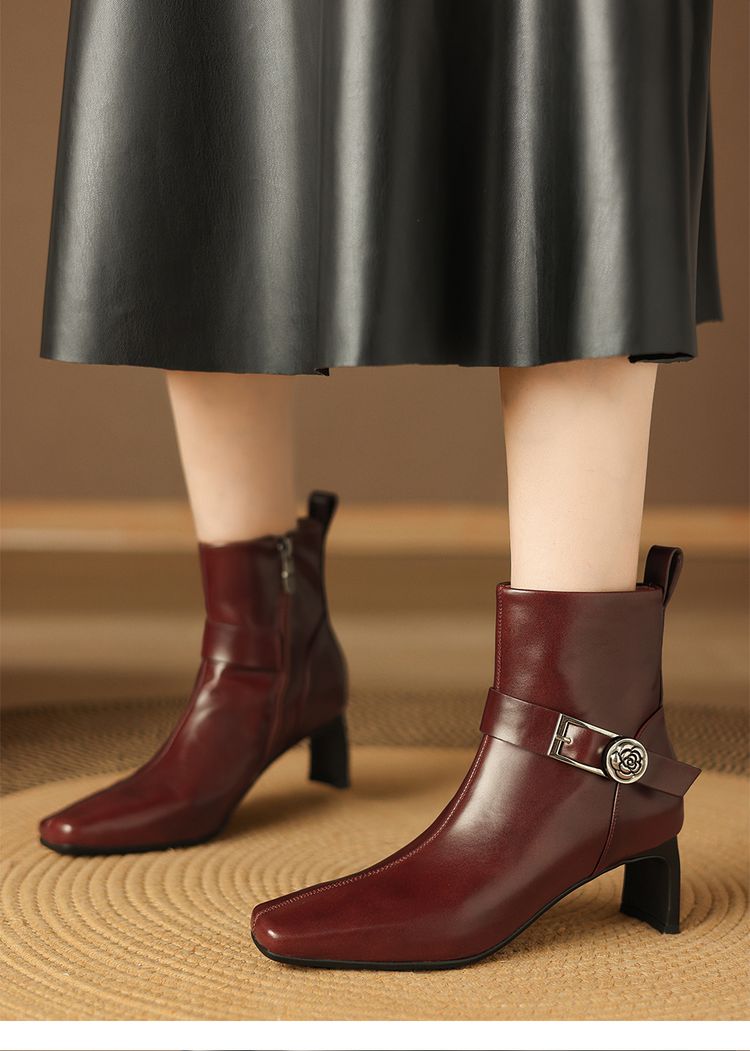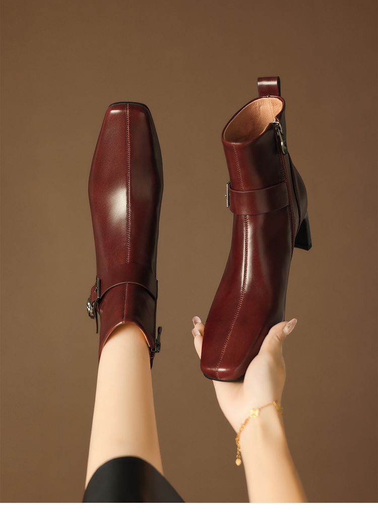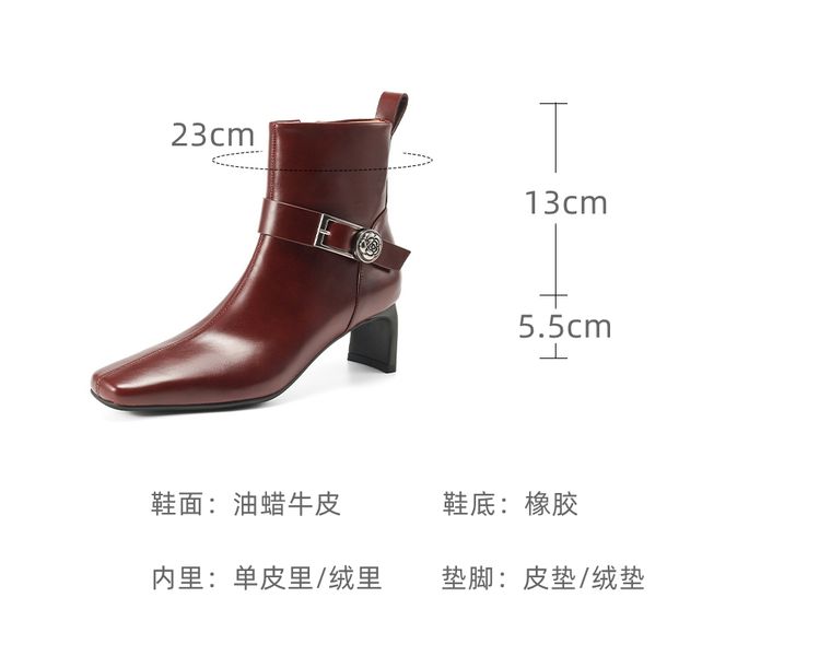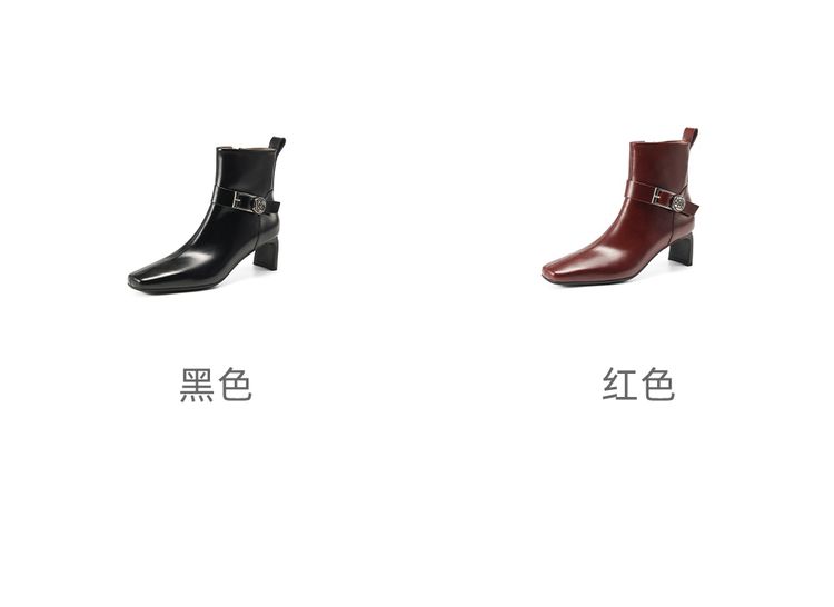 【预售5天】秋冬牛皮红色复古马丁靴英伦风方头粗跟显瘦短靴DTN&128-3