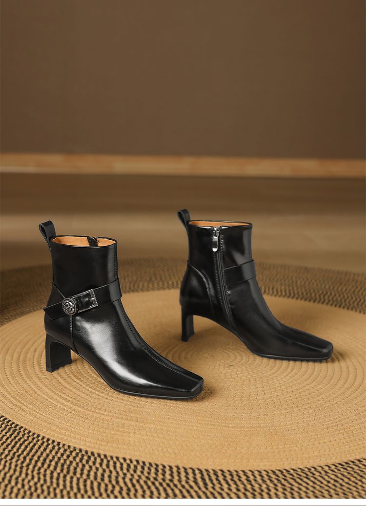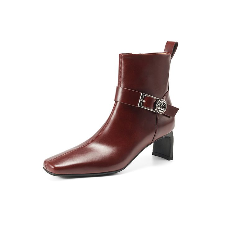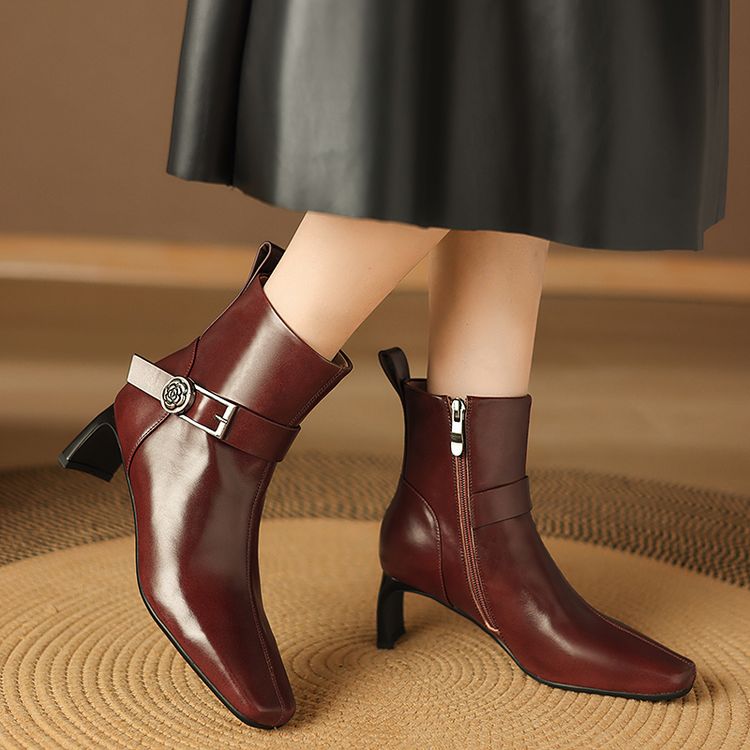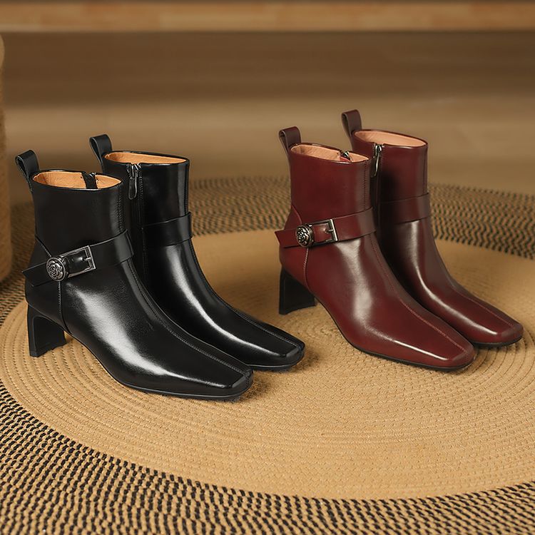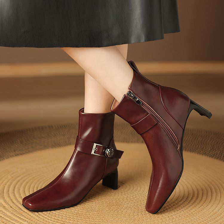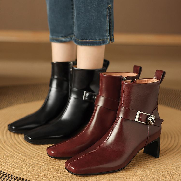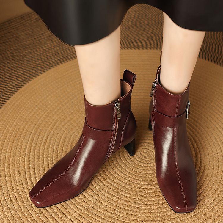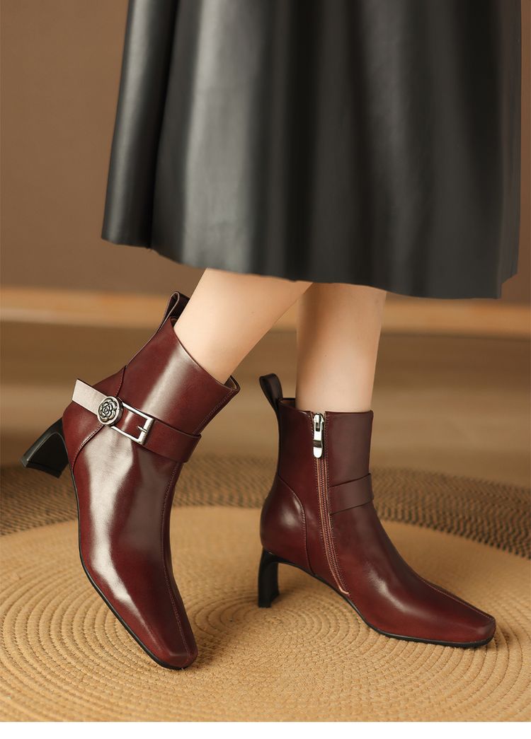 【预售5天】秋冬牛皮红色复古马丁靴英伦风方头粗跟显瘦短靴DTN&128-3