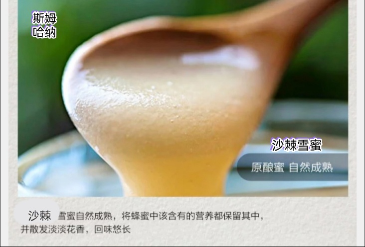新疆纯正沙棘雪蜜 ,呈现琥珀色或乳白色,低温条件下呈现乳白色凝脂状或白色结晶,回味甘甜,营养价值高,富含葡萄糖和果糖,还有多种维生素,促进人体生长和活力的生物素等,是蜂蜜中难得的佳品。