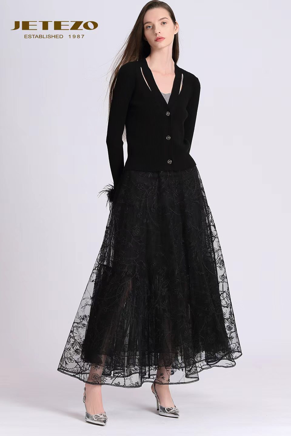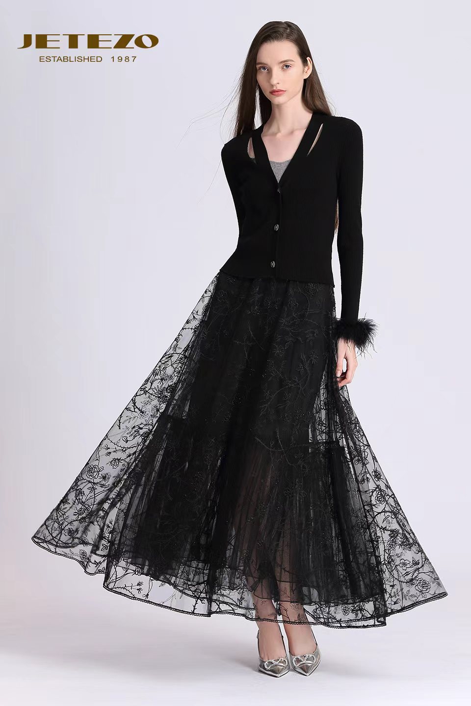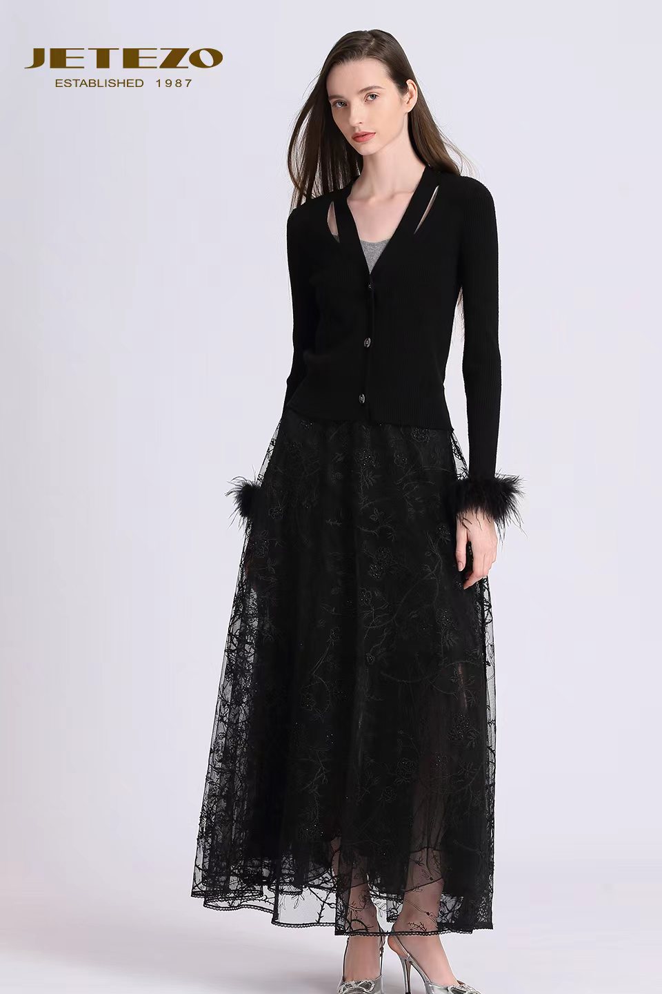 裘堤婼JETEZO精致羽毛袖V领针织BD15255A1