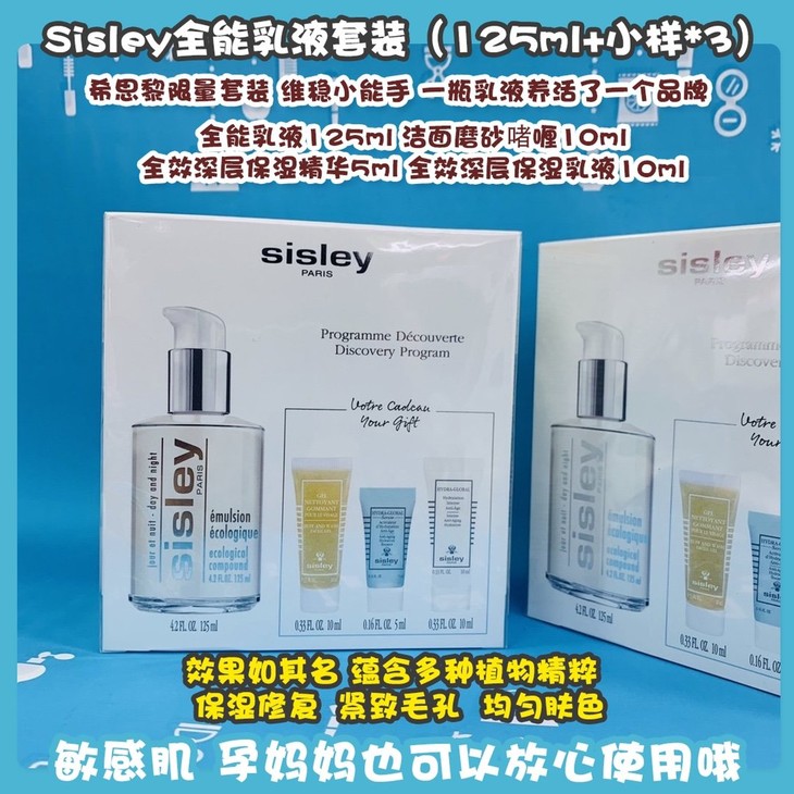 Sisley全能乳液套装(125ml+小样*3)👍希思黎限量套装。维稳小能手,一瓶乳液养活了一个品牌👏!效果如其名,蕴含多种植物精粹,☑️保湿修复、☑️紧致毛孔、☑️均匀肤色。日间维护肌肤健康活力,夜间强化自然防御系统。补充滋养肌肤所缺少的营养,全面平衡补给,让肌肤气色逐渐变得透亮有光泽✨,质地滋润却不油,种草过就会知道有多好用!成分温和适合所有肤质✅,敏感肌、孕妈妈也可以放心使用哦~套装包括:全能乳液125ml➕洁面磨砂啫喱10ml➕全效深层保湿精华5ml➕全效深层保湿乳液10ml。