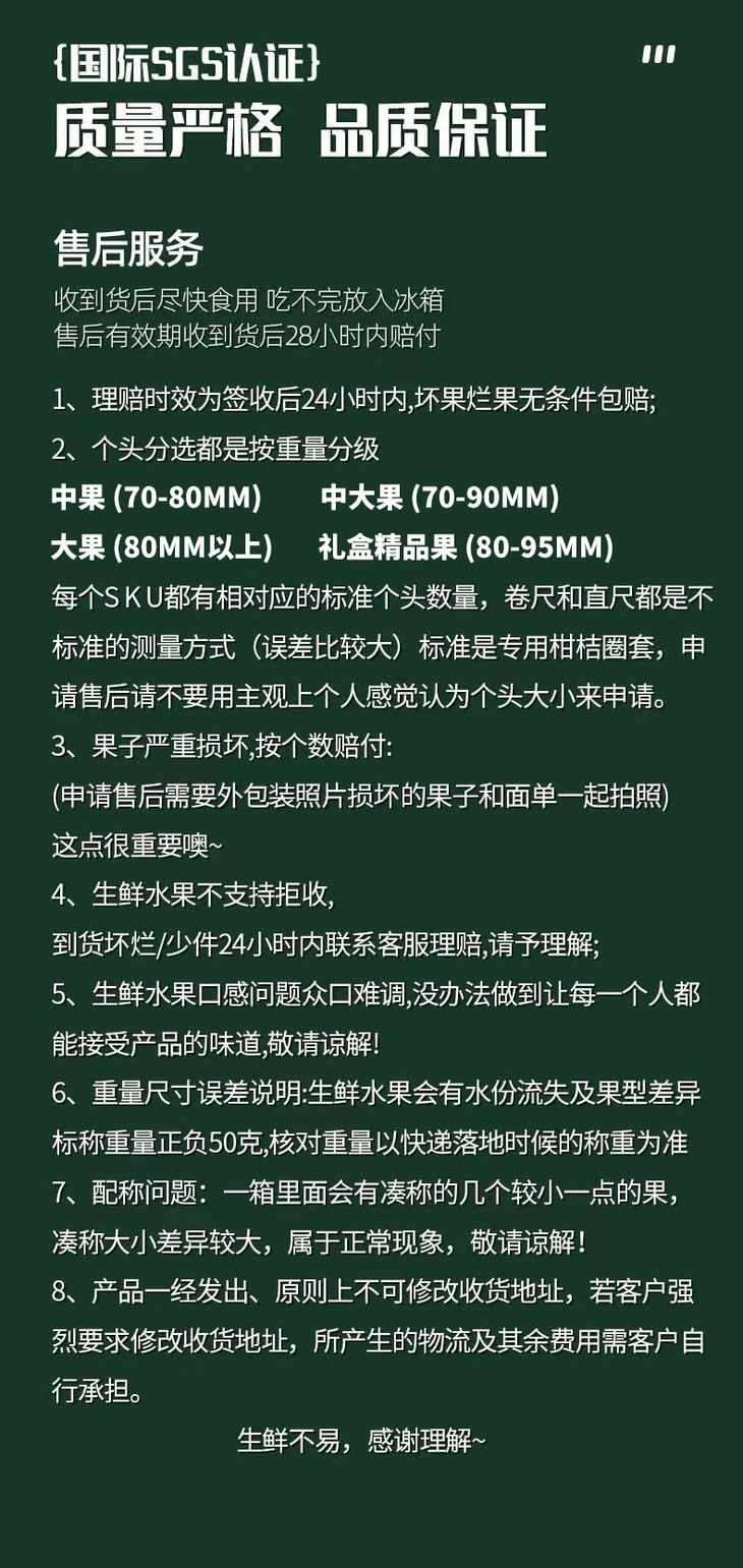 ③生鲜果蔬产品不支持退货退款,收到货后有任何质量问题,在24小时之内拍照联系客服进行售后理赔(提供快递单+包装箱+坏果图),售后方式按比例赔付(赔付金额=付款金额/产品总个数*坏果个数)。感谢您的信任,祝您购物愉快!